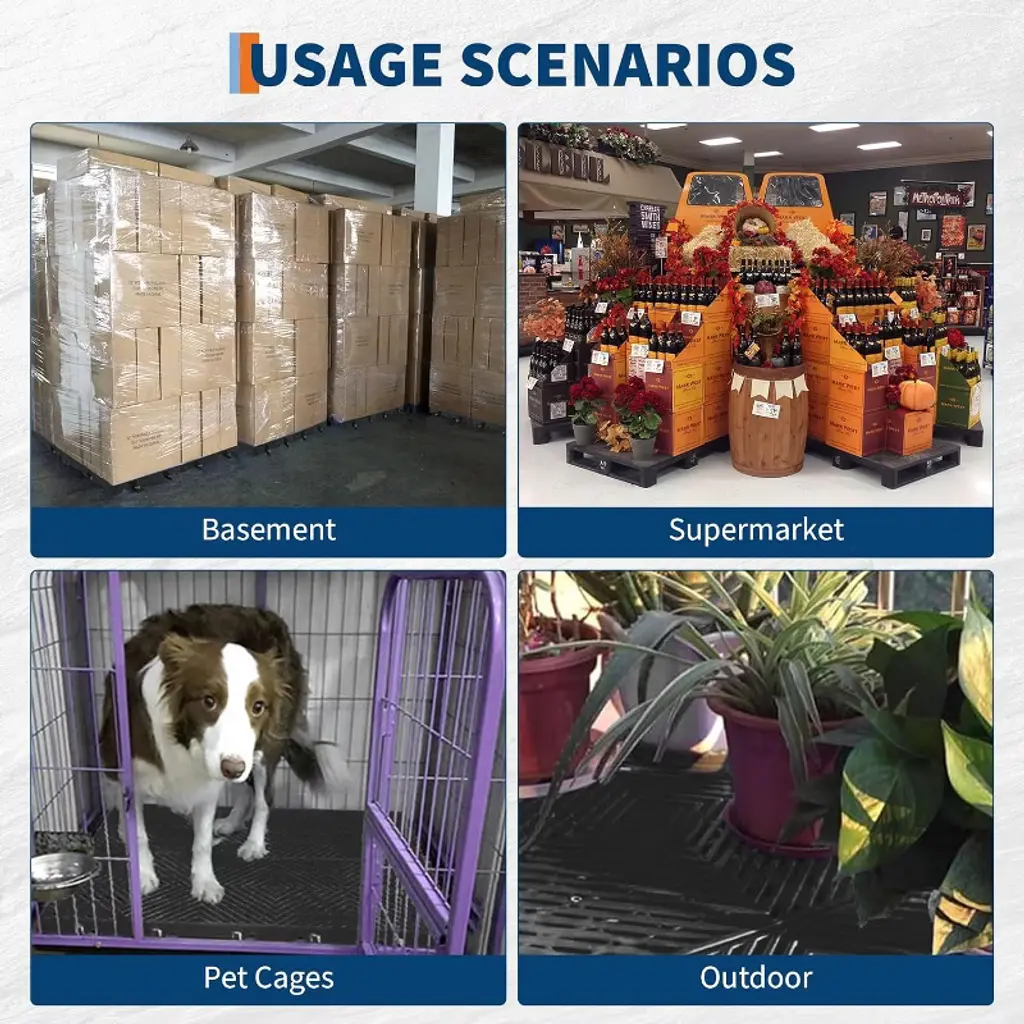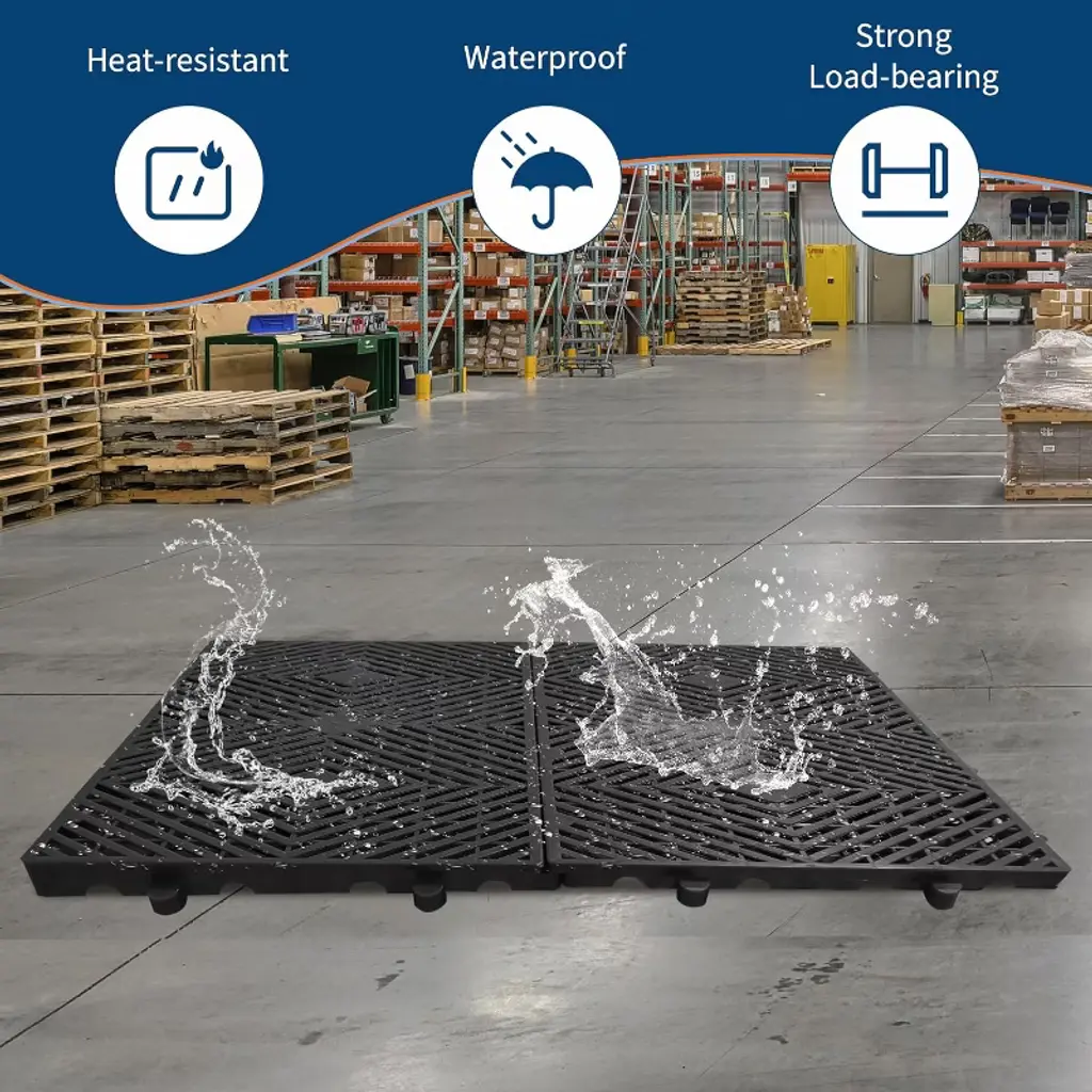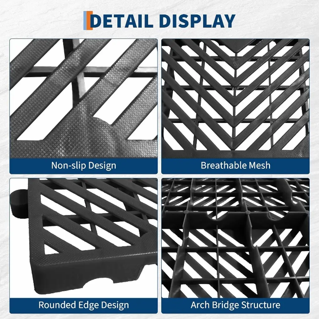Our plastic pallets offer a lightweight, durable, and versatile solution for various settings. Designed with a grid surface for ventilation and waterproofing, they are easy to clean and reusable. The modular design allows 12 pallets (measuring 11.8 x 23.6 x 1.18 inches) to connect and form a large storage mat, saving space. Made from high-quality HDPE, they are impact-resistant, strong, and provide anti-static and anti-dust protection. The non-slip texture ensures safe handling and prevents goods from sliding during transportation.