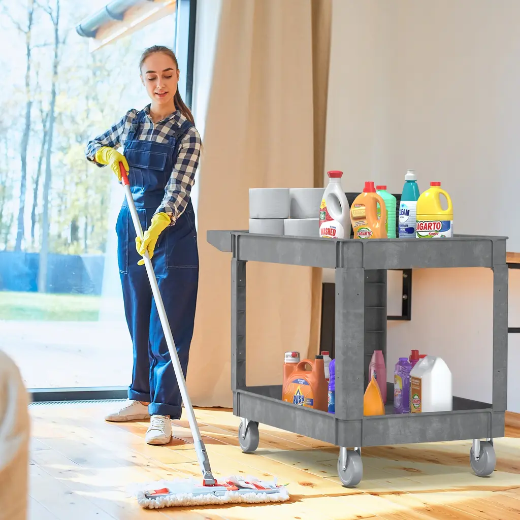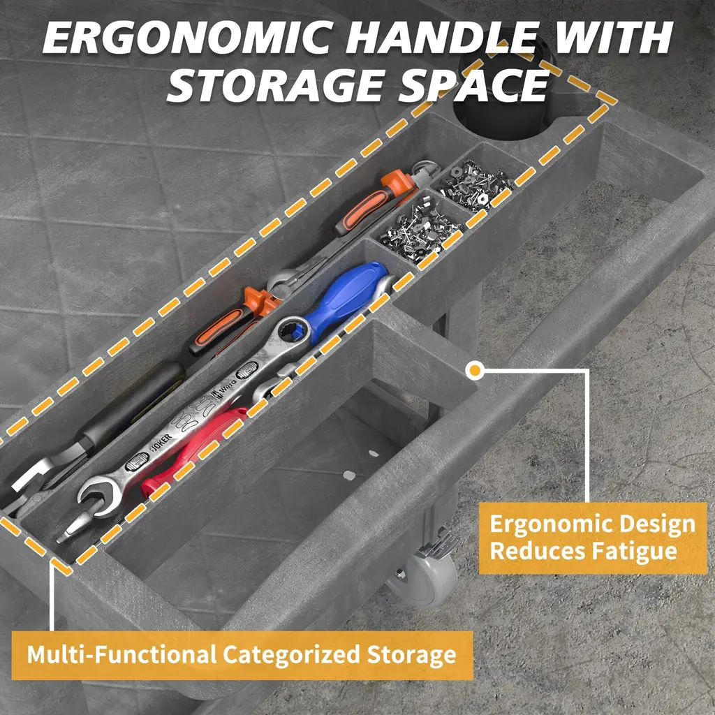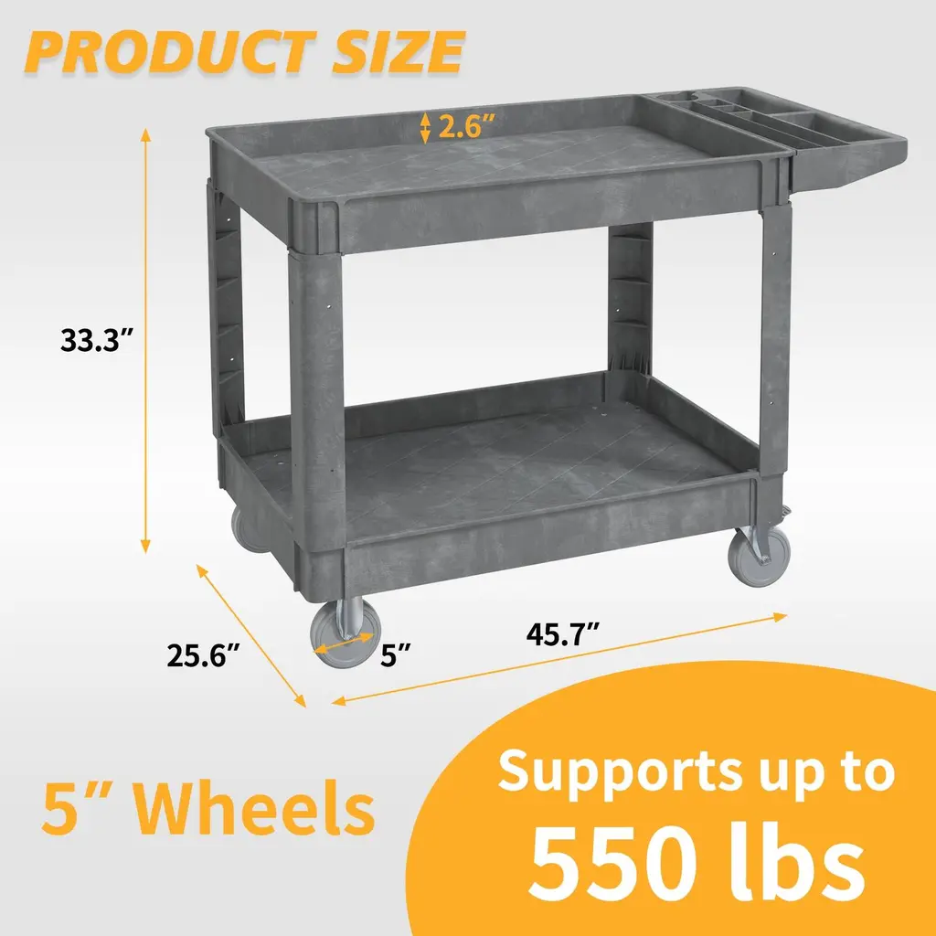 [Quality Material]:Who doesn't love a product that is built to last? Made of high-strength polypropylene with easy-to-maintain clean surfaces and rust, water and corrosion resistance, the carts are sturdy and warp-free. The upper and lower trays have a weight capacity of up to 550 pounds, making them suitable for long term, intense work use.[Lockable Universal Wheel]:The tool trolley contains 4 universal wheels, two of which have locking systems. It's easy to maneuver even in tight workspaces, and the locking casters help keep the cart in place when you're stationary. The rollers made of PVC can provide you with a quiet working environment and protect your floor from scratches.