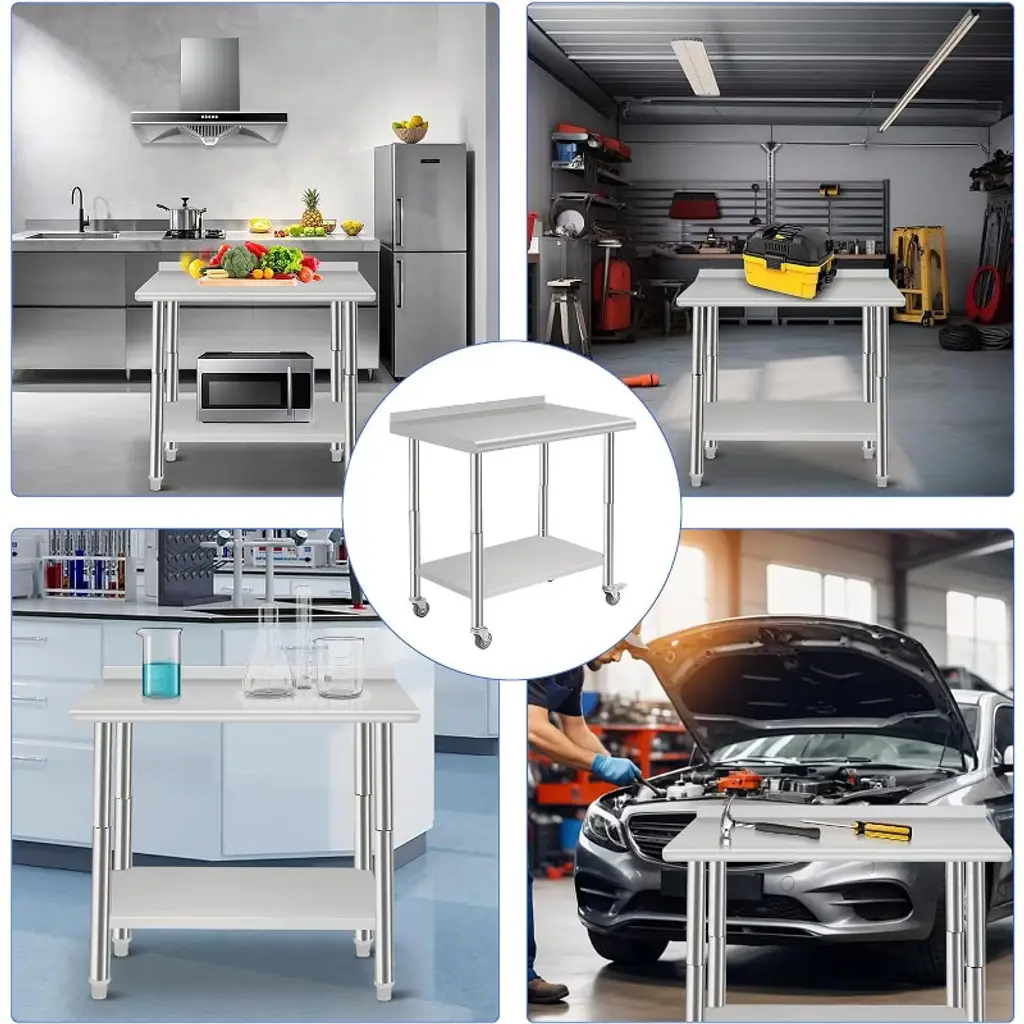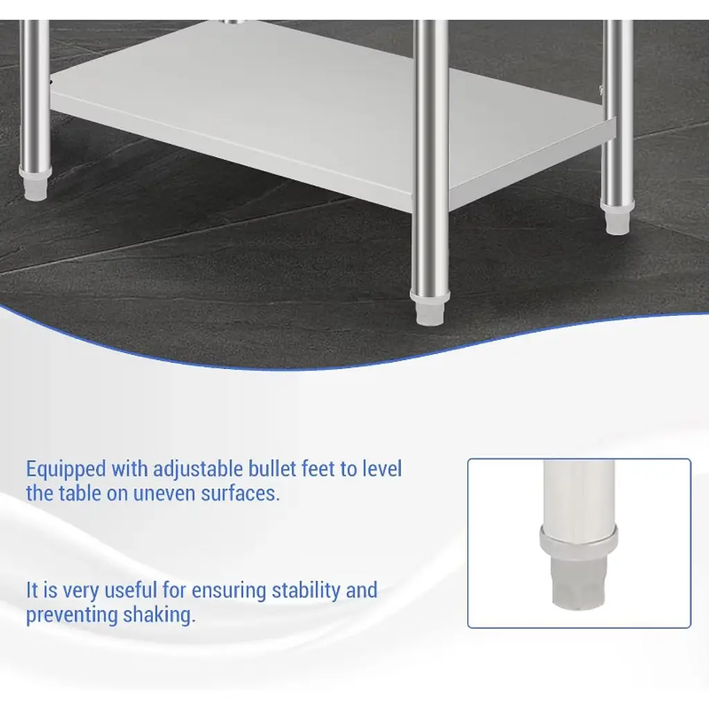 Introducing our Stainless Steel Kitchen Worktable—an indispensable addition for culinary enthusiasts seeking both functionality and style! This sleek and modern table enhances any kitchen space while providing the durability needed for heavy-duty tasks. Crafted from rust-resistant stainless steel, it is built to withstand the rigors of both home and professional kitchens. With a generous surface area, this versatile worktable is perfect for food preparation, cooking, and plating. Whether you're a home cook or a culinary professional, elevate your cooking experience with this elegant yet practical solution that meets all your kitchen needs. Product Highlights: Durable Stainless Steel: Offers exceptional rust resistance and longevity for lasting use, ensuring your worktable remains in excellent condition. Adjustable Open Shelves: Features flexible storage options that can be tailored to suit your specific needs, helping you keep your workspace organized. Easy Mobility: Fitted with high-quality casters and a safety braking system, this table allows for secure and effortless movement, making it convenient to reposition as needed. Simple Assembly: Arrives with all necessary components and a clear assembly manual, allowing for hassle-free setup and immediate use. Versatile Design: Ideal for various environments, this worktable fits seamlessly into home kitchens, commercial kitchens, garages, workshops, and more. Specifications: Material: Stainless Steel Color: Silver Important Notes: Before installation, please verify that all accessories are complete as per the manual. If any items are missing, contact customer service immediately for assistance. After assembling the prep table, wipe down the frame with a damp cloth to ensure it is clean and ready for use. Transform your kitchen experience with our Stainless Steel Kitchen Worktable—a perfect blend of elegance, durability, and versatility!