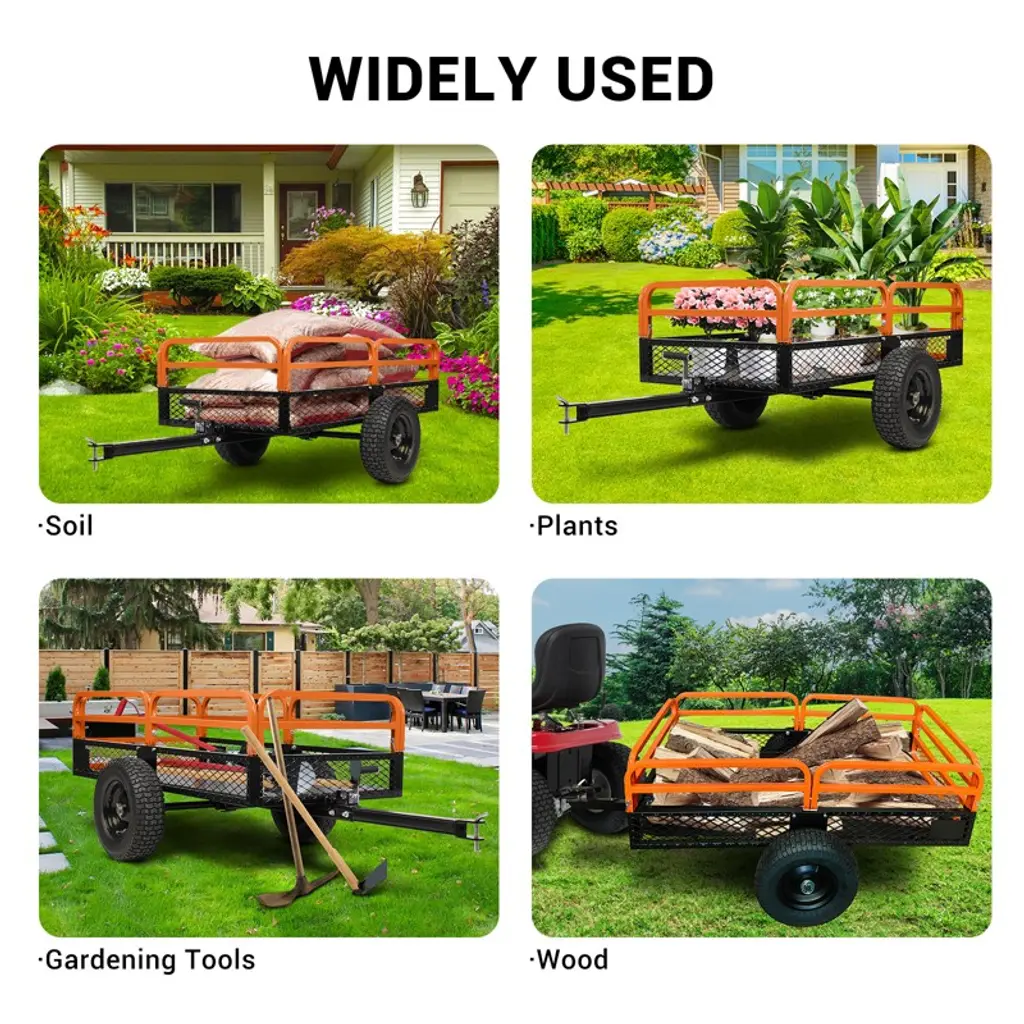 Heavy Duty Steel ATV Trailer Tow Behind Dump CartSpecification:Capacity: 15 cu.ftWeight Capacity: 750 IbsWheel Size: 16 × 4 inches / 16 × 6.5 inchesProduct Size: 78.7 × 42.1 × 29.9 inchesKey Features:- Sturdy powder-coated steel frame resists rust and ensures durability.- Quick conversion into a flatbed with removable side panels for flexibility.- 15 cu. ft. capacity accommodates all your hauling requirements.- Transport heavy materials such as wood, stones, and bricks effortlessly.- Convenient unloading with hand pull and foot pedal dumping options.- Large pneumatic tires designed for optimal performance on any terrain.- Attach the garden trailer hitch to your tractors, lawnmowers, ATVs, and UTVs with ease.What's in the Box:1 x Heavy-Duty Steel Dump Cart1 x Hardware Pack1 x Assembly ManualImportant Note:Please follow the installation instructions step by step to ensure a smooth assembly of your lawn mower trailer. Before you begin, make sure you have all the necessary parts for your garden trailer on hand.Please do not tighten the screws up too much, just to 80% before you finish to make the installation go on successfully.