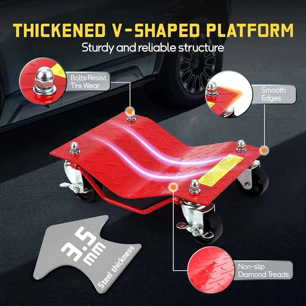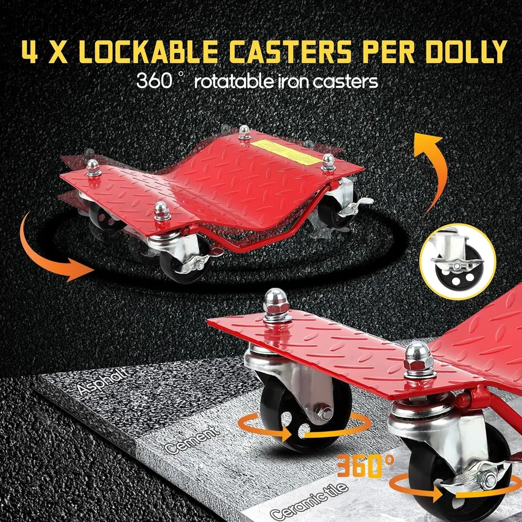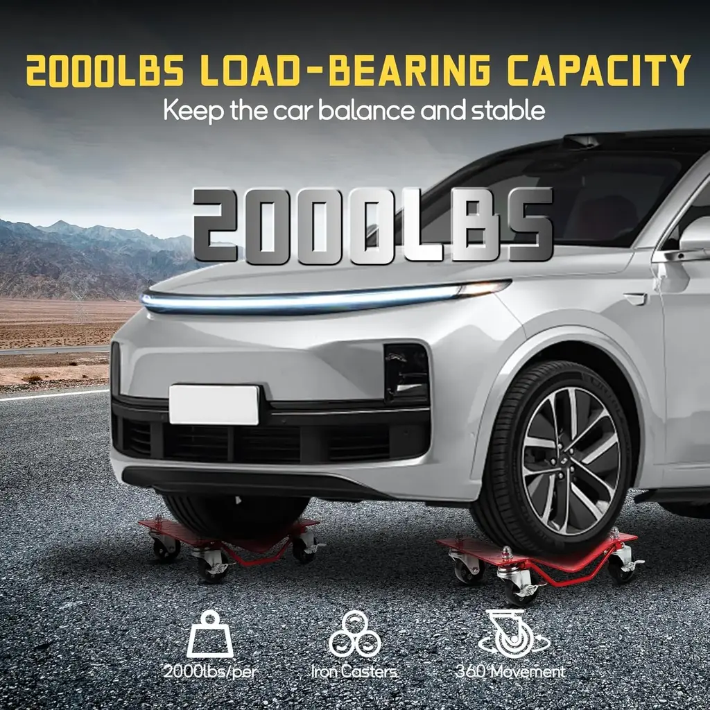 1. Effortlessly Glide Vehicles with Smooth Steel Casters: Experience seamless movement with 4 heavy-duty rotating wheels, designed to roll smoothly on concrete, garage floors, or workshops, saving you time and effort.2. Quick and Easy Setup in Just 10 Minutes!: Simplify your workflow with a hassle-free installation process. Just lift the tire with a car jack, slide the wheel dolly underneath, and secure it. No complex tools needed—perfect for DIY enthusiasts and mechanics alike.3. Enhanced Safety & Stability with Curved Steel Base and Anti-Slip Rails: The upgraded curved design ensures tires are locked securely, while anti-slip rails provide stability during car moving or maintenance, eliminating concerns about sudden shifts.4. Versatile for All Vehicle Types: Fits Sedans, SUVs, and ATVs: This extra-wide dolly set accommodates various vehicle needs, from tire changes to storage shifts and repairs, making it an ideal choice for a wide range of vehicles.5. Heavy-Duty Construction: Built to withstand extreme loads, each car wheel dolly supports up to 2000 lbs or 2500 lbs with thickened steel panels, ensuring durability and reliability for SUVs, trucks, and heavy vehicles.