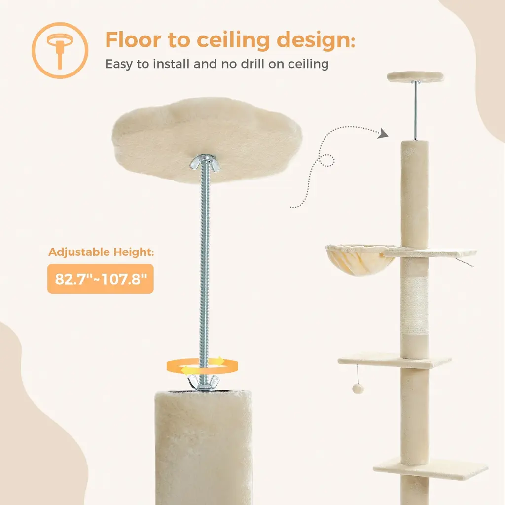 Introducing our Cat Tree - the ultimate indoor playground for your feline companions. With its adjustable height, sturdy construction, and enticing features, this cat climbing tower is perfect for cats of all sizes and ages. Floor-to-Ceiling Cat Playground: Create a vertical paradise for your indoor cat with our cat tree that reaches from the floor to the ceiling. Let your feline friend explore and play at different heights, ensuring endless hours of entertainment. Adjustable Height: With a height range of 83'' to 108'', our cat tower is designed to fit various room sizes and ceiling heights. Easily customize the height to create the perfect playground for your cat. Sturdy and Durable: Crafted from high-quality materials including sturdy boards, durable paper tubes, plush fabric, and sisal rope, our cat climbing tower is built to withstand the playful antics of your furry friend. It provides a stable and safe environment for climbing, scratching, and relaxing. 5-Tier Design: This cat tree features five levels, providing ample space for multiple cats to perch, explore, and nap. Each tier is equipped with a cozy cat condo, scratching posts, and a cat ladder, offering a variety of activities to keep your cats engaged and entertained. Easy Assembly: Our cat tree is easy to assemble with step-by-step instructions included. No special tools are required, and you'll have a fully functional cat playground ready in no time.