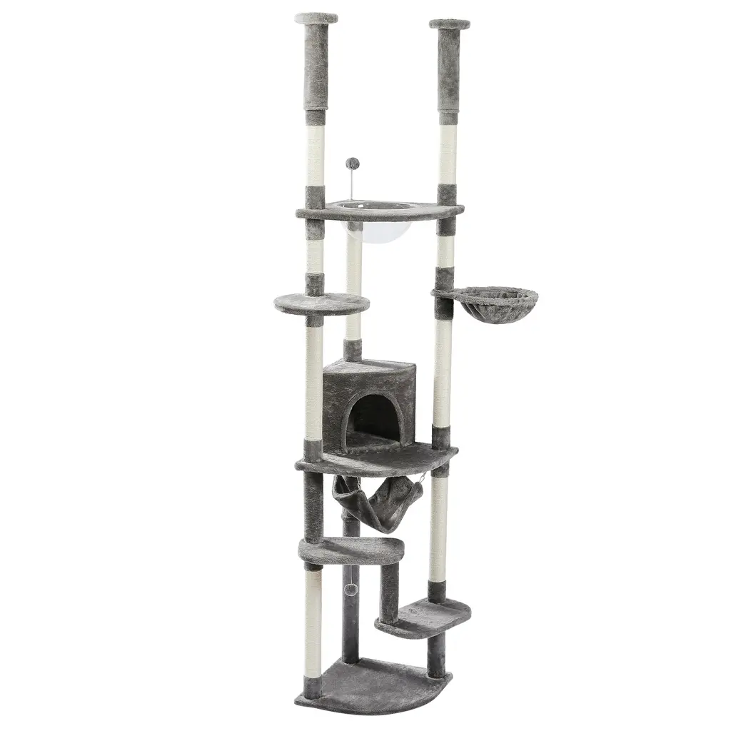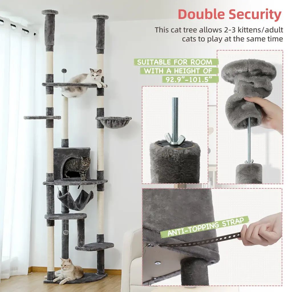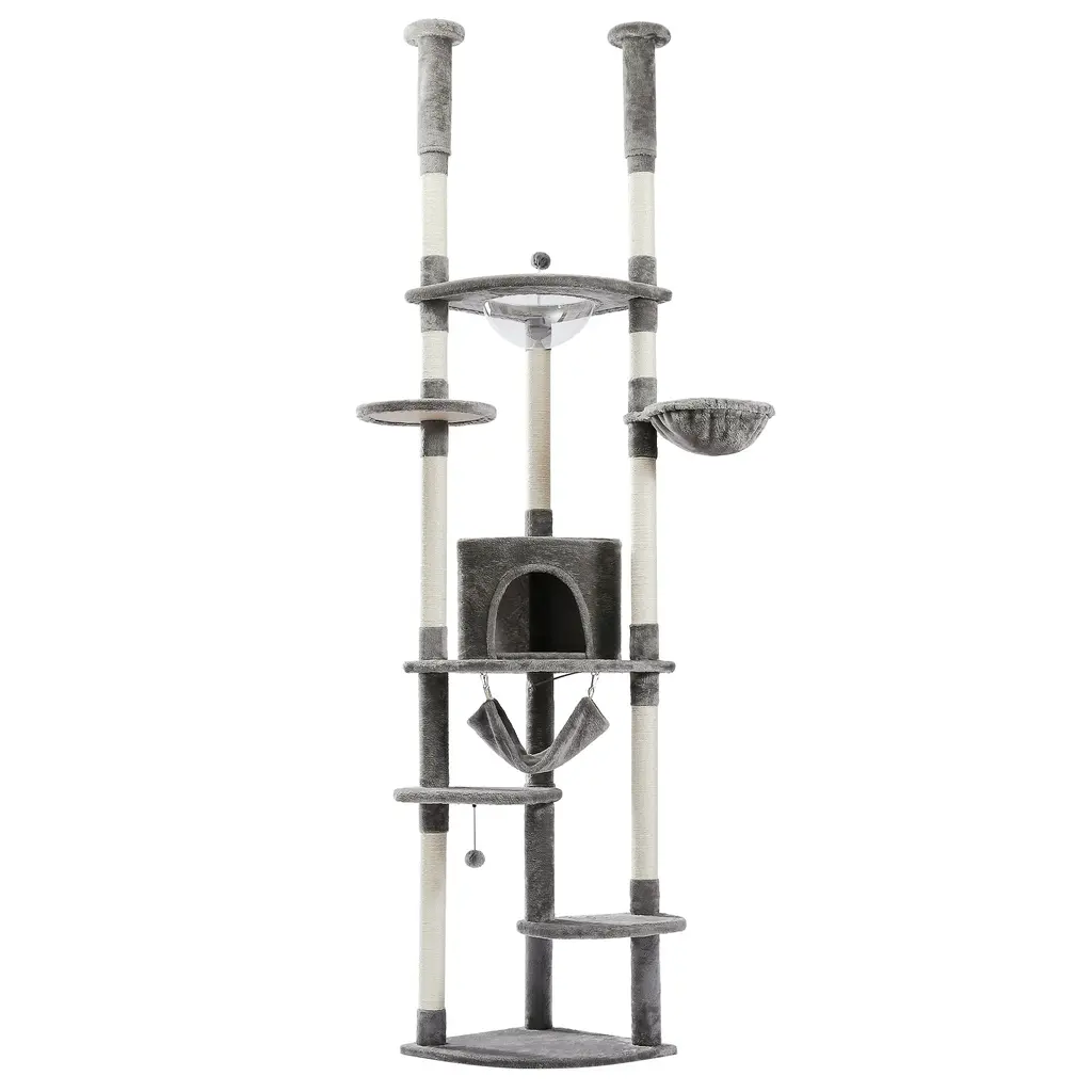 Sturdy & Safe: Unlike most floor-to-ceiling cat towers on the market, we designed the fan-shaped base with triangular columns for better balance and overall stability. Even better, it won't take up much space in your room. Feel free to put it in any corner. Consisting of reinforcement plates, sturdy posts, and additional anti-tipping straps, this cat furniture tree keeps your kitty safe as it bounces up and down.Prolong Pleasure: Sisal covered with different layers of scratch posts allows your feline to perform claw movements anytime, anywhere. Preserve their natural instinct to the maximum extent and prevent your furniture from scratching. Extra spring balls give your furry baby the thrill of further hunting. Stretch heights encourage them to climb and exercise, helping to lead a happy and healthy lifestyleIdeal seating area: Whether your cat needs a rest in the cradle, a private nap in the comfort of an apartment, a cuddle in a plush hammock, or just a break, they'll find their own exclusive area in no time. The elevated acrylic nest is not only a stylish bed for your furry friend, but also an observation deck with a great view from the window.Easy to assemble: Simple structure, with instructions and necessary hardware bags, Cat Tree Tower is very easy to install. In addition, all parts except the suspension ball are replaced free of charge within one year. If you have any questions during the purchase process, please do not hesitate to contact us