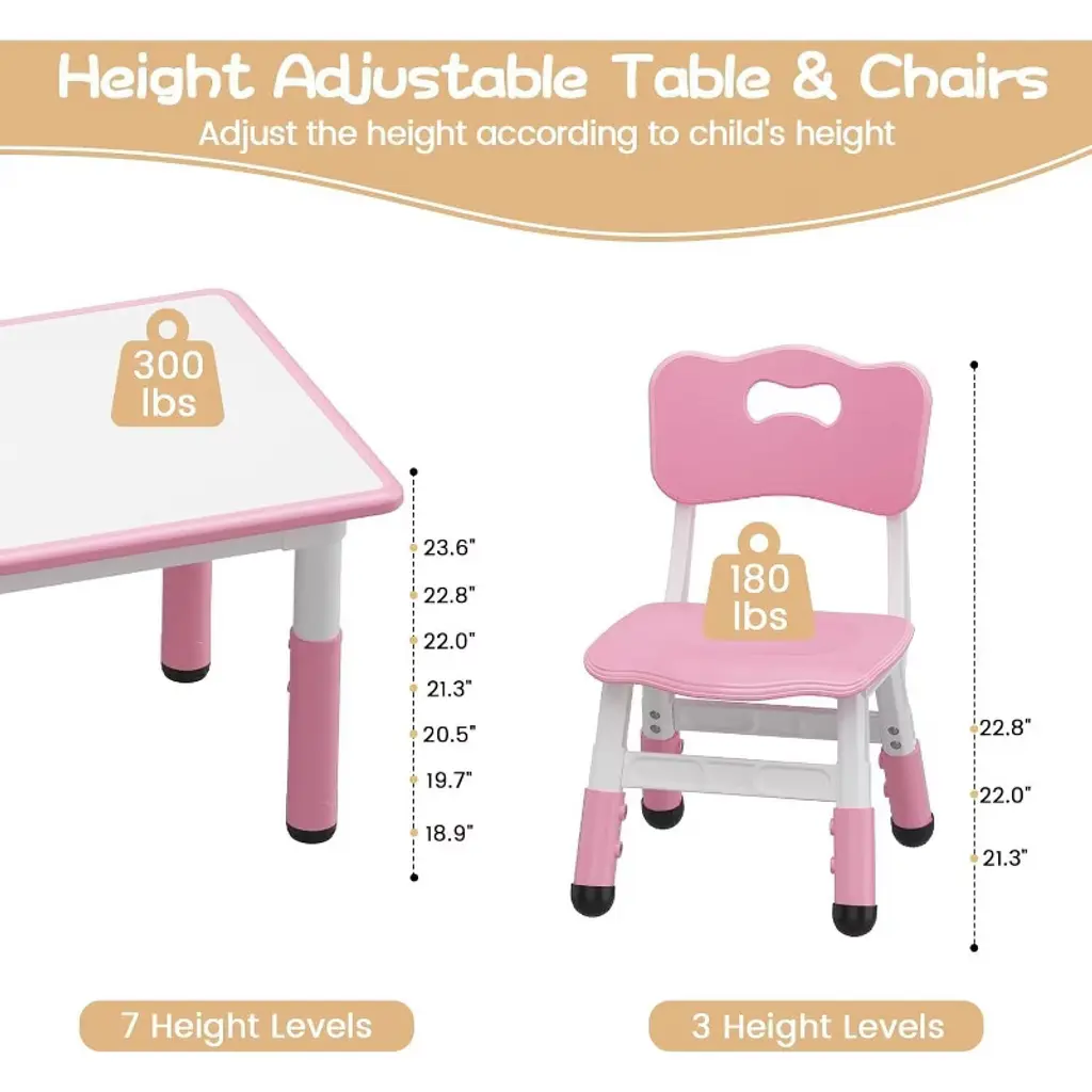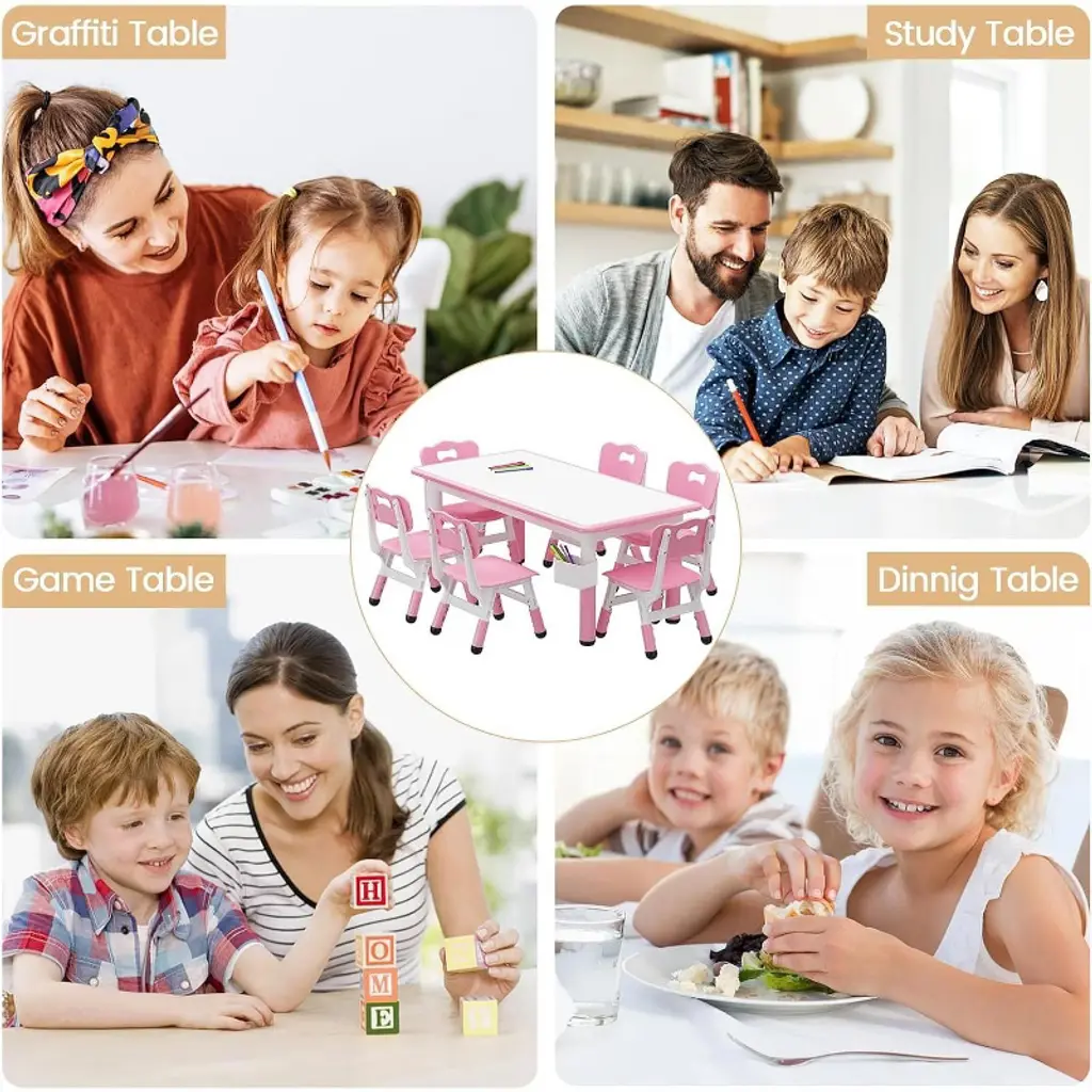 This kids table and 6 chairs set features height-adjustable components, making it suitable for children aged 3-8 years. The table offers 7 height levels ranging from 18.9" to 23.6" (48-60cm) and can support up to 300 lbs, while the chairs have 3 adjustable height options (10.6", 11.4", 12.2") with a maximum load capacity of 180 lbs, ensuring longevity as your child grows.The kids table and 6 chairs set includes a detachable storage box for pens and stationery, with a slightly raised edge to keep items secure. The chairs feature a curved backrest that supports your child's spine, promoting proper posture and comfort during use.
