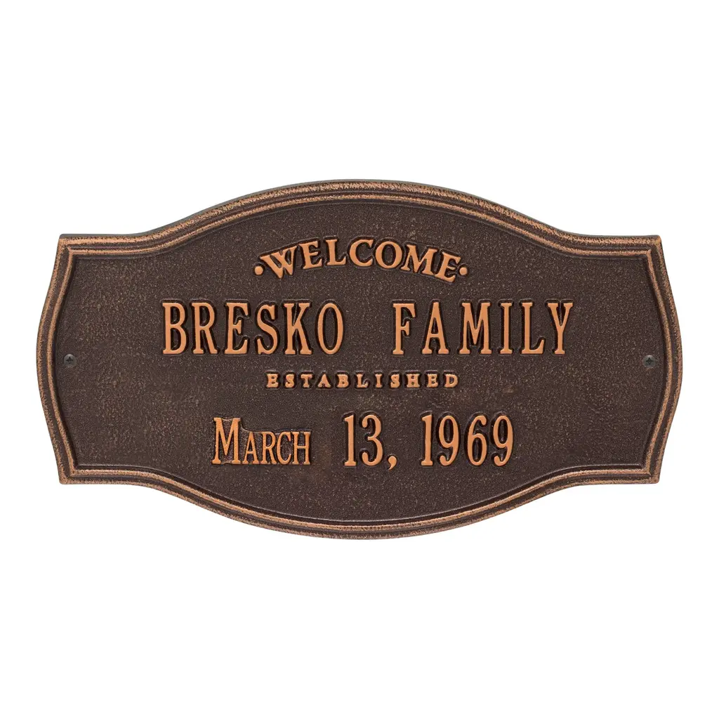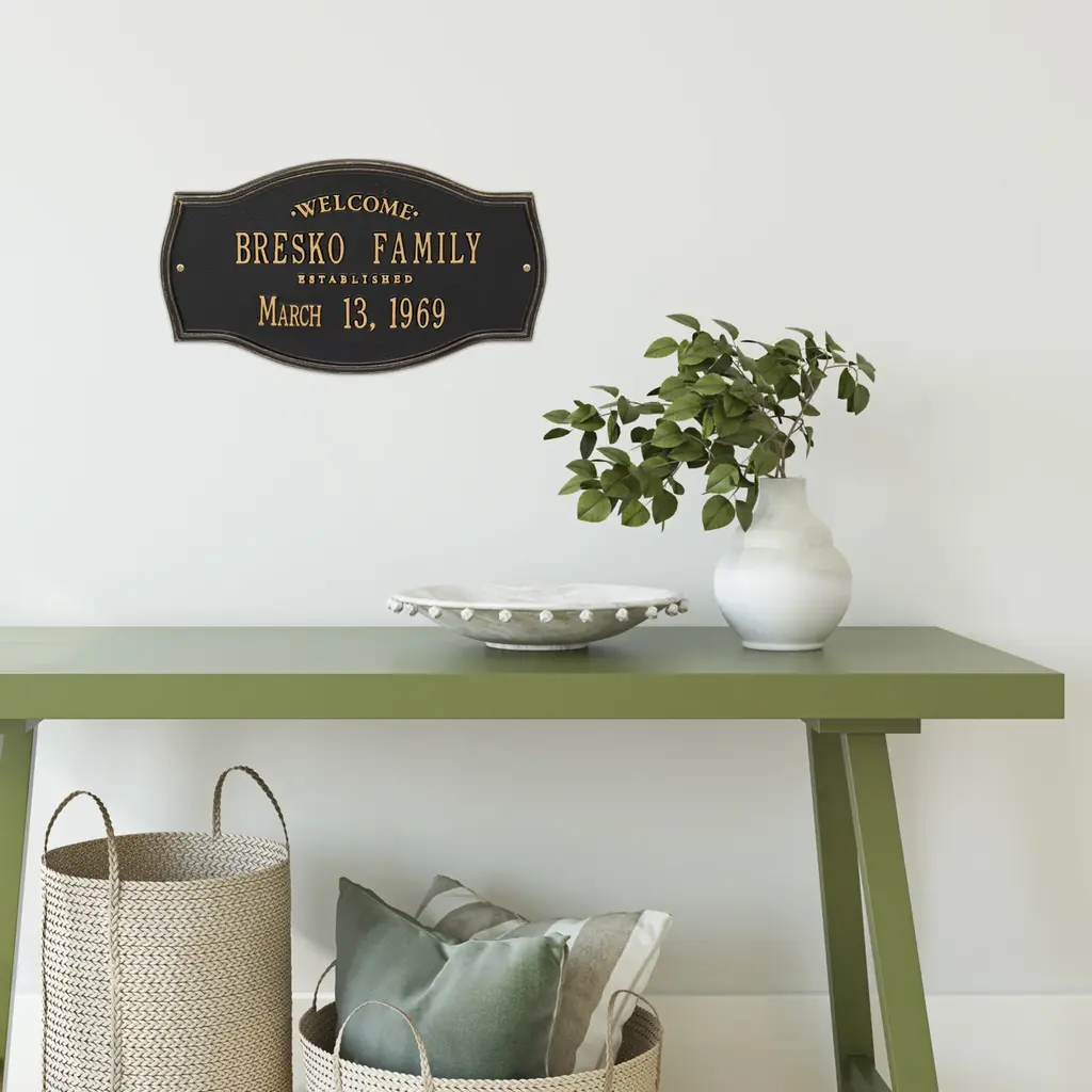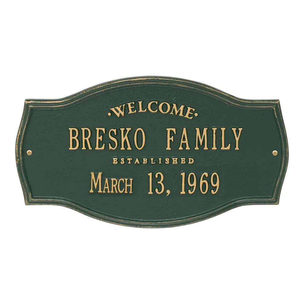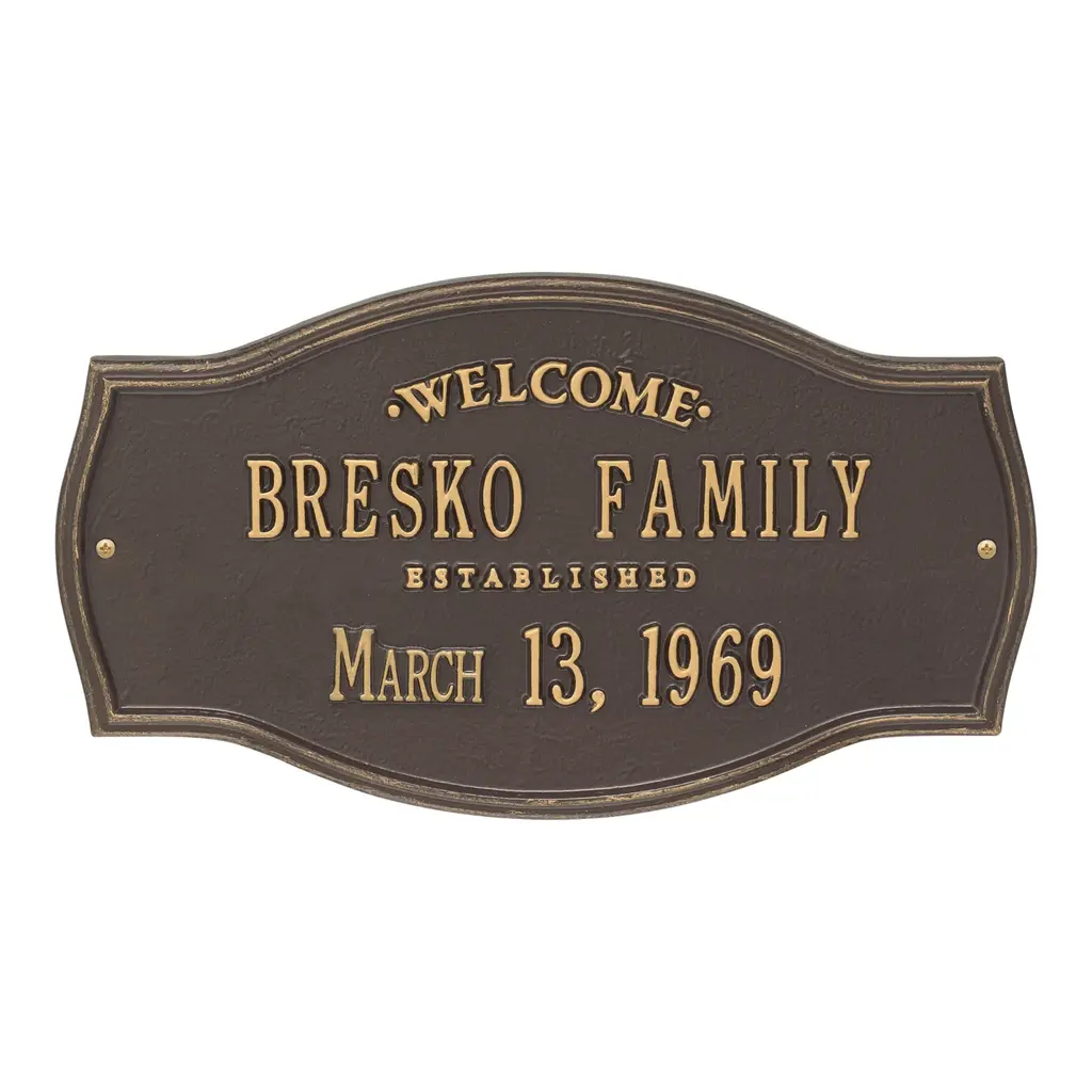 Patterned after plaques used on historic landmarks, our rust-free cast aluminum Heirloom Personalized Welcome Wall Plaque greets guests with a personalized message. This attractive, long-lasting wall plaque makes a thoughtful gift for housewarmings, weddings or anniversaries. Personalization makes it special, featuring two separate lines for name and date (up to 18 characters each line). Powder coat finish. Two all-weather brass screws for mounting included. Quality-made in USA. Please note: the words "Welcome" and "Established" are fixed; "Family" is not standard.