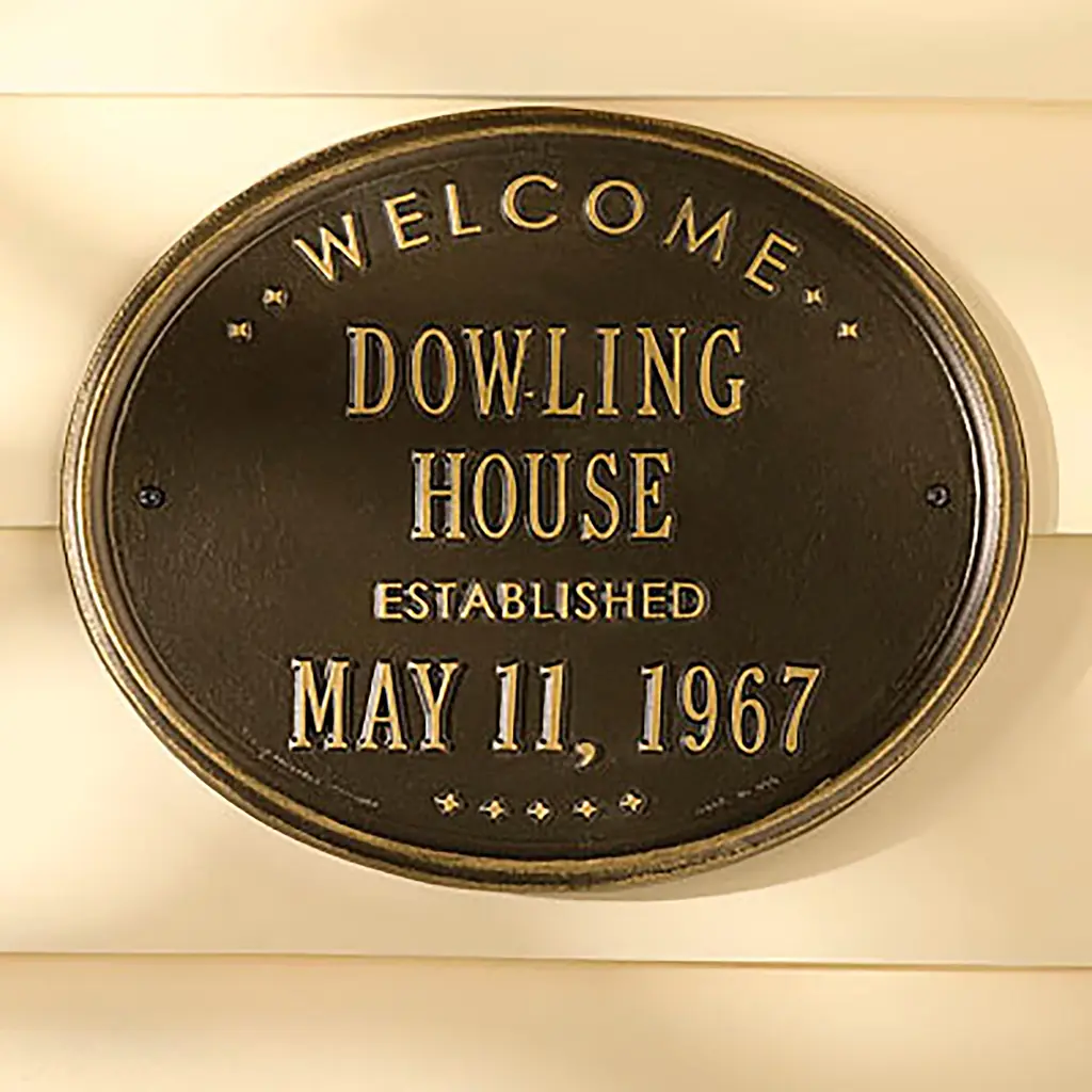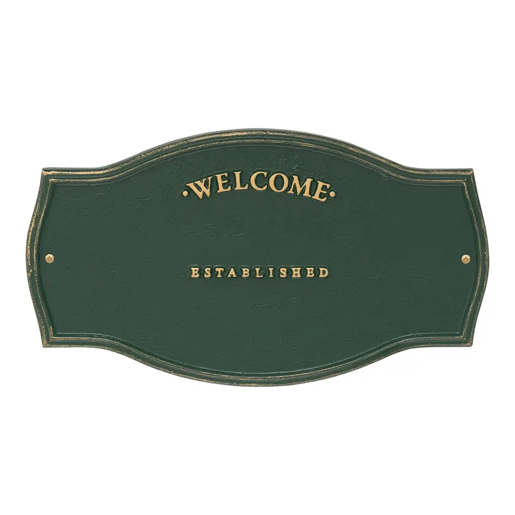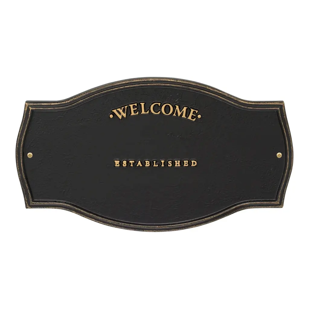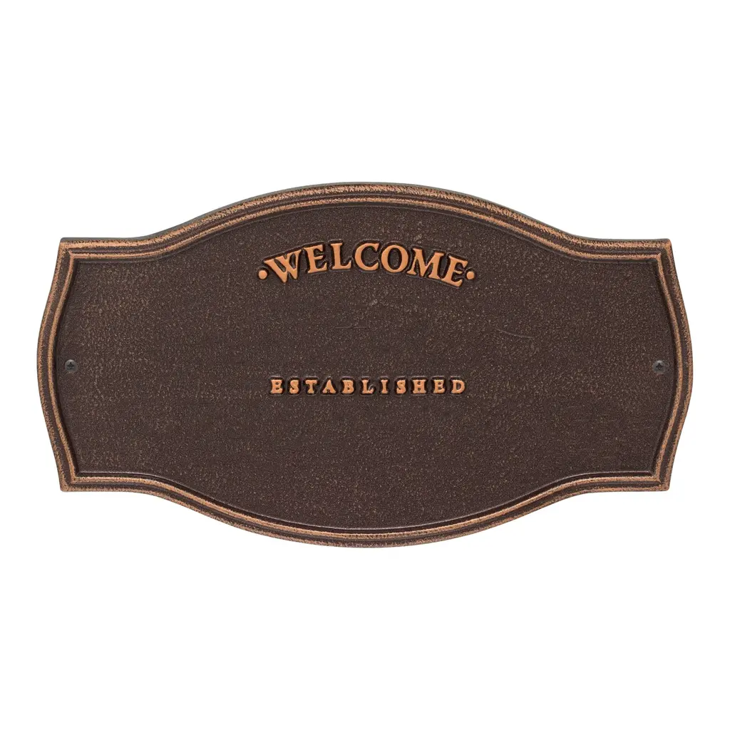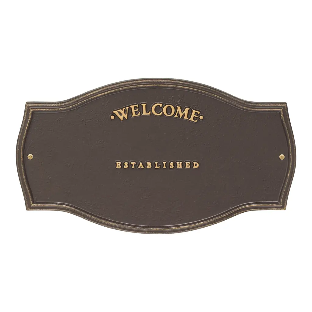Patterned after plaques used on historic landmarks, our rust-free cast aluminum Heirloom Personalized Welcome Wall Plaque greets guests with a personalized message. This attractive, long-lasting wall plaque makes a thoughtful gift for housewarmings, weddings or anniversaries. Personalization makes it special, featuring two separate lines for name and date (up to 18 characters each line). Powder coat finish. Two all-weather brass screws for mounting included. Quality-made in USA. Please note: the words "Welcome" and "Established" are fixed; "Family" is not standard.