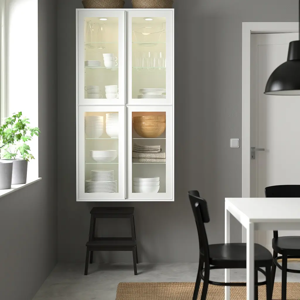 HEJSTA Glass door - white/clear glass 18x40 ". Glass doors add a personal and decorative touch to your kitchen. Display your favorite objects and add lighting to enhance the atmosphere. Integrated handle along the vertical side of the door creates a sleek and uniform expression.