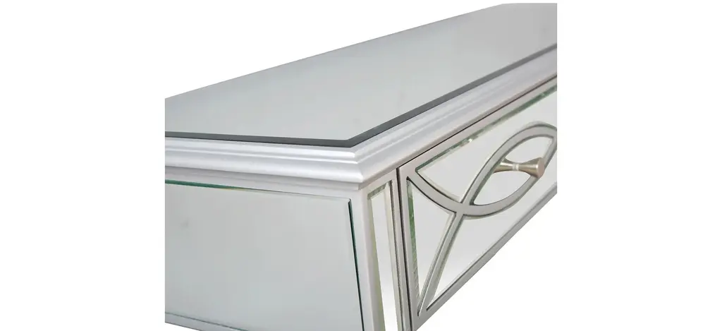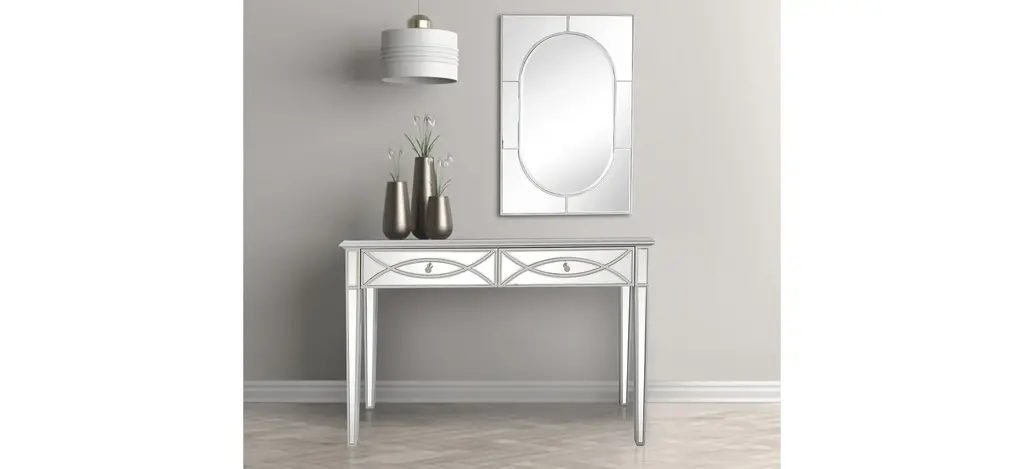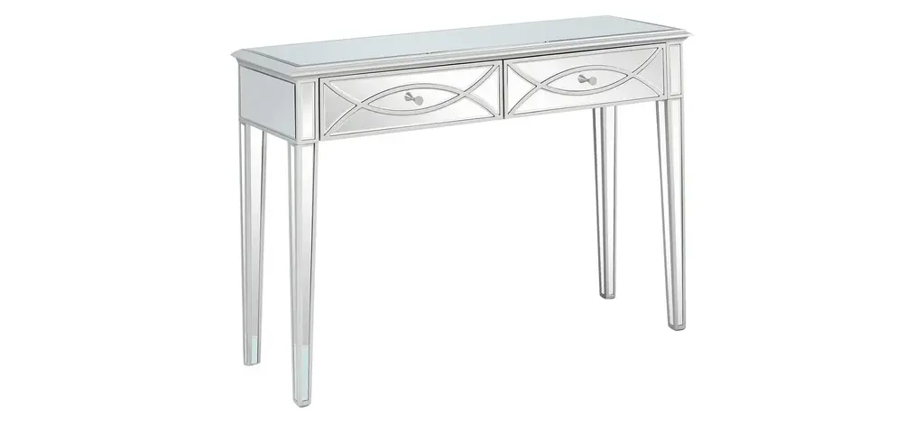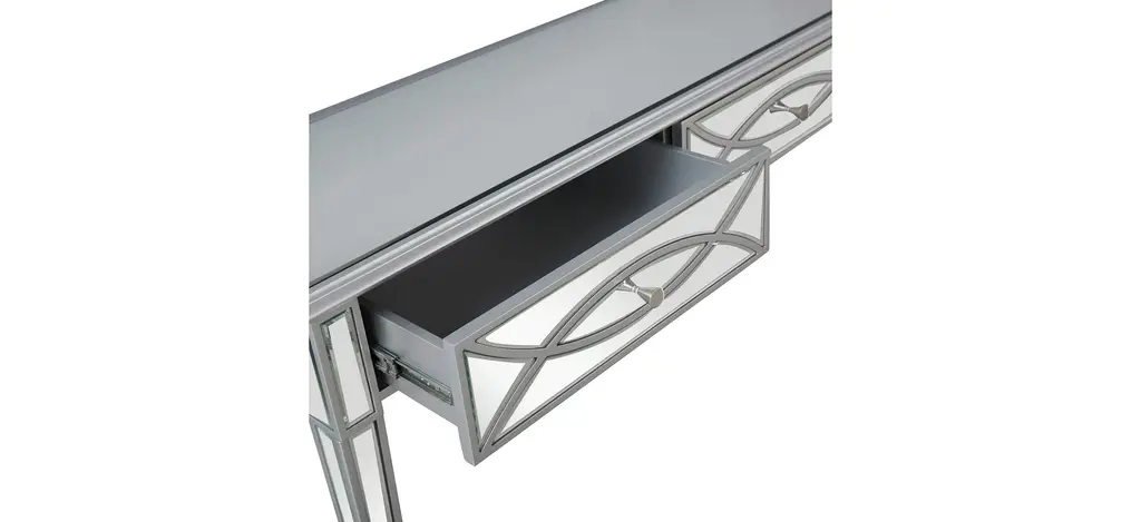 Brighten your foyer or hallway with the elegant Helena Mirror Console. Made from ultrafine mirror pieces, this console features a unique design on its drawers and an antique silver finishing, making it a great addition to any room. Hang a bold artwork or a contemporary mirror piece over it to create an eye-catching look.