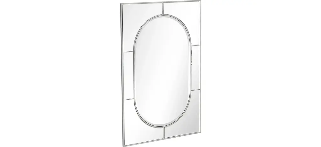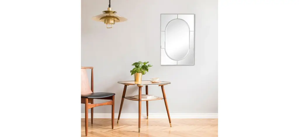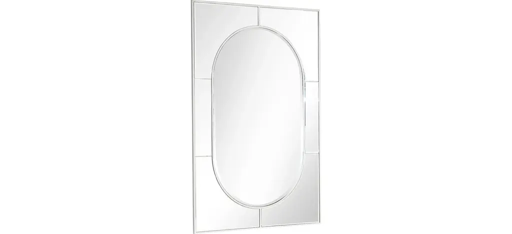 Make a statement with Helena Beveled Accent Mirror and add a unique flair into your nicely-decorated room. Its elongated oval shape perfectly complements the geometric pieces on its border and adds a shine factor to your bathroom, hallway, or entryway. With its antiqued silver frame, this beautifully-designed mirror is a perfect addition to any modern or traditional decor. Beveled 32 x 48 mirror has a high quality silver backing.