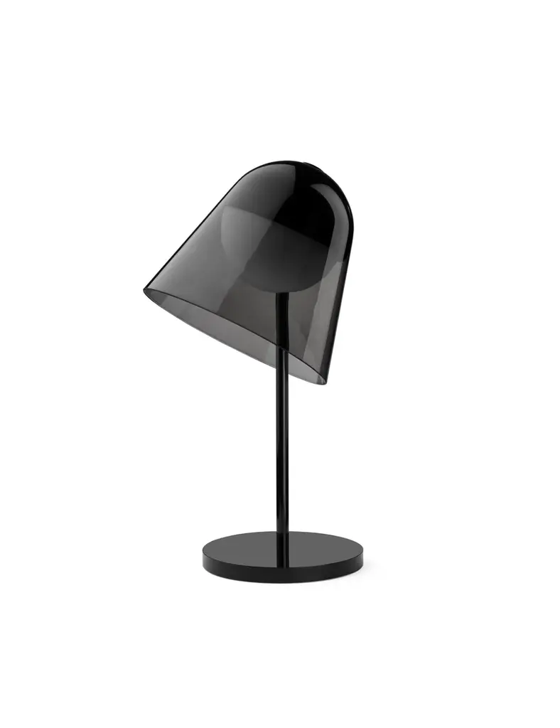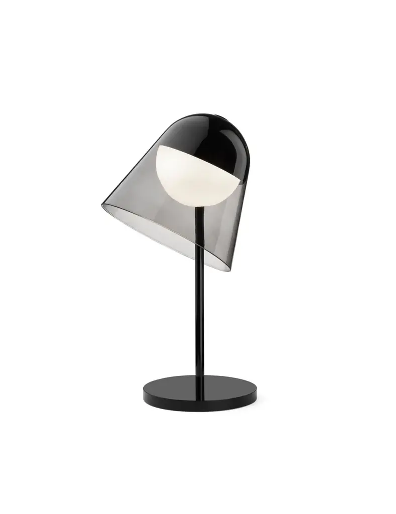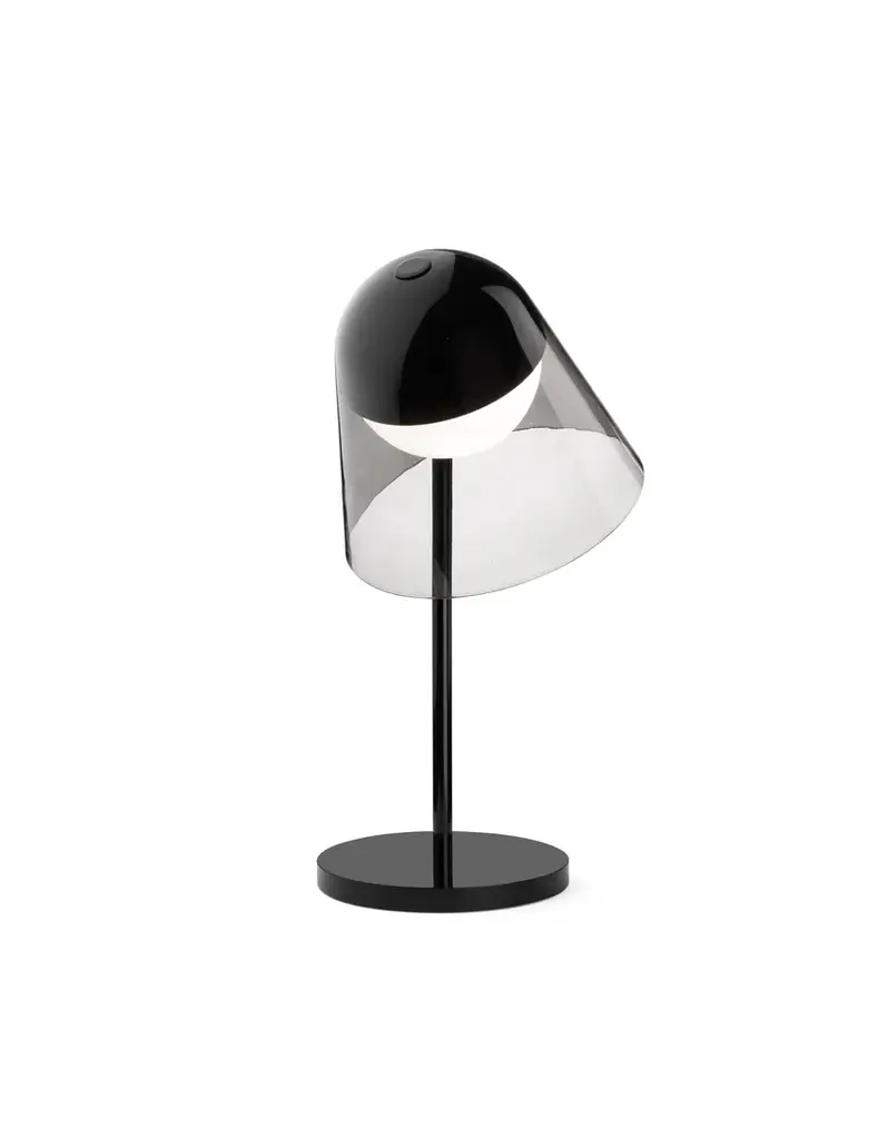 Supported on a simple stand and base, Helios balances a conic glass shade on top of a small glowing sphere. Magically suspended above the Sphere, this semi-translucent shade can be angled and pivoted in any direction allowing a range the versatility - from focused light for reading to a more diffused ambient effect for the gathering of groups.StructureMetal structure in painted aluminum. Internal sphere and external cone made by blown glass. LED dimmable light.