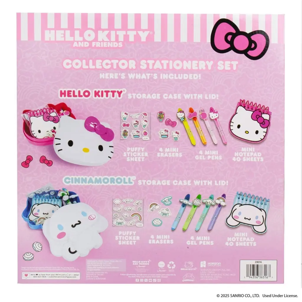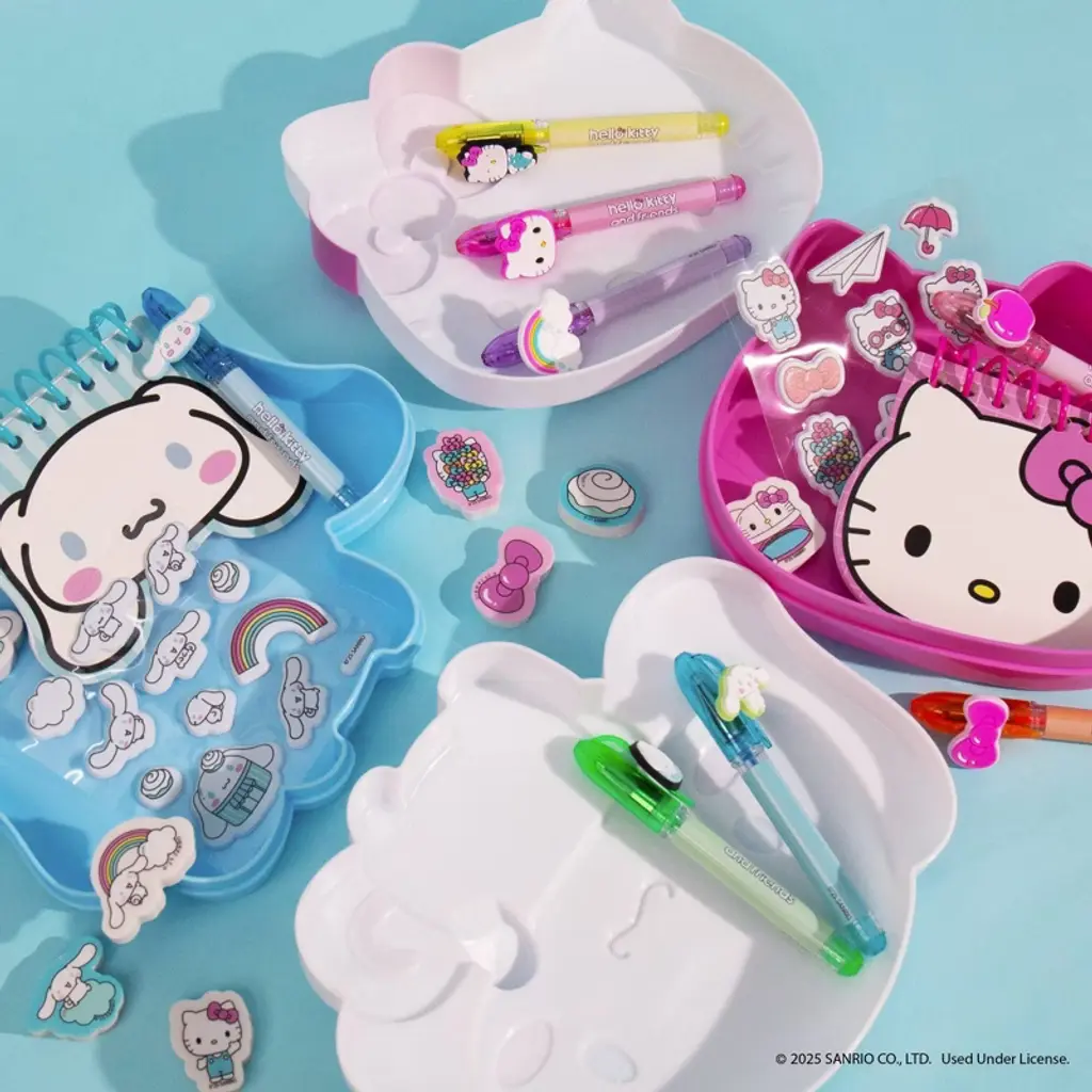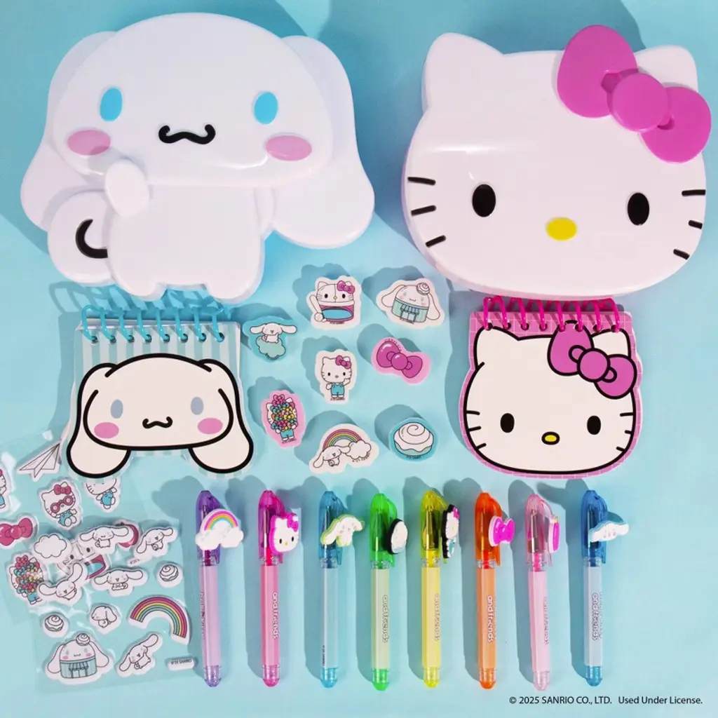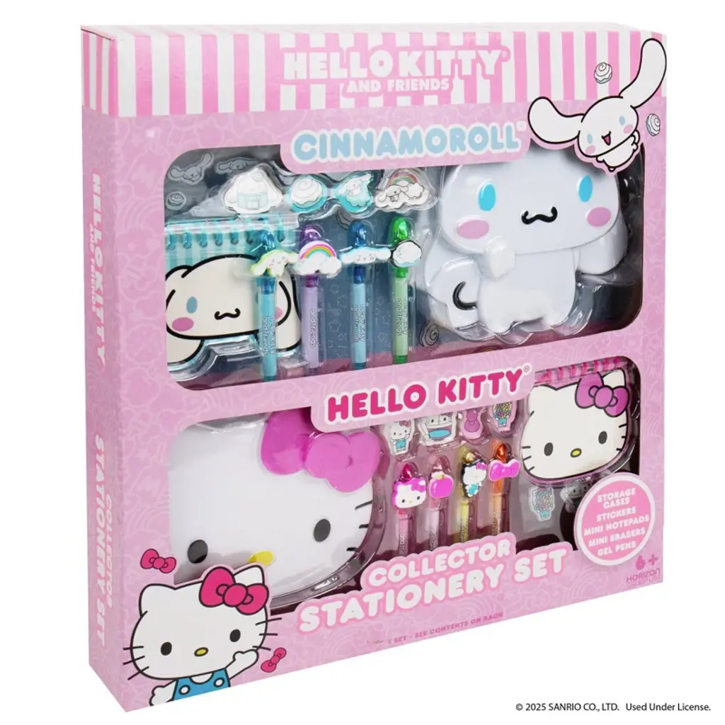 Double the fun, double the cuteness! Deck out your desk with the Hello Kitty And Friends Collector Stationery Set, featuring fan-favorites Cinnamoroll and Hello Kitty. This super cute 2-in-1 collection is filled with mini (but mighty!) stationery essentials that bring kawaii charm to every note, doodle, and to-do. Inside, you’ll find collectible character-shaped storage cases, mini notepads, colorful gel pens with Sanrio character toppers, puffy stickers, erasers, and mini tape rolls—everything kids need to stay creative and organized. Whether you're journaling, sending sweet notes, or just adding some Sanrio style to your day, this set is perfect for school, home, or gifting. Recommended for ages 6 and up.