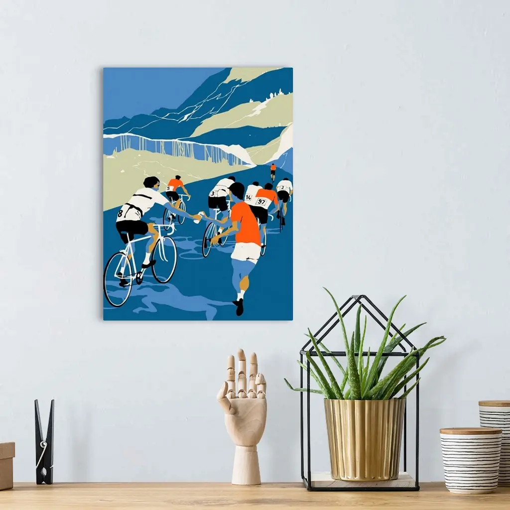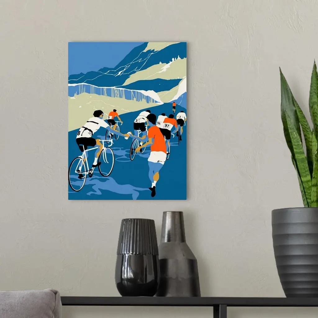 Contemporary illustration of cyclists being given drink while en route during competition.