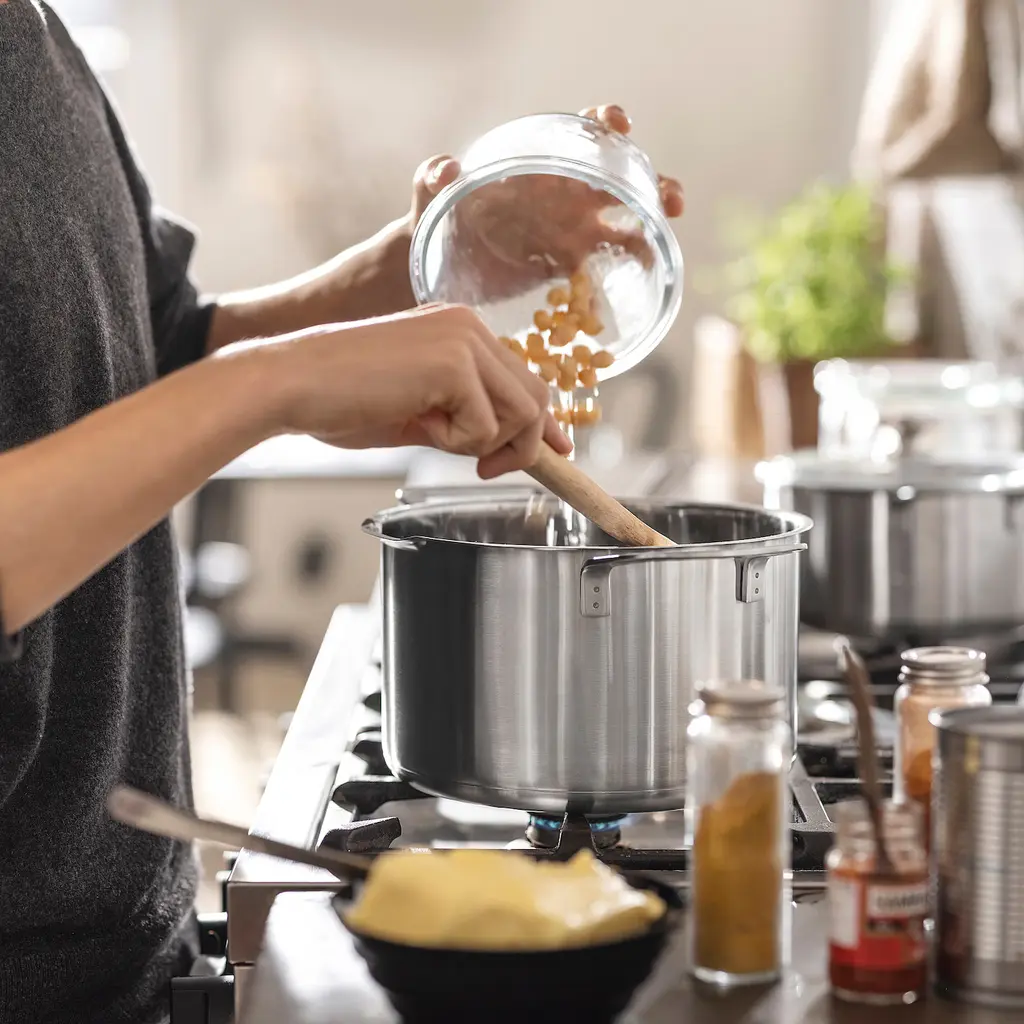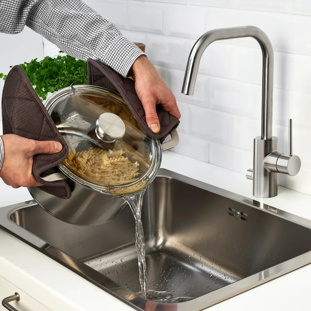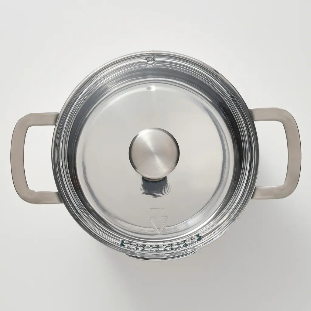 HEMKOMST Pot with lid - stainless steel/glass 5.3 qt. Works well on all types of cooktops, including induction. This pot has a heat resistant glass lid with a built in strainer. Replaces a colander and a strainer; pour out cooking water directly from the pot through the pot strainer.