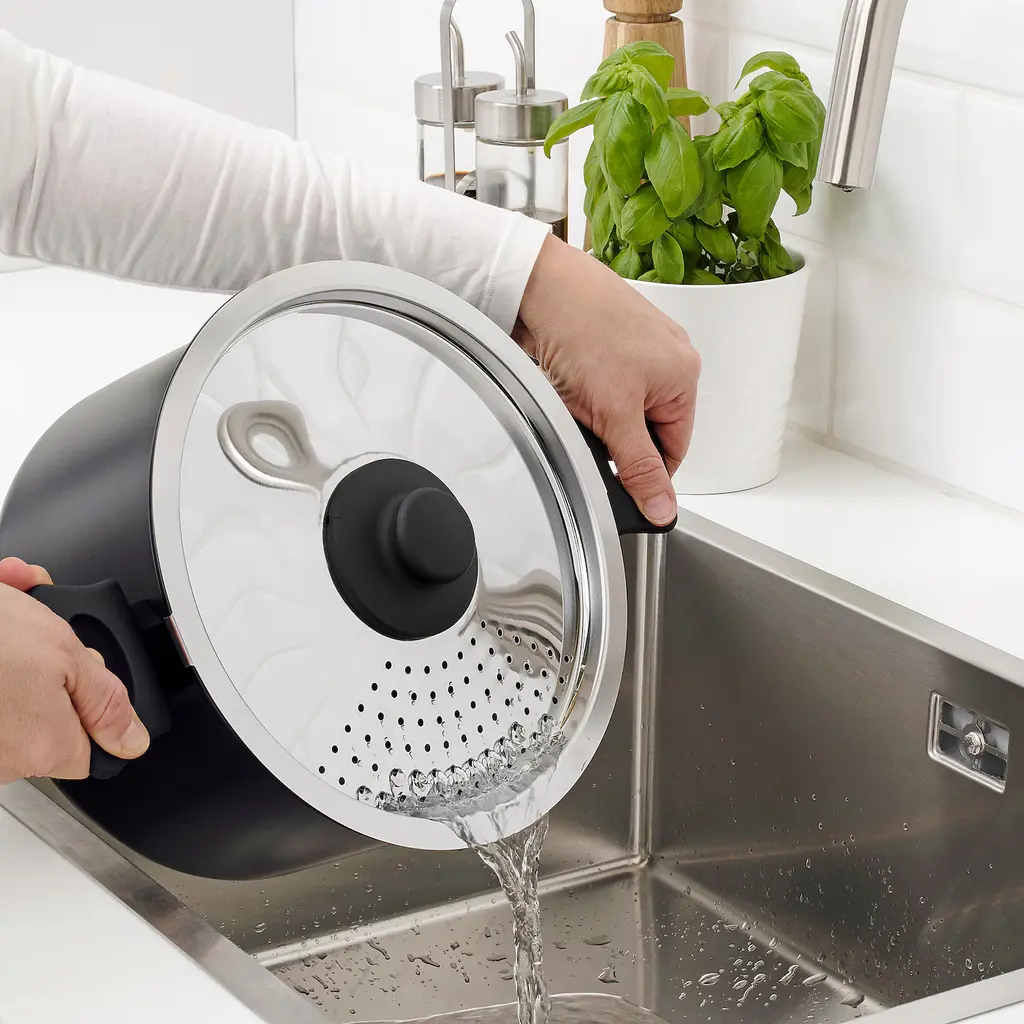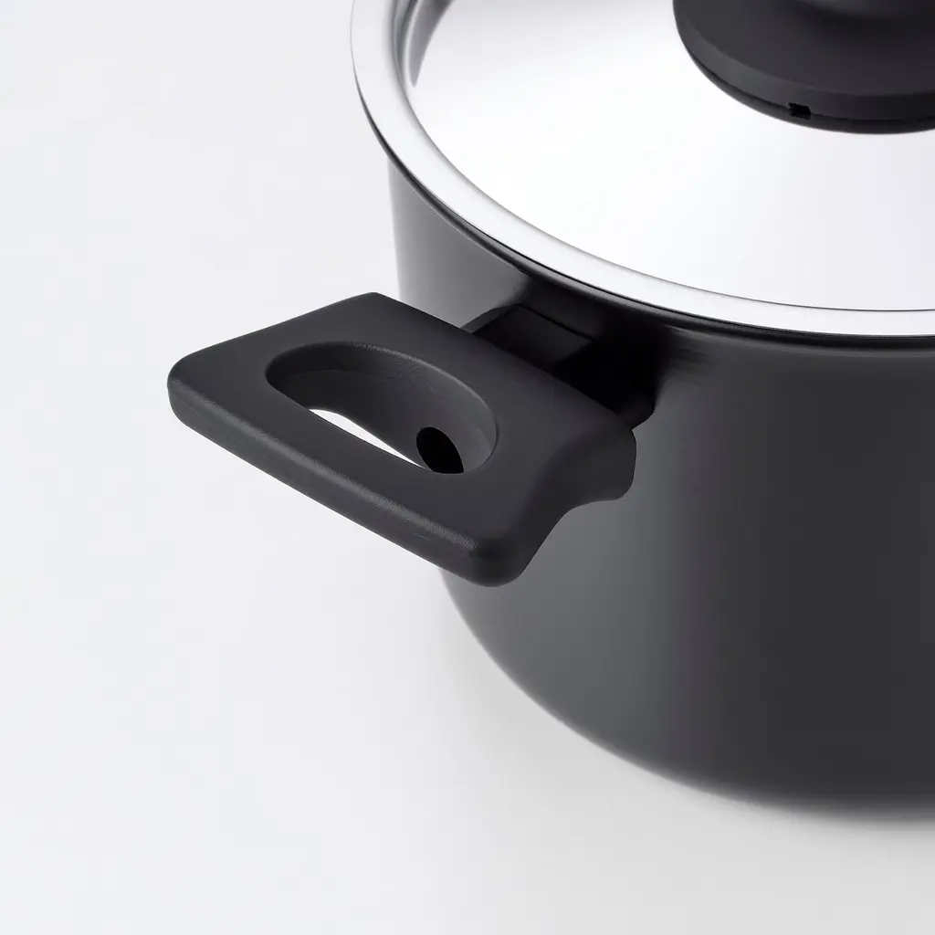 HEMLAGAD 6-piece cookware set - black. Works well on all types of cooktops, including induction. Made from aluminum, which spreads heat evenly and energy efficiently, and makes it easier to regulate heat so the food does not burn and stick. Comfortable handles make the cookware easy to lift.