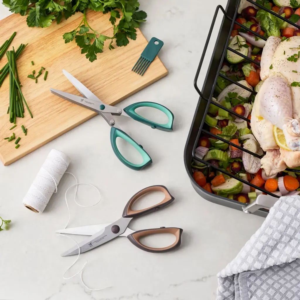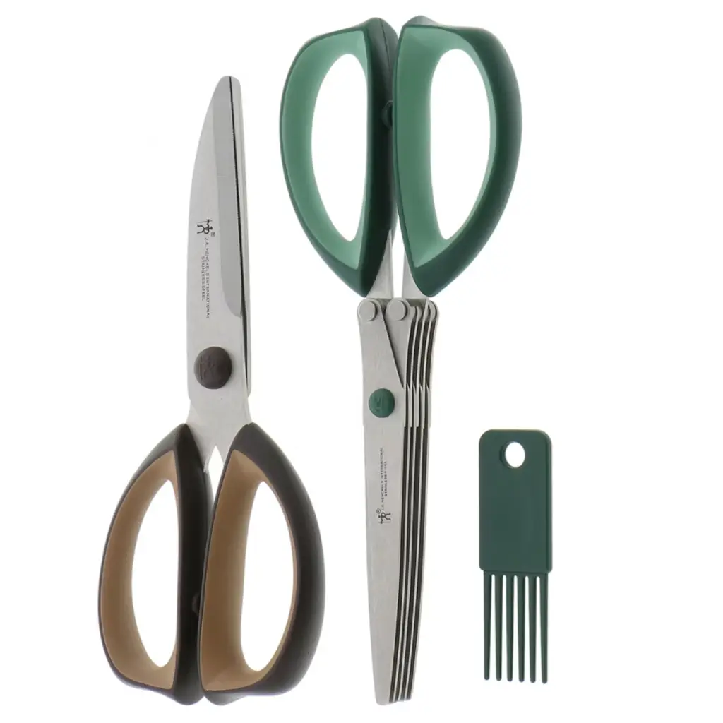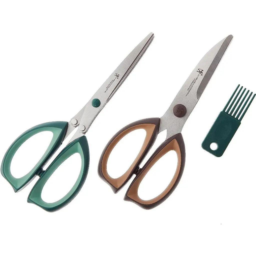 This essential 2-piece set features Take-Apart Kitchen Shears for just about every cutting task in the kitchen. They easily come apart for thorough cleaning. Also included are the 5-bladed Herb Shears for efficient snipping of herbs, as well as an Herb Shears Blade Cleaner.The HENCKELS collection of shears puts precision in the palm of your hands, in the kitchen and throughout the household. Fabricated from high quality stainless steel, the blades boast long-lasting sharpness while the non-slip handles are comfortable to grip.