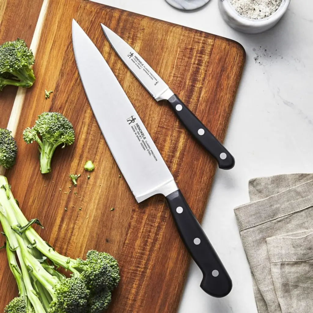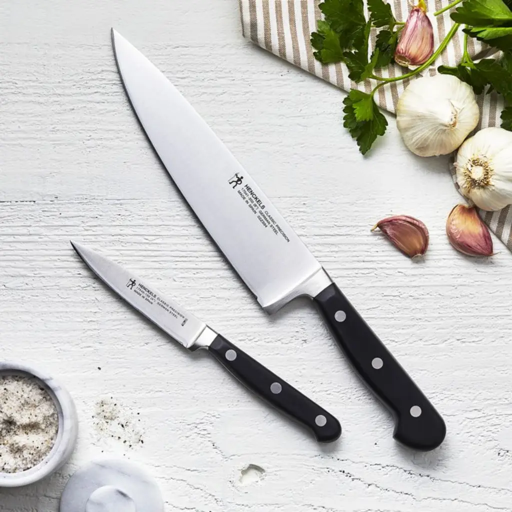 Razor-sharp blades make short work of a wide range of cutting tasks with this essential pair of knives. Forged stainless steel blades with a satin finish slice, dice and trim precisely, while the ergonomic, triple-riveted handles ensure fatigue-free work. Our exclusive two-piece set includes a 4" paring knife and an 8" chef's knife Need help choosing? Here's your essential guide to choosing the best knife
