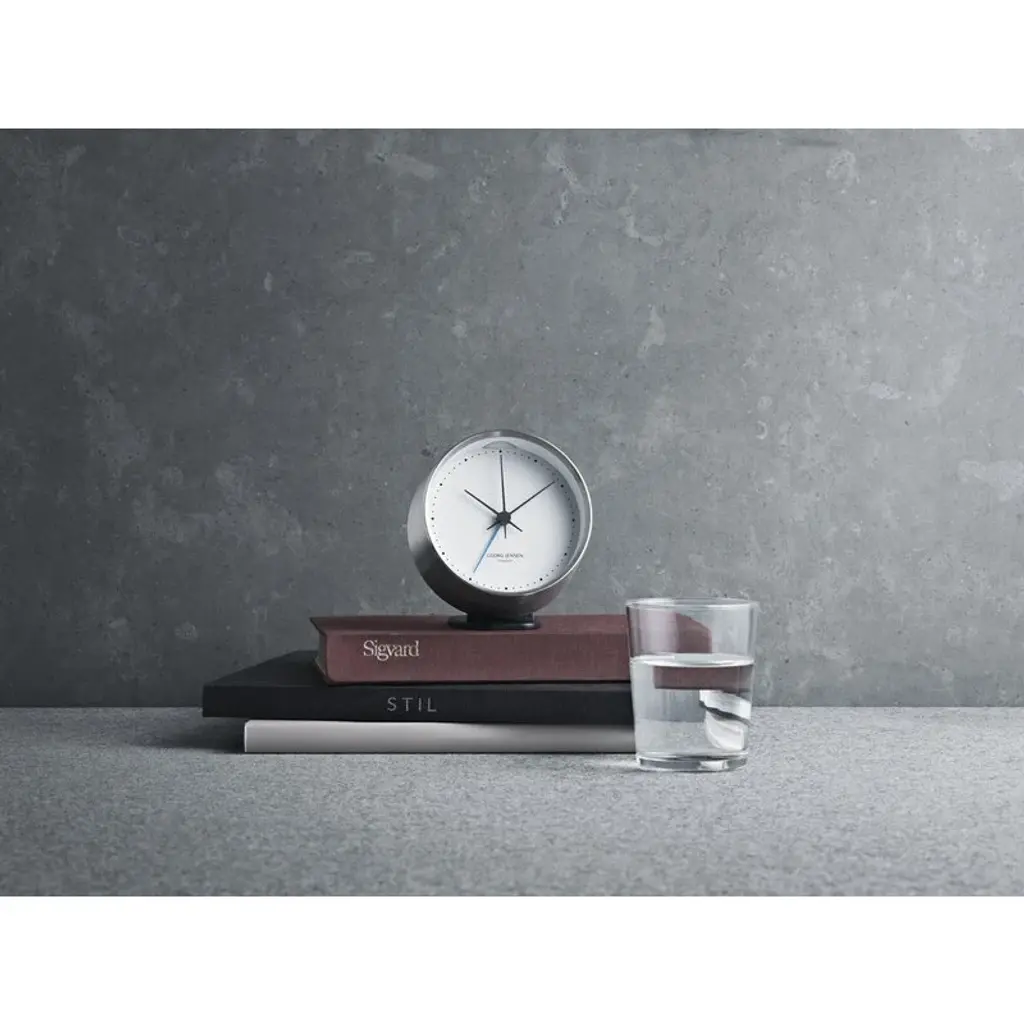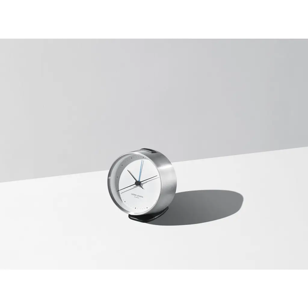 Georg Jensen’s Henning Koppel alarm clock is a fine combination of Danish functionality and style. Designer legend Henning Koppel’s clocks were published already in 1978, and due to their timeless elegance, the clocks were later re-introduced by Georg Jensen. The characteristic features of the Henning Koppel clocks include unique, black hands on a simple, white clock face. The visual appearance of the collection has remained almost unchanged, but the collection has later been expanded with new colors and materials. The alarm clock has an incorporated light and a snooze button. In addition, it comes with a practical holder so the clock can stand on the night table or office desk. The clock’s alarm arm is blue and the others are black.