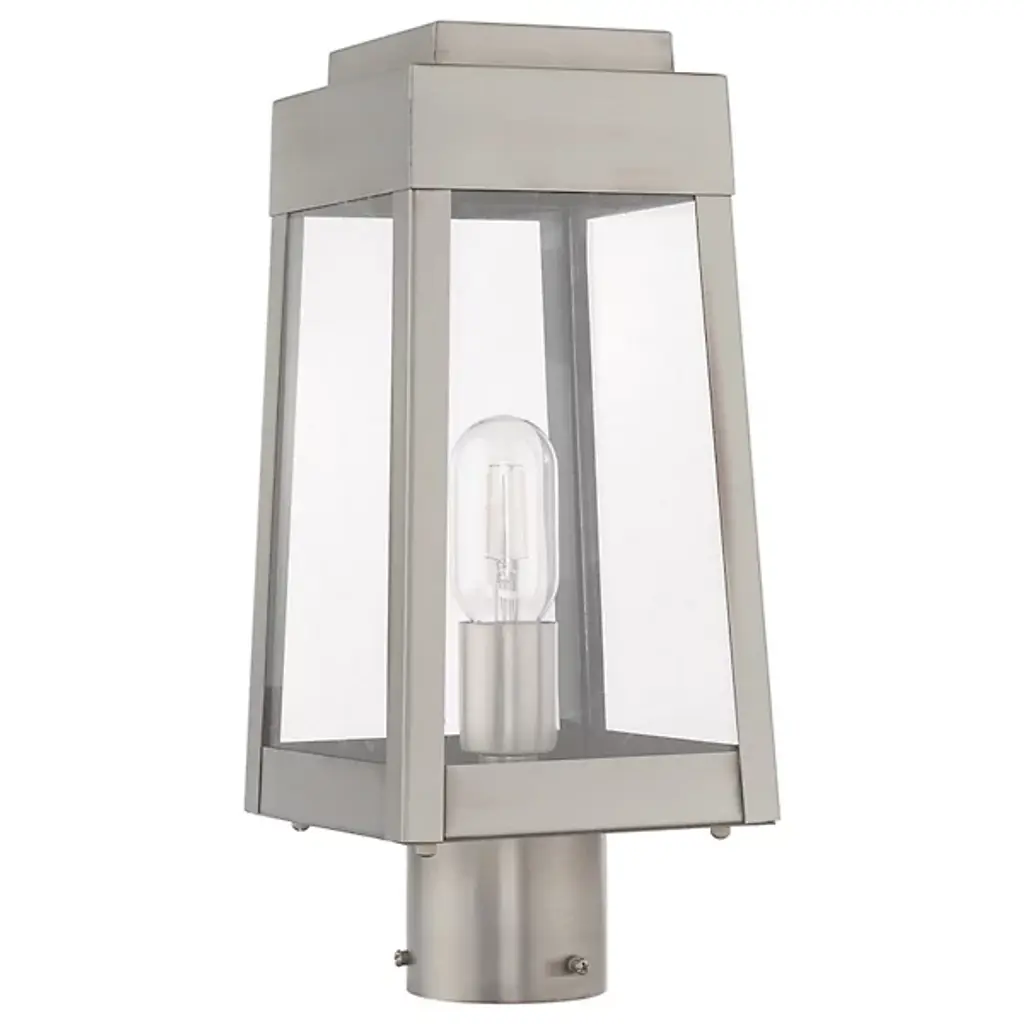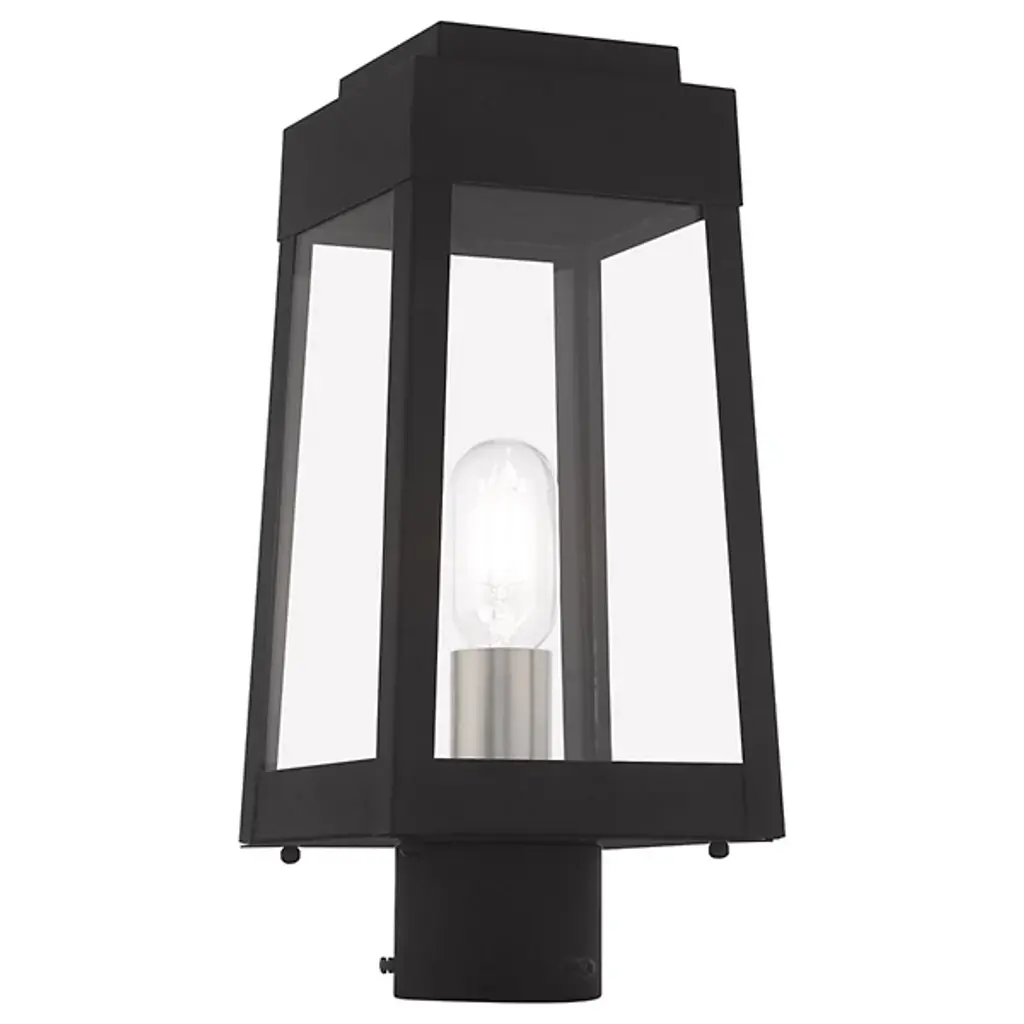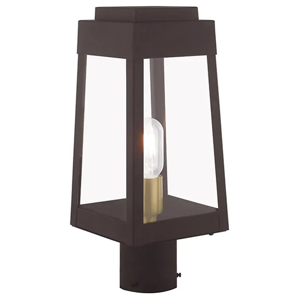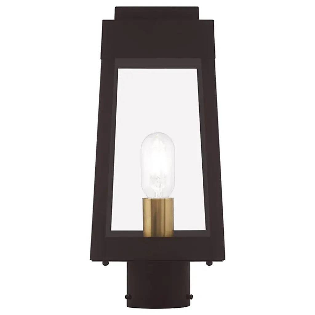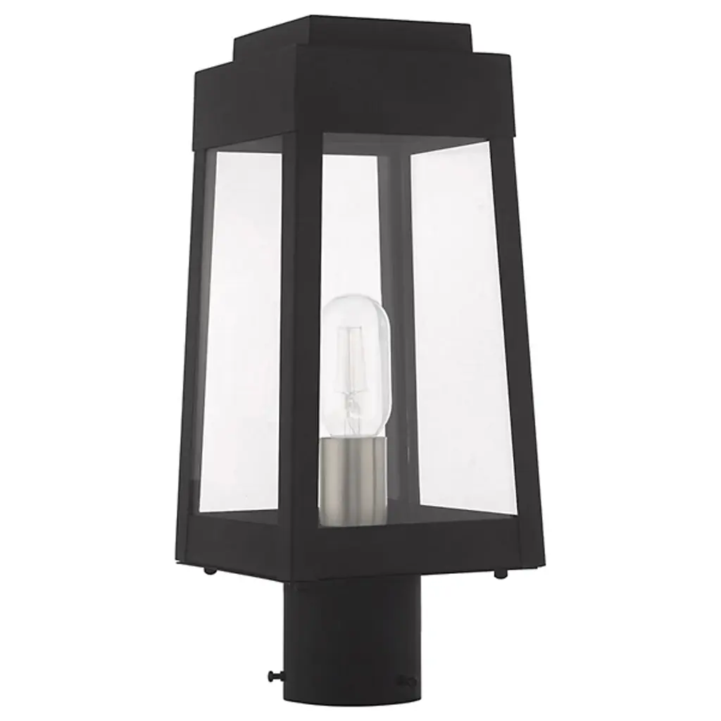 A sharp contemporary take on the familiar lantern silhouette. The Henry Outdoor Post Light from Alder & Ore provides an inviting visual through its clean shapes and beaming aura. The post light’s crisp edges call back to the architectural features of the modern and contemporary home. Metalsmiths craft the structure by hand with great attention to detail. The structure features a familiar tapered form with a stepped hood accent. Glass panels help protect the bulbs while adding an elegant reflective note. The piece turns on to create a bright, eye-catching beacon.