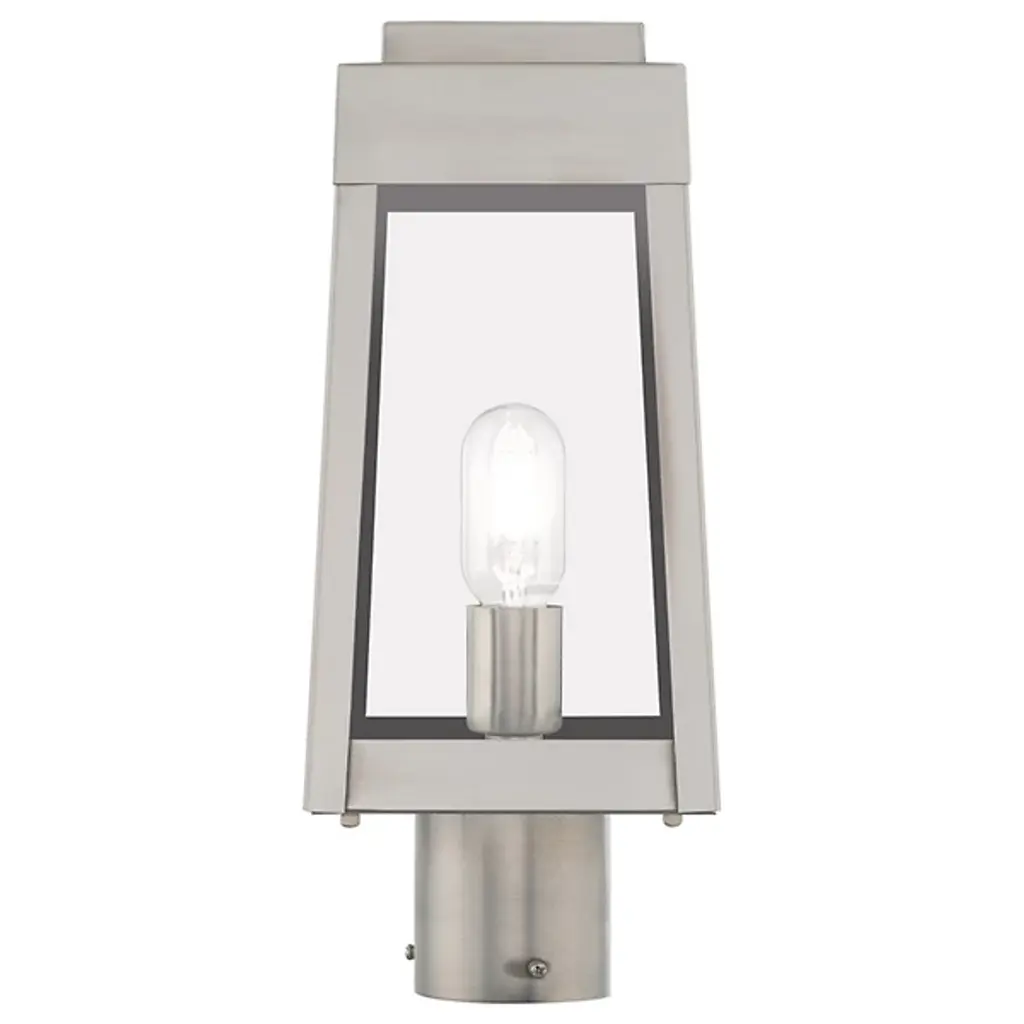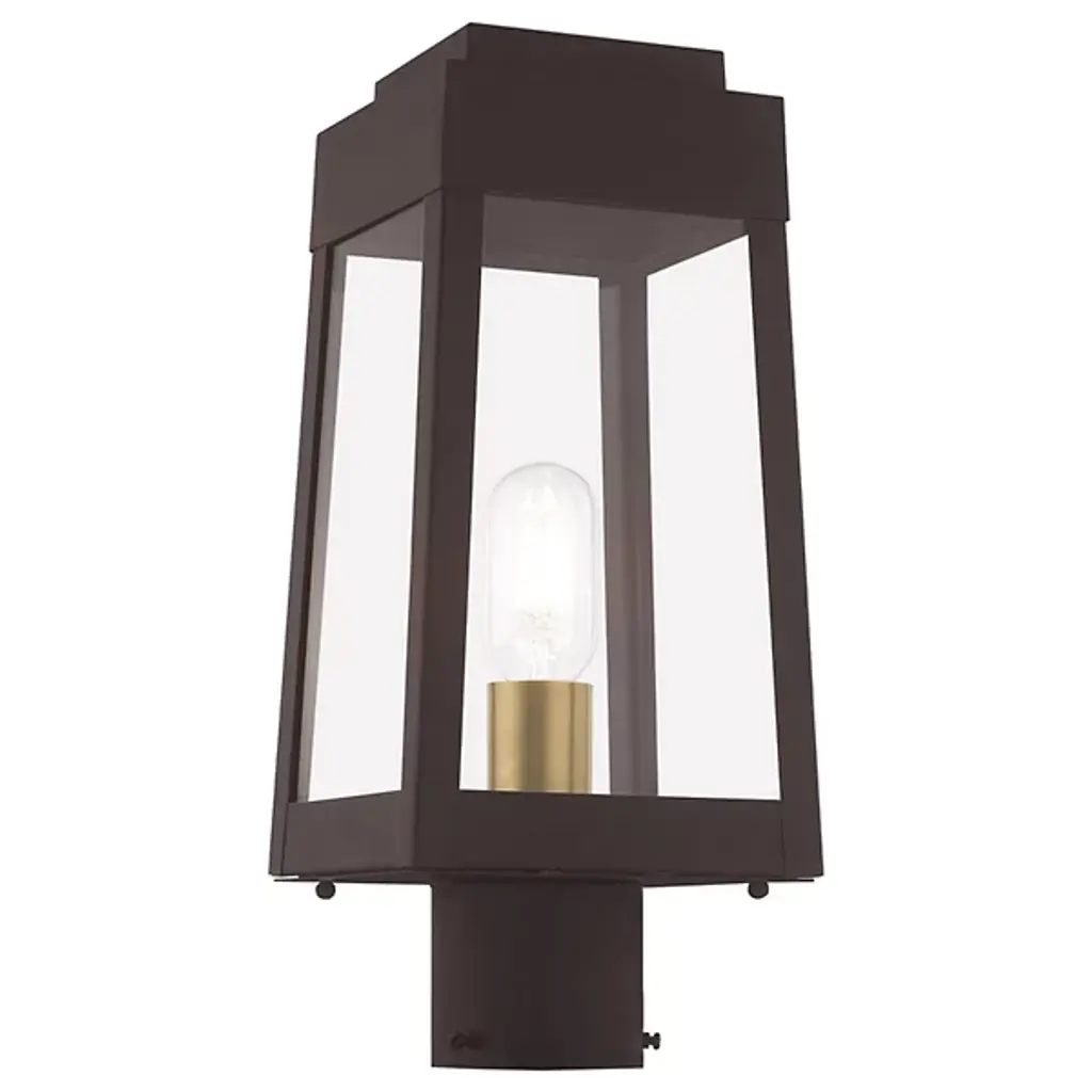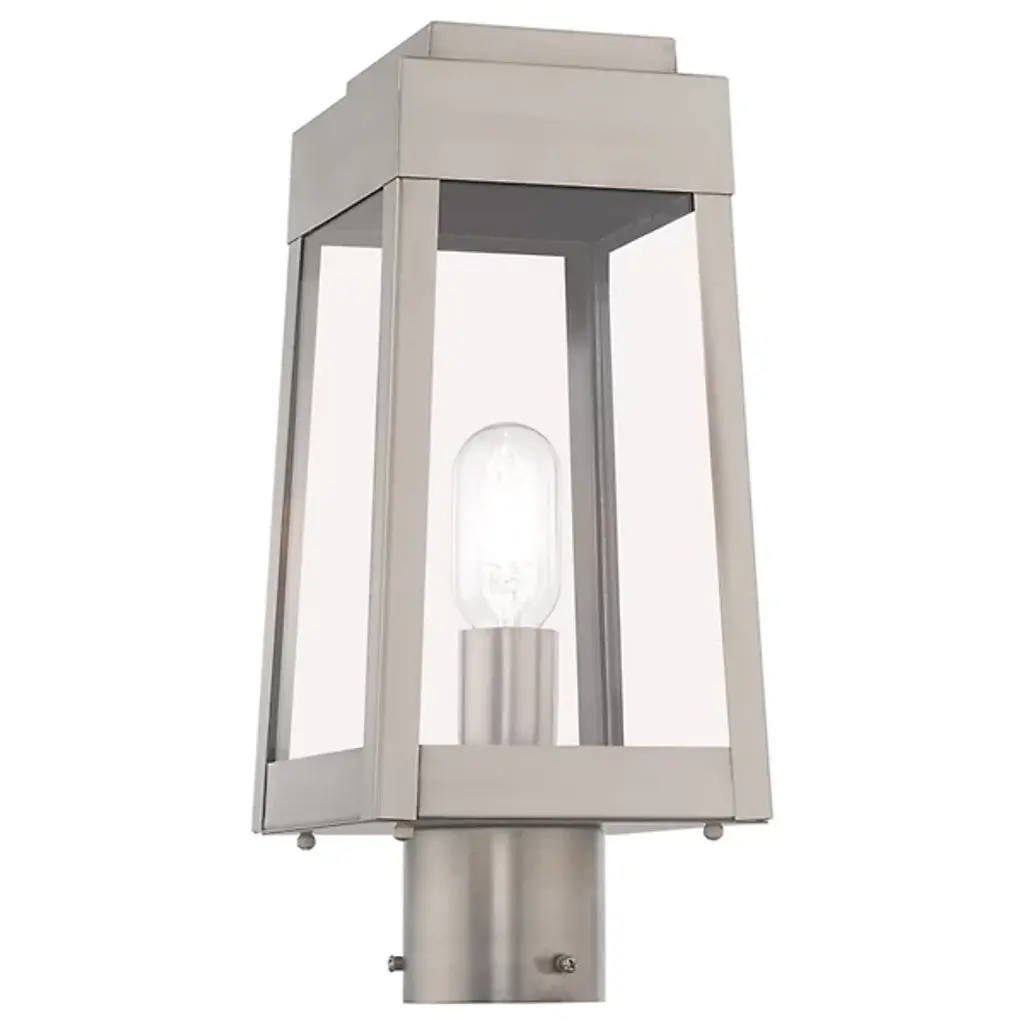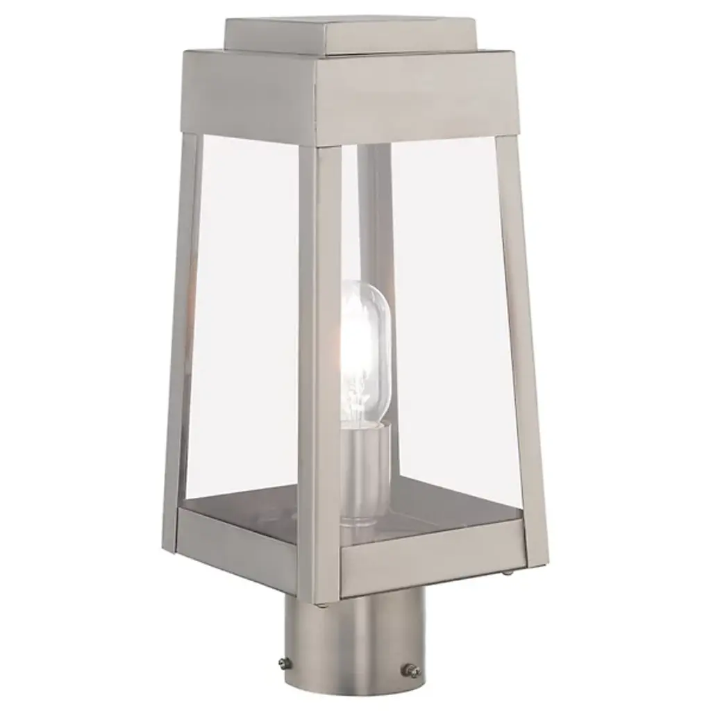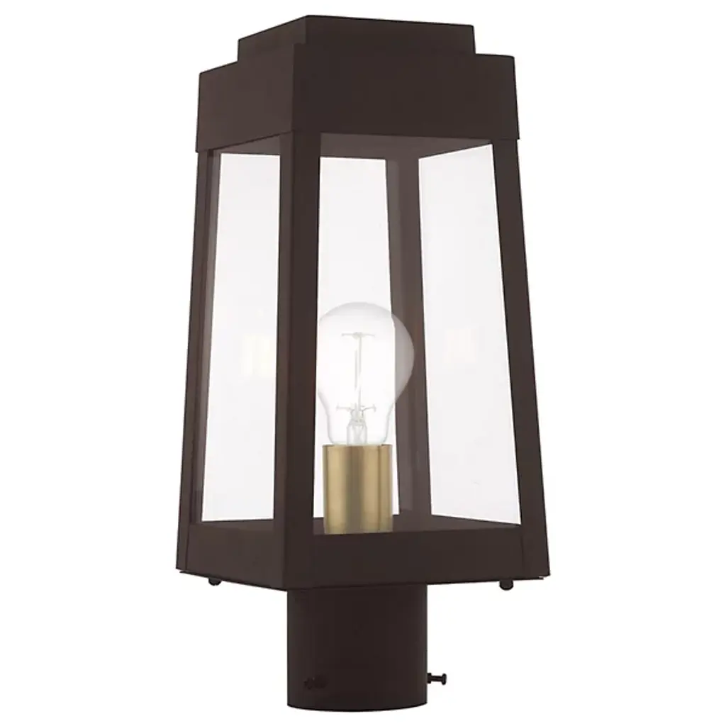 A sharp contemporary take on the familiar lantern silhouette. The Henry Outdoor Post Light from Alder & Ore provides an inviting visual through its clean shapes and beaming aura. The post light’s crisp edges call back to the architectural features of the modern and contemporary home. Metalsmiths craft the structure by hand with great attention to detail. The structure features a familiar tapered form with a stepped hood accent. Glass panels help protect the bulbs while adding an elegant reflective note. The piece turns on to create a bright, eye-catching beacon.