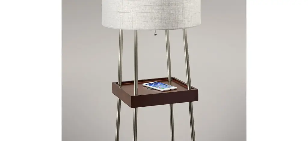 The Henry AdessoCharge Shelf Floor Lamp is a multi-functional piece of furniture and lighting that includes a wireless charging pad with Qi inductive charging technology integrated into the top shelf. Many smartphones (list below) have Qi technology built in, so just place your phone on the pad and it will charge right up. No cords, no mess. It's that easy! All AdessoCharge product is Qi certified by the Wireless Power Consortium. Please visit https://www.wirelesspowerconsortium.com/products/search/ to see a list of Qi certified products. Our product has been tested and verified to be safe and in compliance with the Qi standard. The AdessoCharge pad supports 5W charging on contact with the charging pad, which gets your phone from 0% to 100% in just 45 hours, depending on your phone model. A USB is located on the base and can charge up a second device simultaneously. AdessoCharge is unique in that you can use the AdessoCharge pad, the USB and the light all at the same time with maximum efficiency of all three. With all of this added functionality, you also get three beautiful walnut wooden storage shelves.
