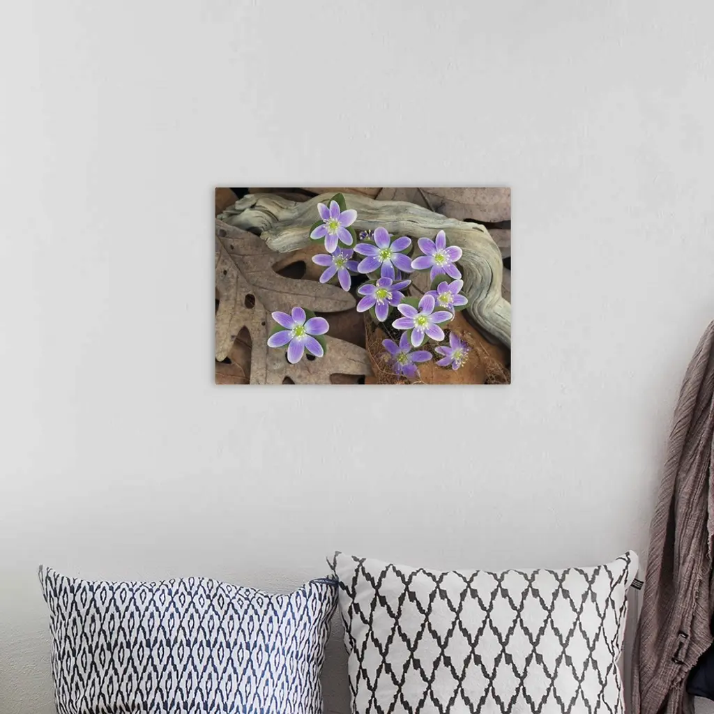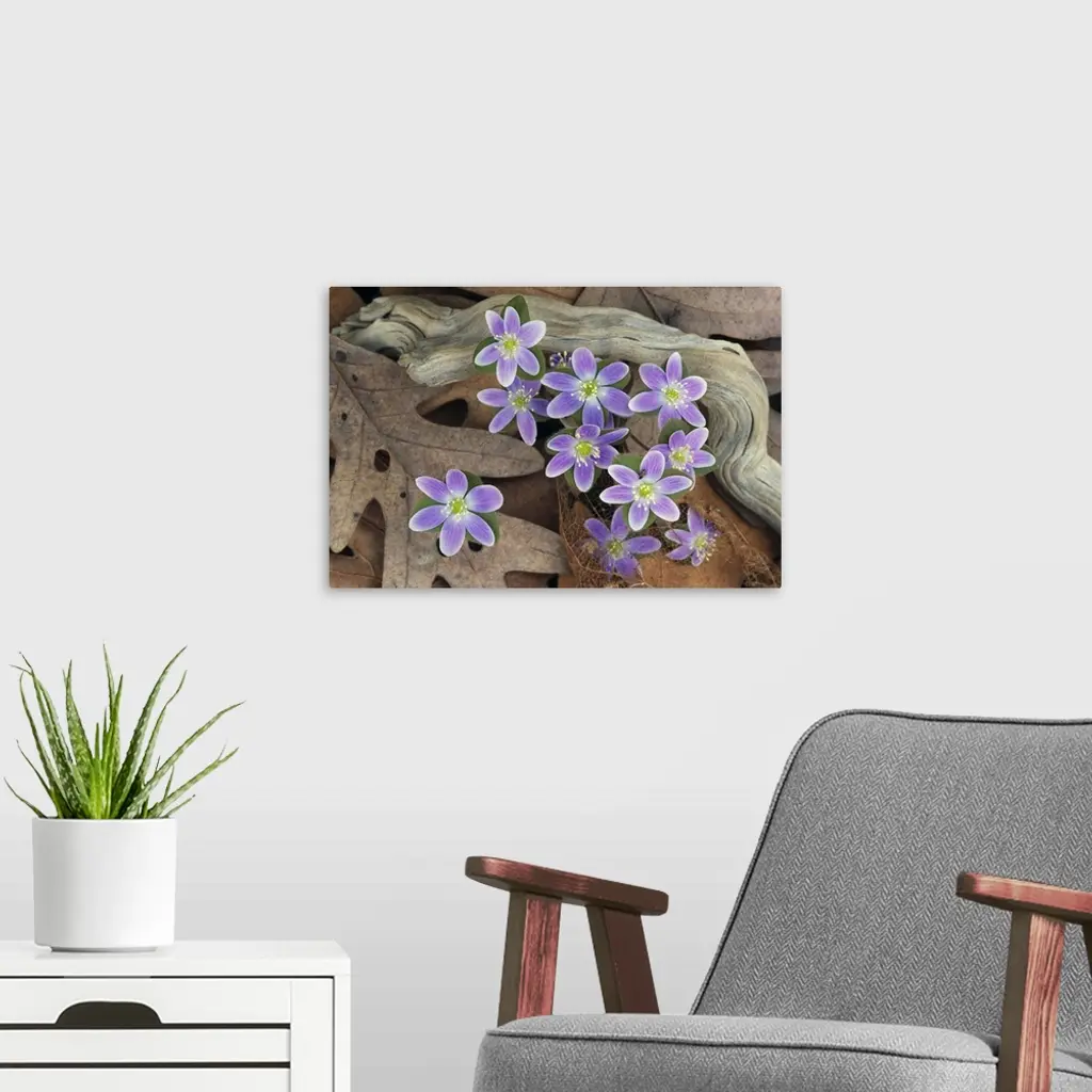 Hepatica Flowers Growing Through Fallen Leaves, Close Up, Michigan