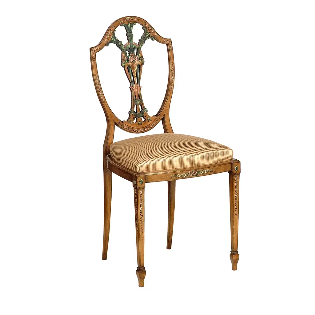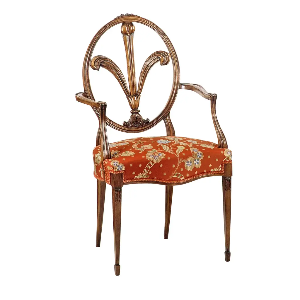 This remarkable chair is a superb reproduction of an original Hepplewhite design dating back to 1780-1800. Fashioned of beech and meticulously hand-carved to achieve its distinctive textural ornaments, the design flaunts a plush seat upholstered in a red floral fabric harmonizing with the detailed lily set in the oval backrest for impeccable support.