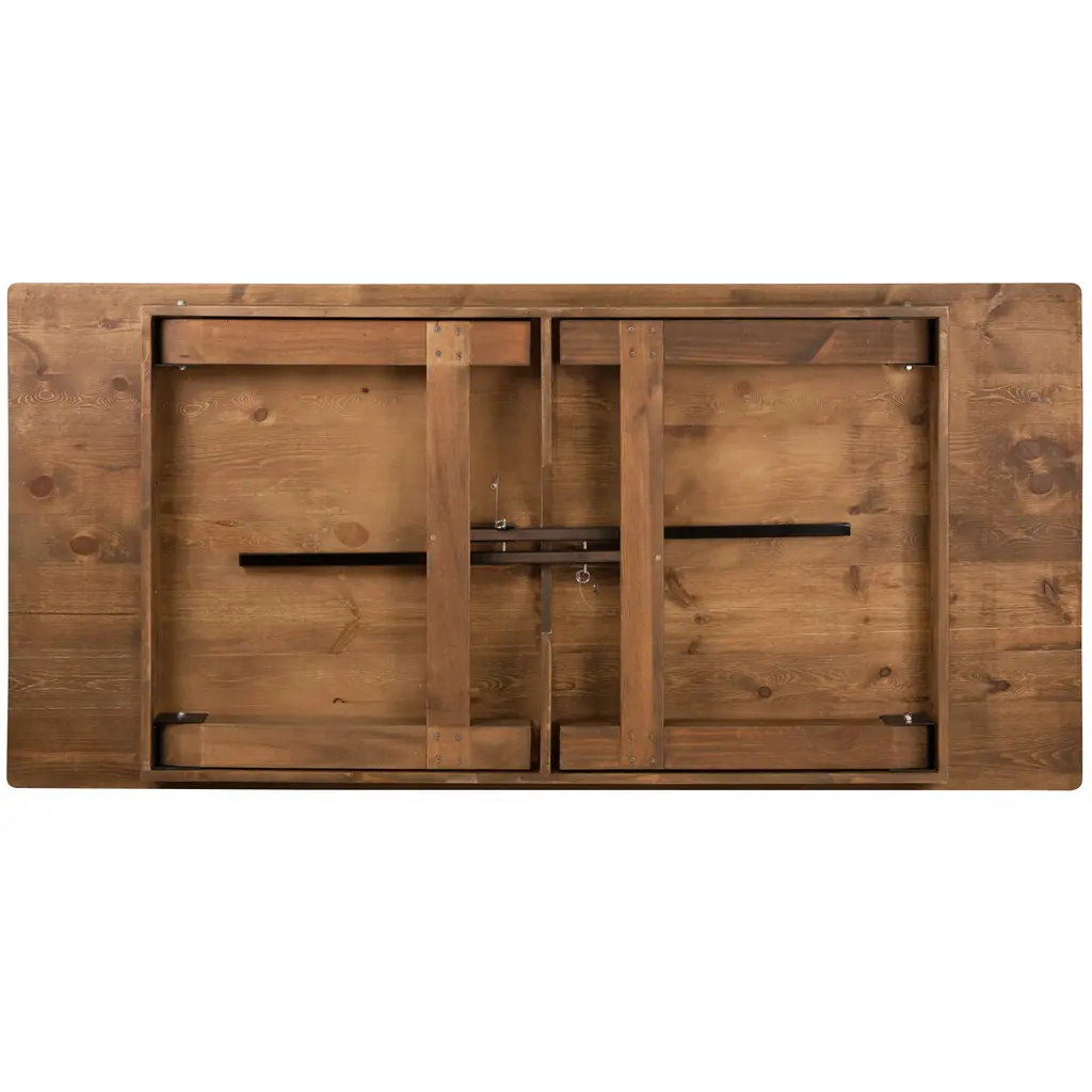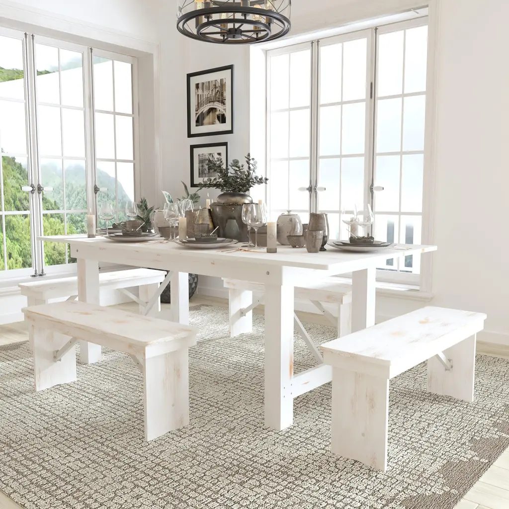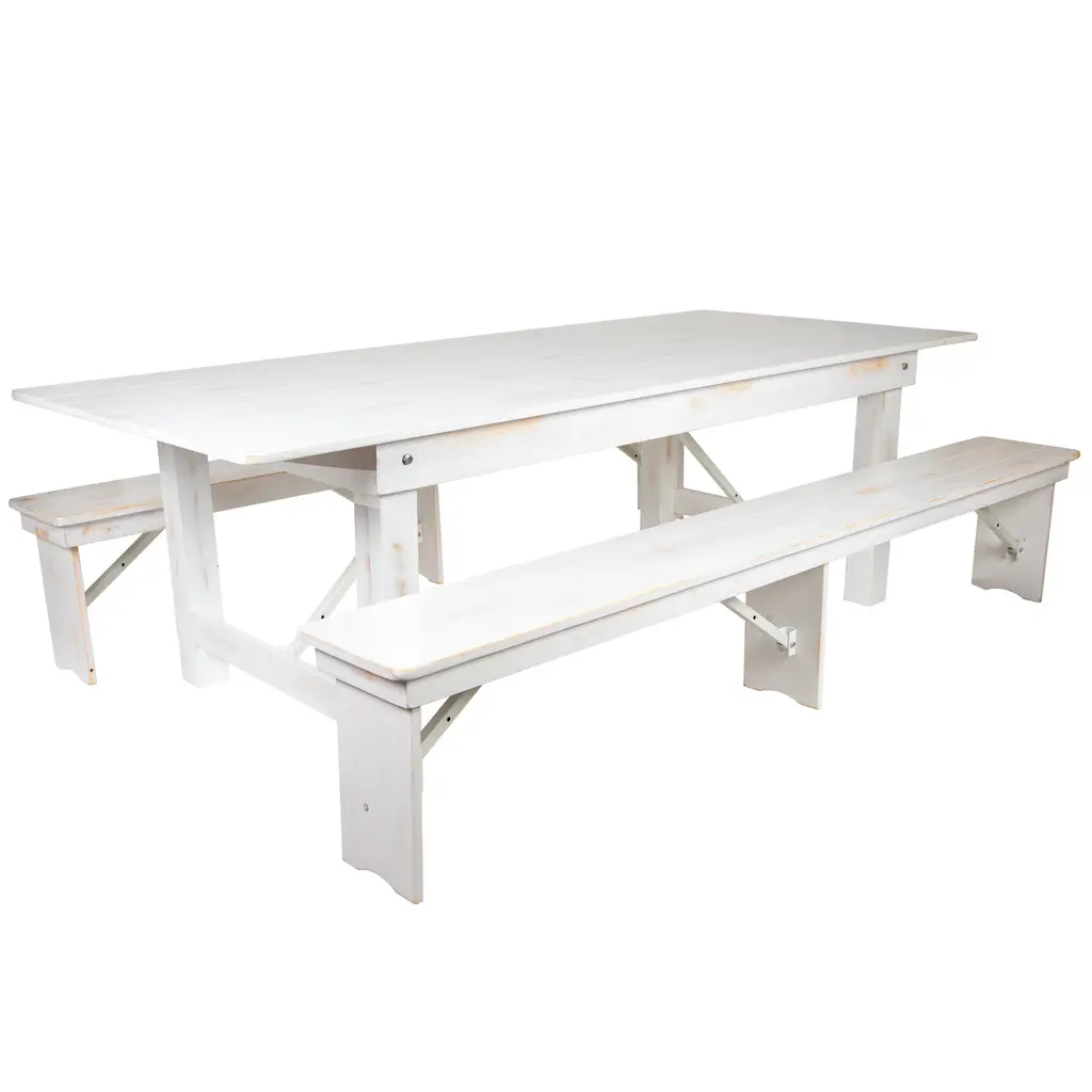 Invite family and friends out to dine in style on your brand new farm house style table set. This rustic style table will bring warmth to your kitchen or dining room. The robust design is suitable for the restaurant and hospitality industry. A simple, rustic design and color accentuate this beautiful farm table. This solid table features a plank, solid pine top with a wide apron. Both table and benches have folding legs to transport to different venues or when you move. Pins pull out to fold the legs that securely lock underneath the tops. The same pins provide extra stability when the table and seats are in use. Bench seating offers a comfortable way for people to sit together in an open design, for home and businesses alike having the views free of chair backs can be pleasant. Although constructed for indoor use, you may enjoy outdoors for special events during good weather. Use a water based cleaner and dry clean to keep your tables spotless. If you're going for a country modern appeal, the 7' x 40'' Folding Farm Table and Four Bench Set will get you the desired results.