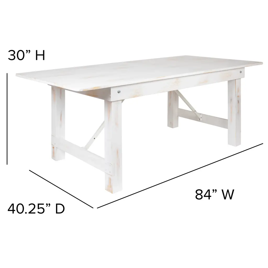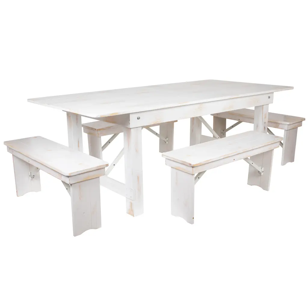 Invite family and friends out to dine in style on your brand new farm house style table set. This rustic style table will bring warmth to your kitchen or dining room. The robust design is suitable for the restaurant and hospitality industry. A simple, rustic design and color accentuate this beautiful farm table. This solid table features a plank, solid pine top with a wide apron. Both table and benches have folding legs to transport to different venues or when you move. Pins pull out to fold the legs that securely lock underneath the tops. The same pins provide extra stability when the table and seats are in use. Bench seating offers a comfortable way for people to sit together in an open design, for home and businesses alike having the views free of chair backs can be pleasant. Although constructed for indoor use, you may enjoy outdoors for special events during good weather. Use a water based cleaner and dry clean to keep your tables spotless. If you're going for a country modern appeal, the 7' x 40'' Folding Farm Table and Four Bench Set will get you the desired results.