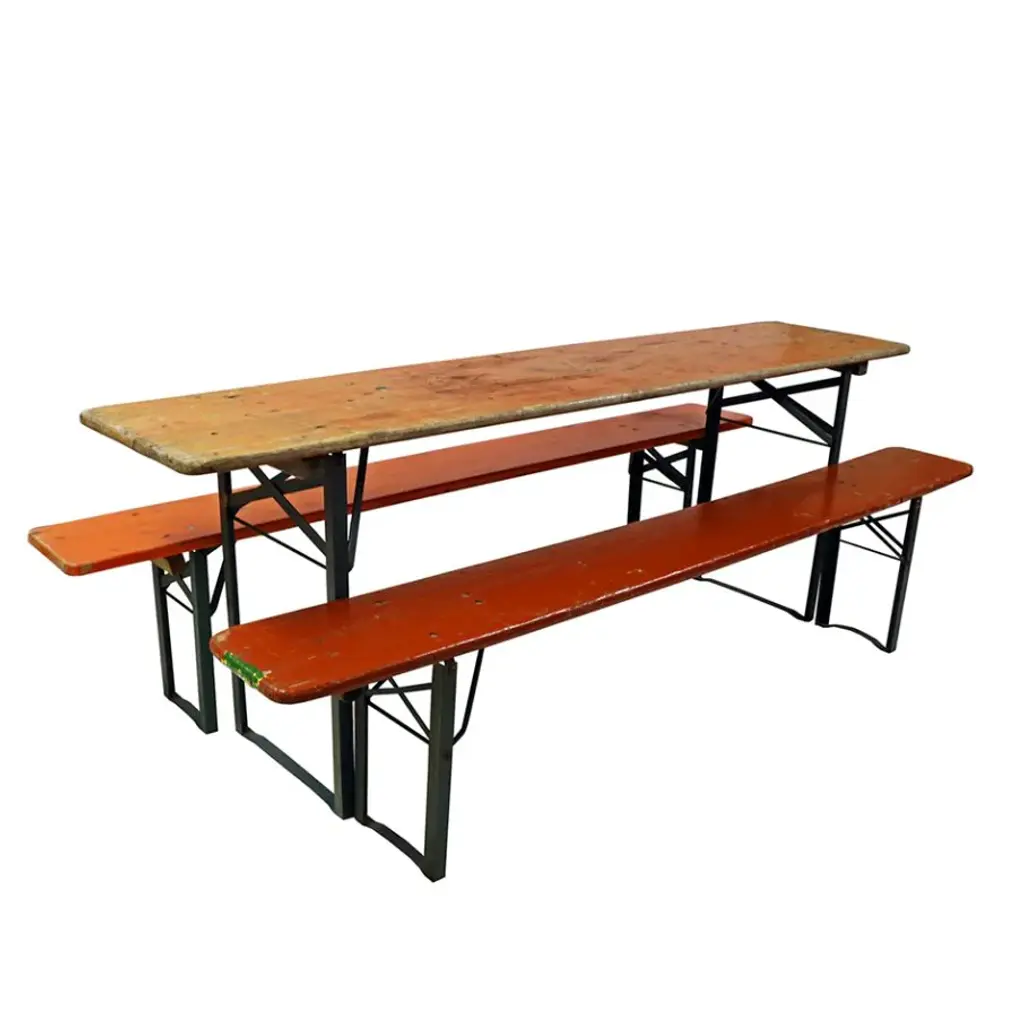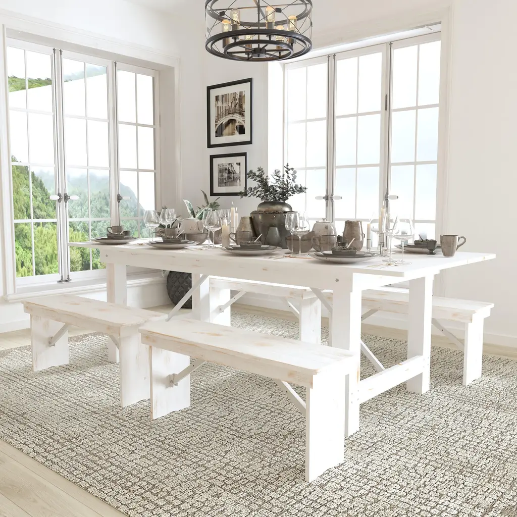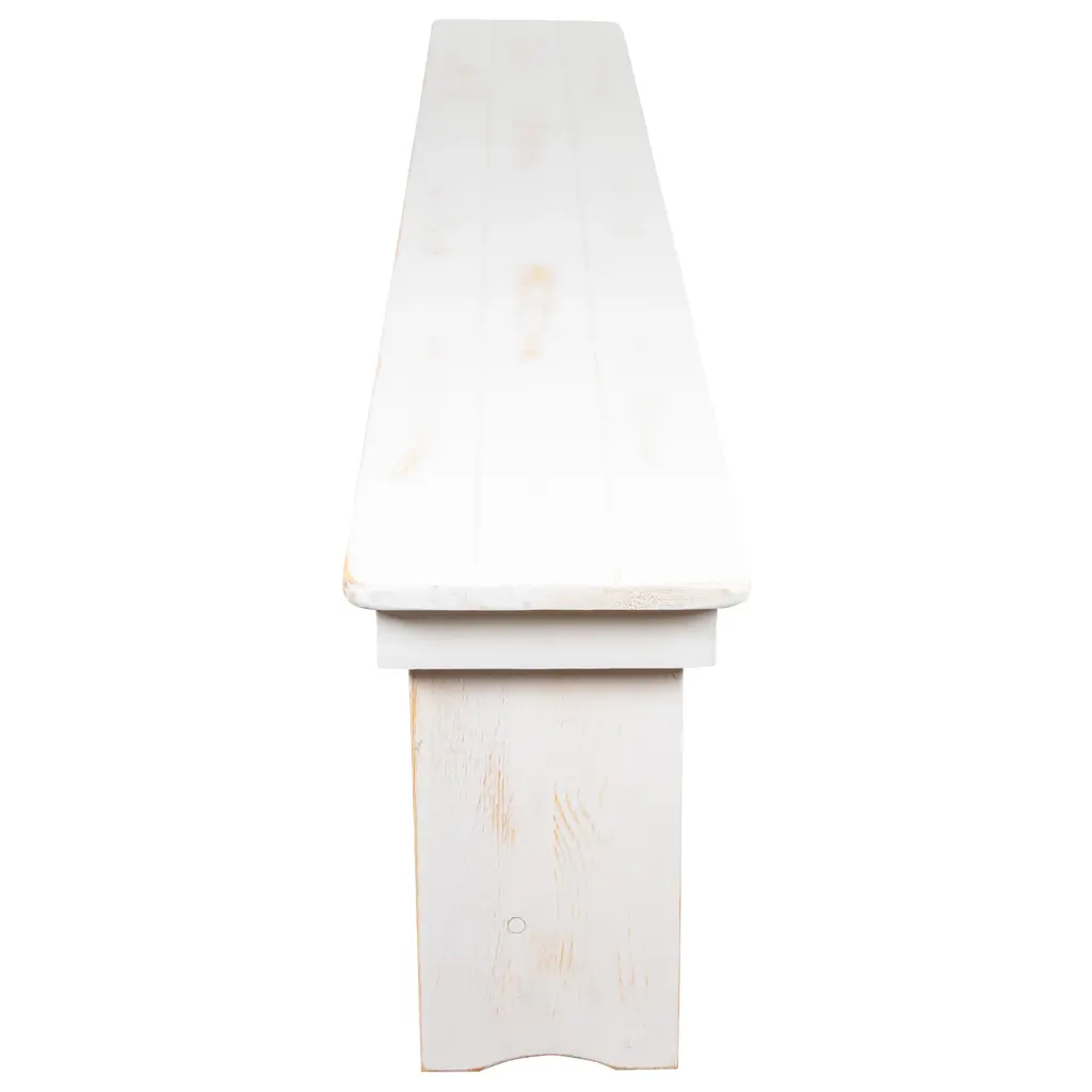 Invite family and friends out to dine in style on your brand new farm house style table set. This rustic style table will bring warmth to your kitchen or dining room. The robust design is suitable for the restaurant and hospitality industry. A simple, rustic design and color accentuate this beautiful farm table. This solid table features a plank, solid pine top with a wide apron. Both table and benches have folding legs to transport to different venues or when you move. Pins pull out to fold the legs that securely lock underneath the tops. The same pins provide extra stability when the table and seats are in use. Bench seating offers a comfortable way for people to sit together in an open design, for home and businesses alike having the views free of chair backs can be pleasant. Although constructed for indoor use, you may enjoy outdoors for special events during good weather. Use a water based cleaner and dry clean to keep your tables spotless. If you're going for a country modern appeal, the 8' x 40'' Folding Farm Table and Four 40.25"L Bench Set will get you the desired results.
