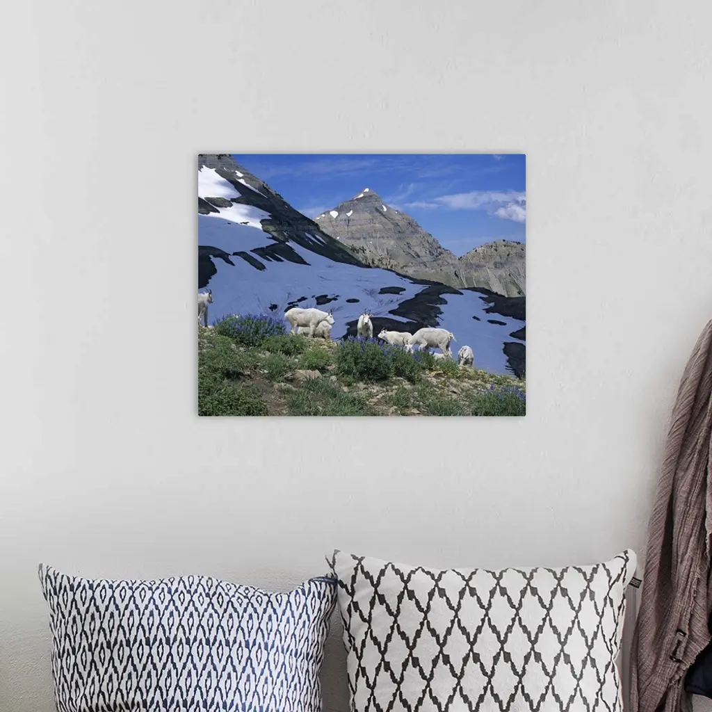Herd of Mountain Goats (Oreamnos americanus) feed on first Lupine of the year. Mt. Timpanogos Wilderness, Utah.