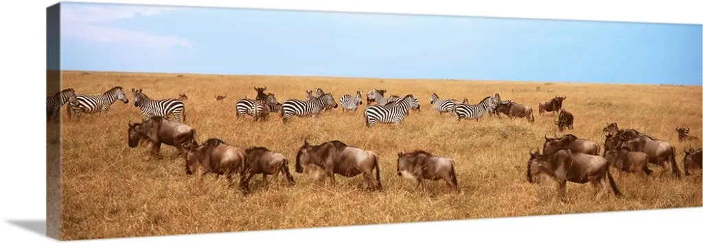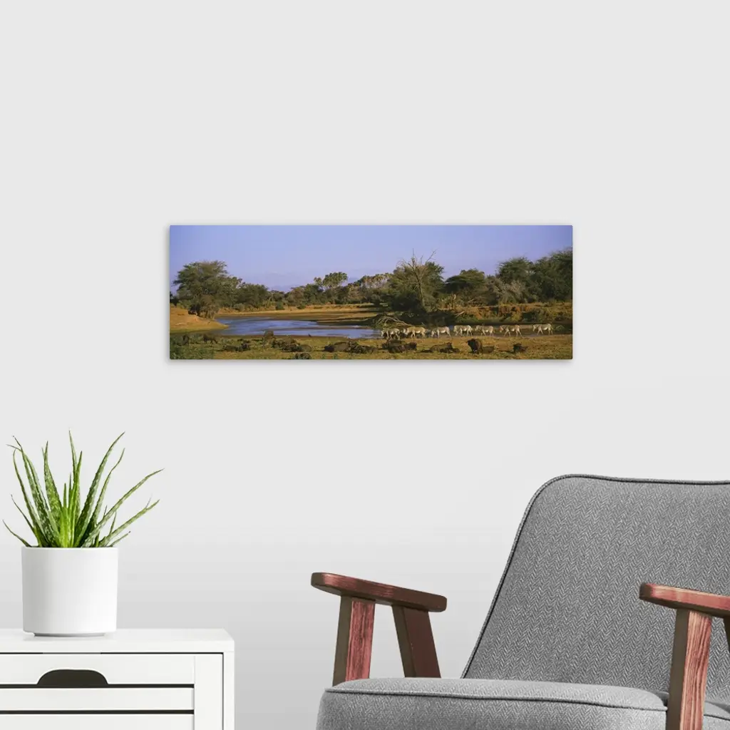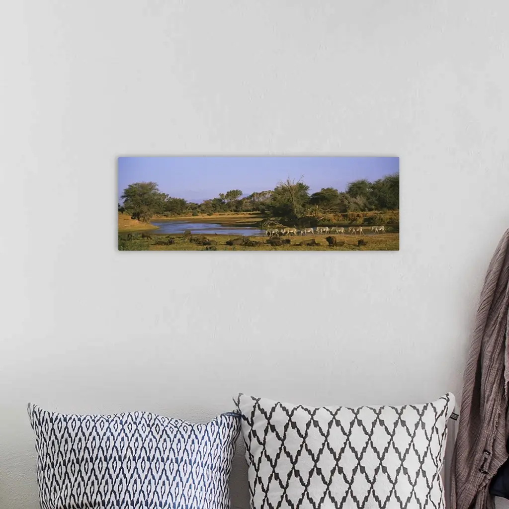 Herd of Zebra (Equus grevyi) and African Buffalo (Syncerus caffer) in a field, Uaso Nyrio River, Samburu, Kenya wall art for home and office decor. Discover canvas art prints, photos, mural, big canvas art and framed wall art in GreatBigCanvas.com's varied collections.