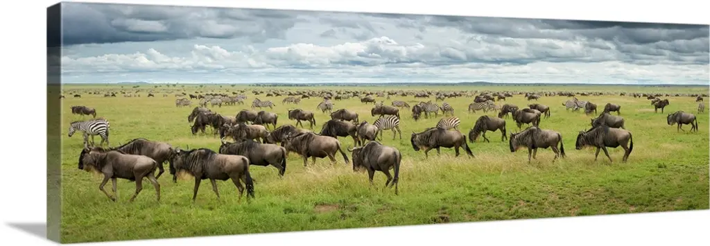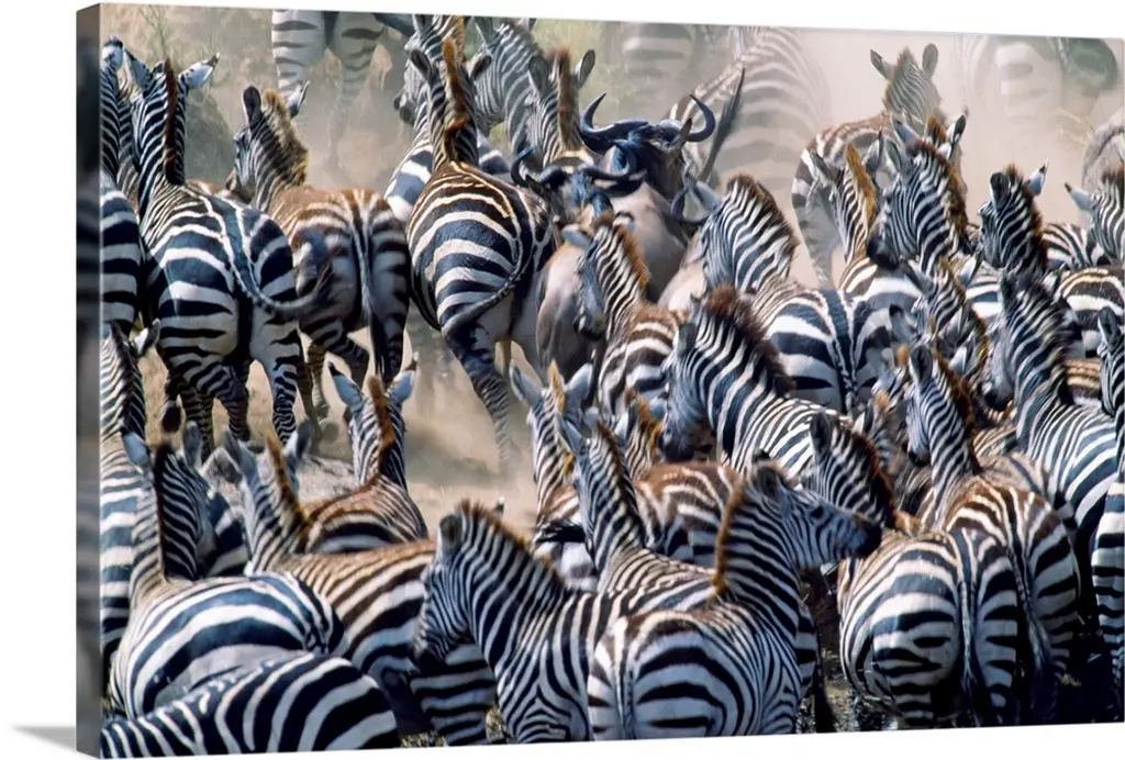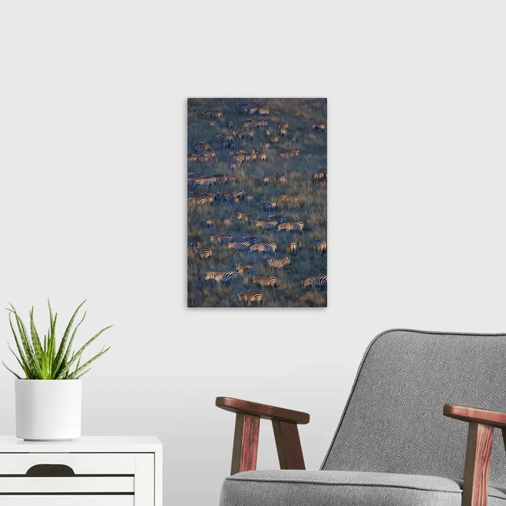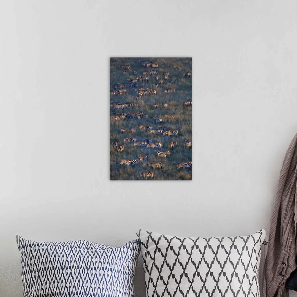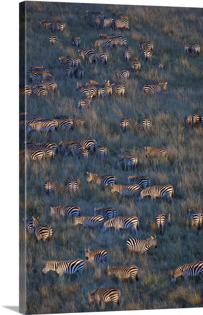 Herd of zebras grazing in a field, Masai Mara National Reserve, Kenya (Equus burchelli chapmani) wall art for home and office decor. Discover canvas art prints, photos, mural, big canvas art and framed wall art in GreatBigCanvas.com's varied collections.