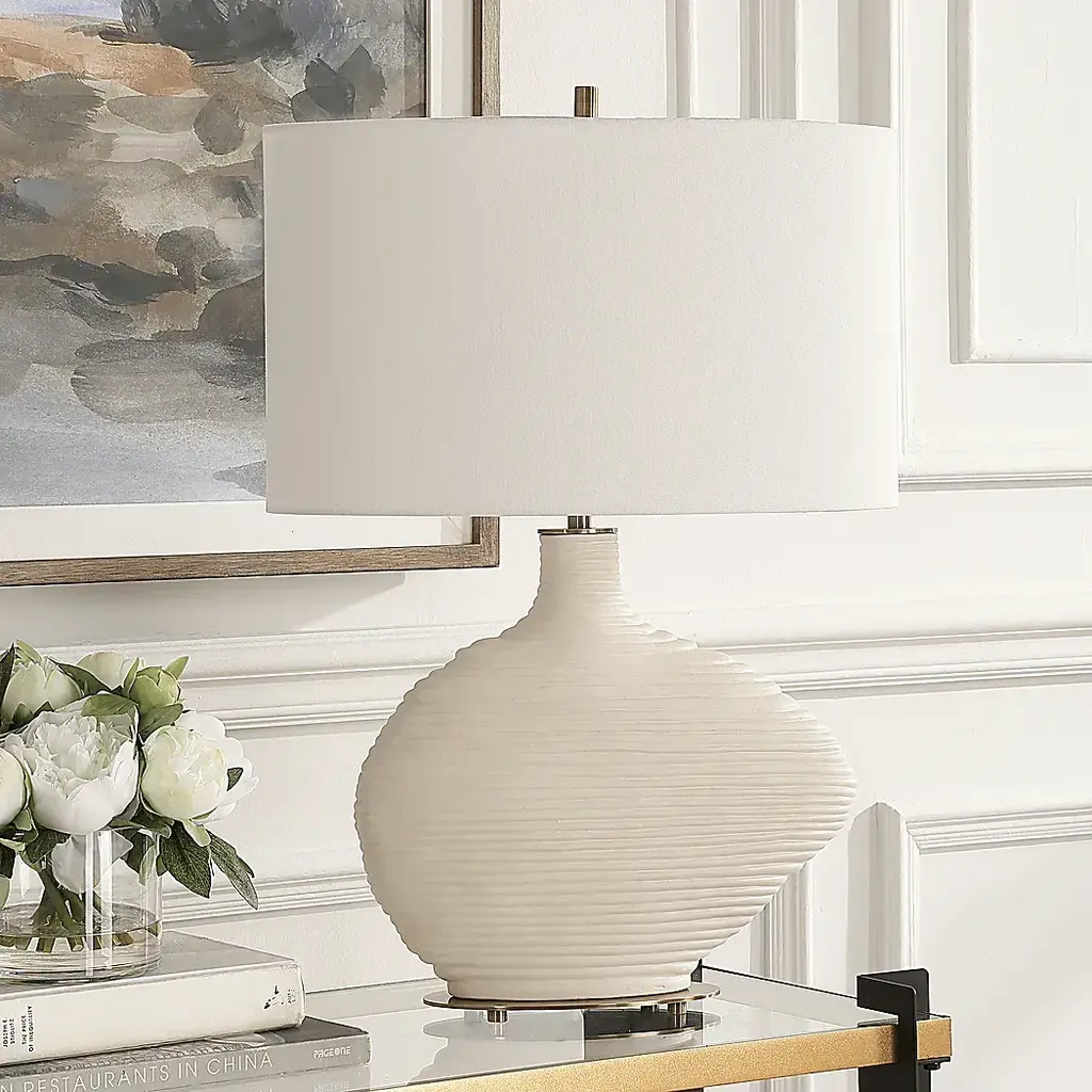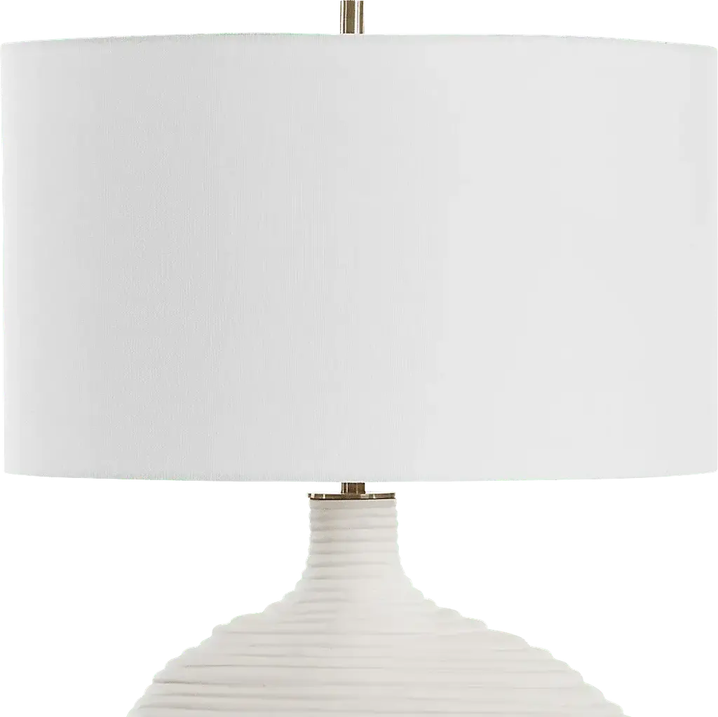 The Hereford Cave White Lamp is crafted with care from high-quality ceramic with a warm white finish, paired with antique brass plated details. The organically shaped silhouette and stacked ring design creates a visual appeal. The oval hardback shade is an off-white linen fabric with natural slubbing. Partial assembly may be required.