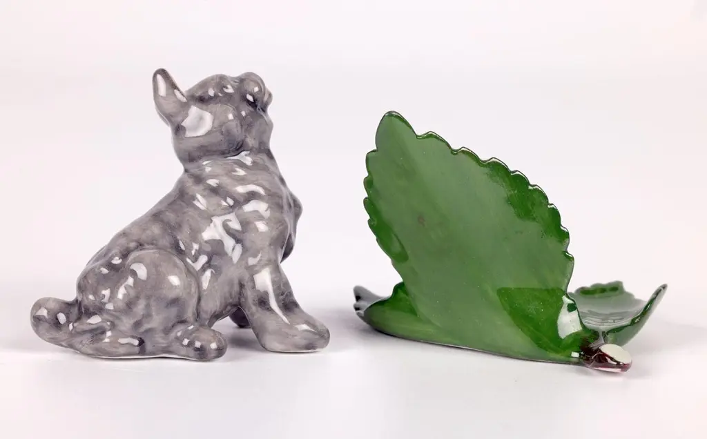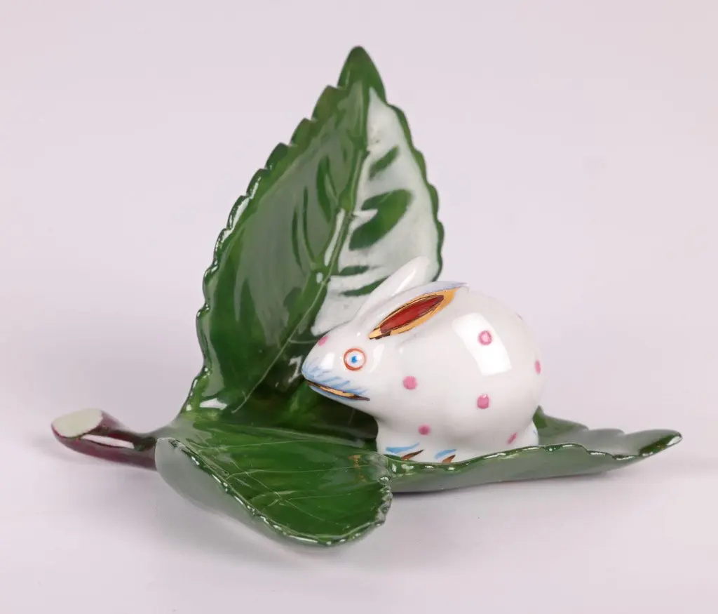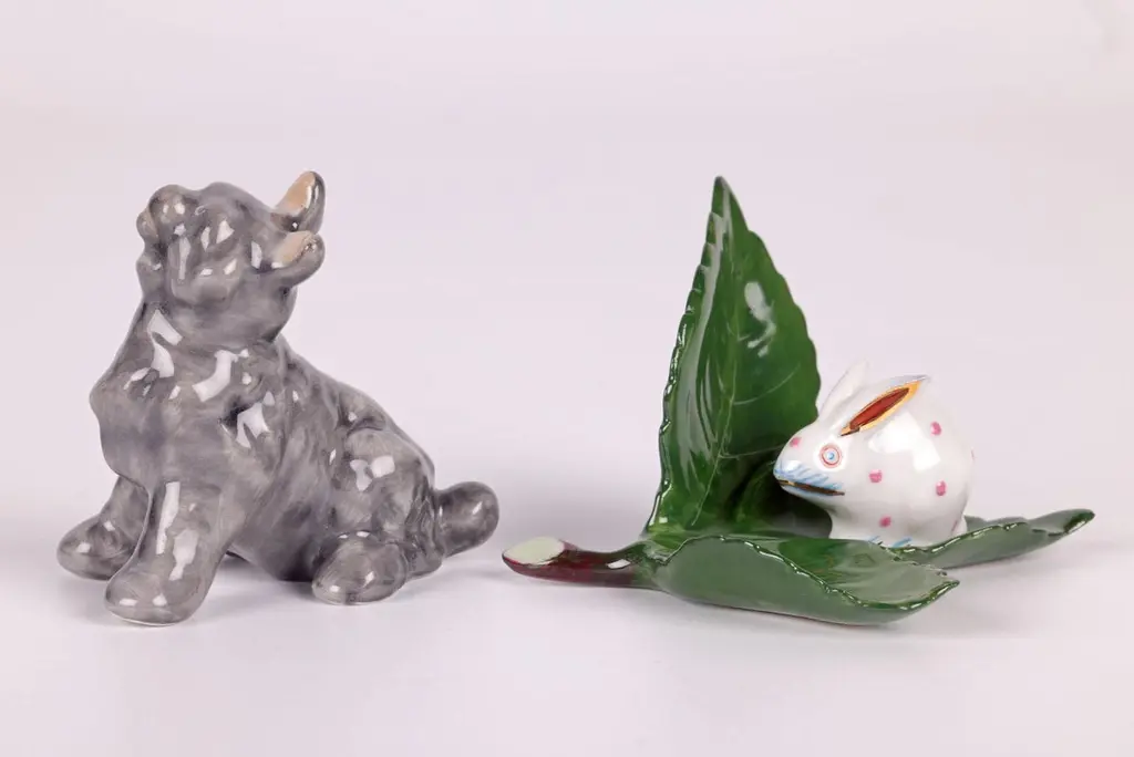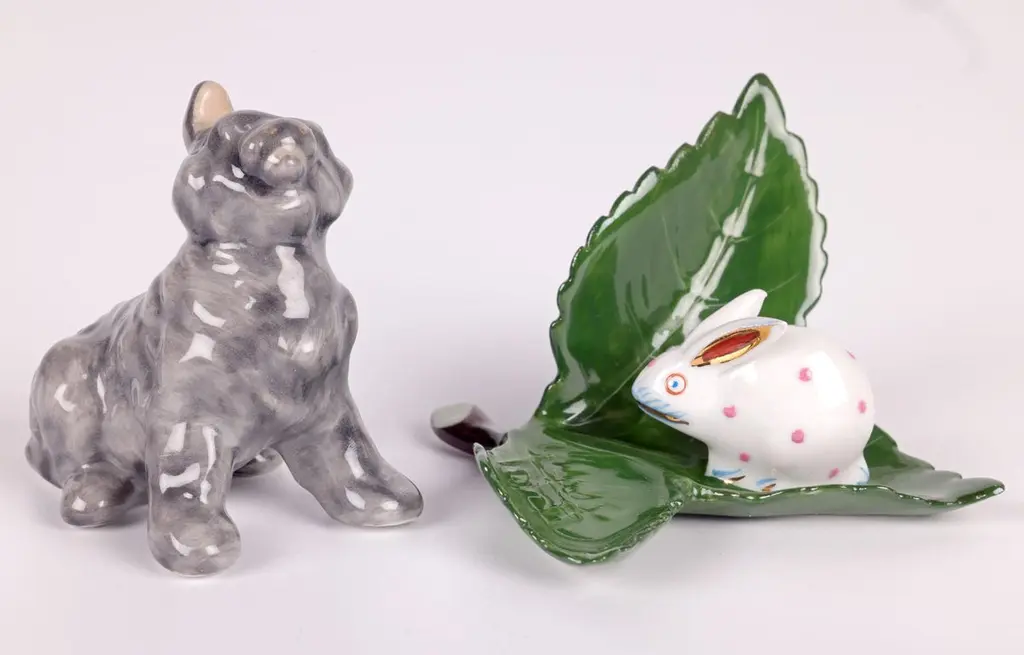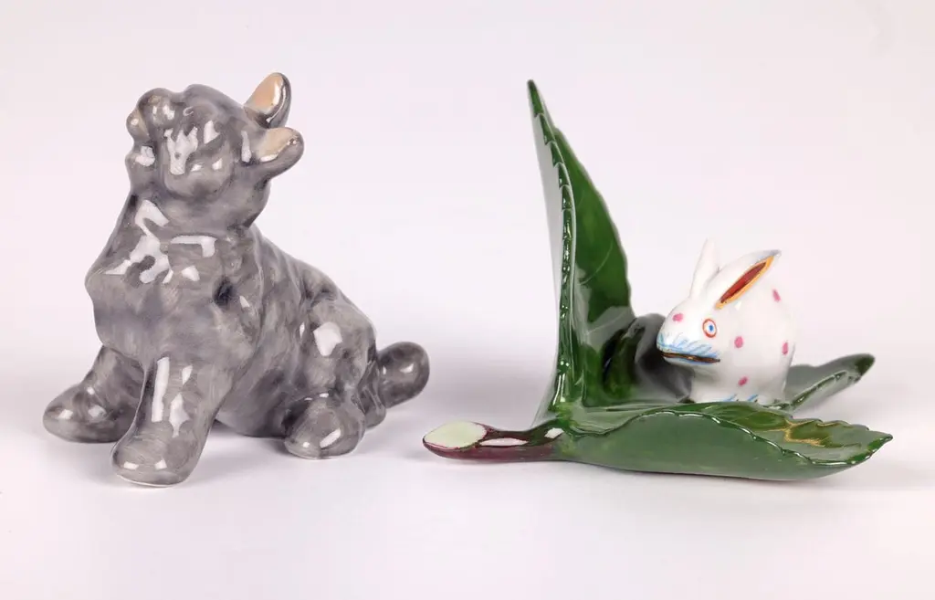 Two delightful vintage Hungarian porcelain cabinet collector pieces comprising of a seated terrier dog and a rabbit on a leaf both made by Herend and dating from the 20th century. Both small figures are well made with the terrier seated and holding its head up. It has molded features and is decorated in mottled grey glazes with lighter colors applied to the ears and simple painted shadow detail to the eyes and mouth. The rabbit sits on a small twig with three large leaves, one raised above the rabbit. The twig is painted in brown with detailed molding to the leaves which are painted in green. The small novelty style rabbit sits crouched with semi raised ears and eye and mouth features and is decorated with small pink dots on a white ground with similarly painted eyes and painted mouth with gilded highlights to both inner ears. Both figures have makers marks along with various numbers to the bases.Provenance: Acquired from the British Art Market.In good condition with light wear associated with age and use.