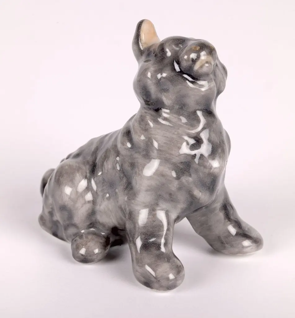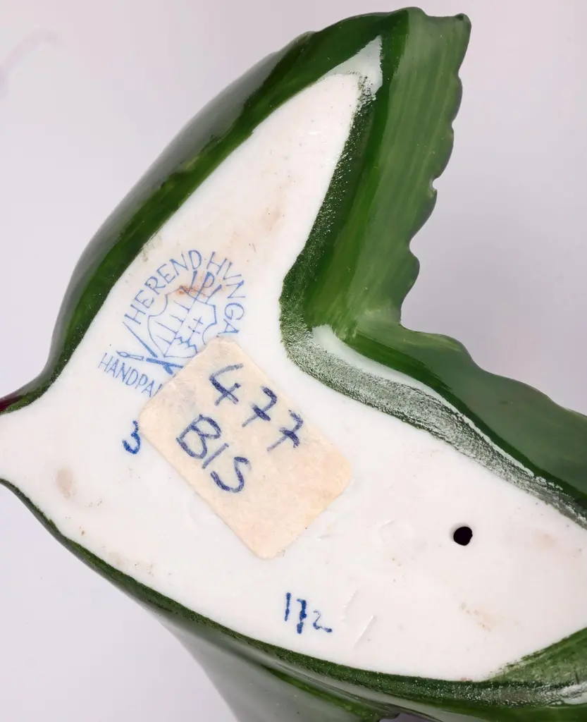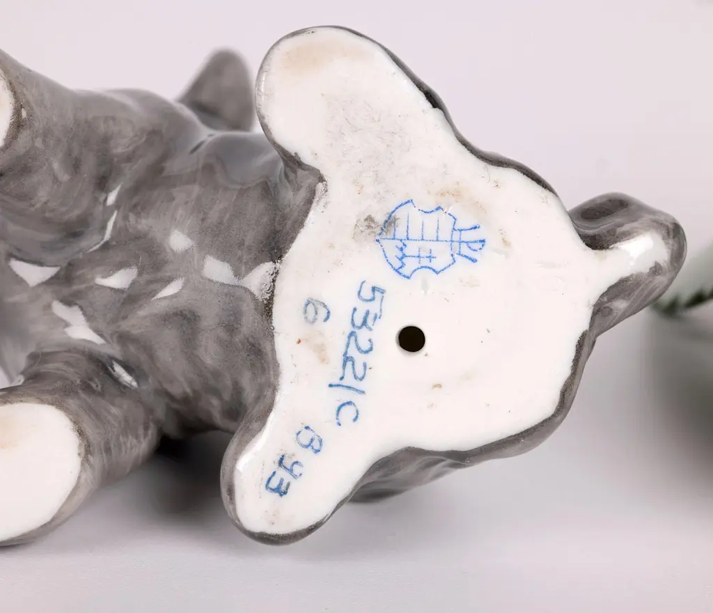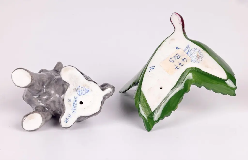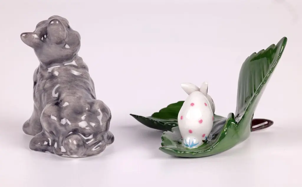 Two delightful vintage Hungarian porcelain cabinet collector pieces comprising of a seated terrier dog and a rabbit on a leaf both made by Herend and dating from the 20th century. Both small figures are well made with the terrier seated and holding its head up. It has molded features and is decorated in mottled grey glazes with lighter colors applied to the ears and simple painted shadow detail to the eyes and mouth. The rabbit sits on a small twig with three large leaves, one raised above the rabbit. The twig is painted in brown with detailed molding to the leaves which are painted in green. The small novelty style rabbit sits crouched with semi raised ears and eye and mouth features and is decorated with small pink dots on a white ground with similarly painted eyes and painted mouth with gilded highlights to both inner ears. Both figures have makers marks along with various numbers to the bases.Provenance: Acquired from the British Art Market.In good condition with light wear associated with age and use.