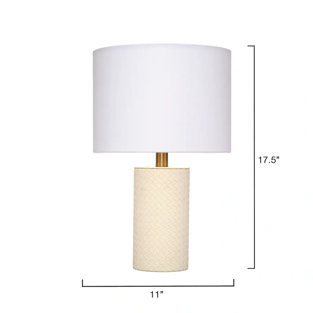 Expertly woven strips of top-quality leather completely cover the base of these sophisticated table lamps. The rich leather harmonizes beautifully with the clean white linen drum shade, while the neck features a burnished antique brass finish. Inspired by Italian fashion, these lamps make the perfect accent for any urban pied-à-terre. •Polyresin Frame Hand-wrapped in Leather•100% White Linen Drum Rolled Edge Shade•Hand Woven Leather•Antique Brass Neck•UNO Socket; No Harp/FinialThe inherent variations in tone and texture of leather is preserved, to create pieces rich in detail and natural beauty. These unique imperfections give our products character and individuality, with each piece having its own personality. These unique imperfections and variations are what define our products, with each piece having its own personality. •Lamp Body Dimensions: 8"H x 4.5"W x 4.5"D• Shade Dimensions: 8"H x 11"W x 11"D• 1 (A19)bulb required; Bulb Not Included• 60 Max Wattage' Volts 110• E26 Bulb Base Type • 8 FT Silver Cord• Switch on Cord• Protective Black Felt• Not Damp Rated We do not recommend using harsh or abrasive cleaners at anytime as they can damage product. Wipe surfaces gently with a soft, dry cloth. If needed, you may use a lightly damp cloth with water only on base.