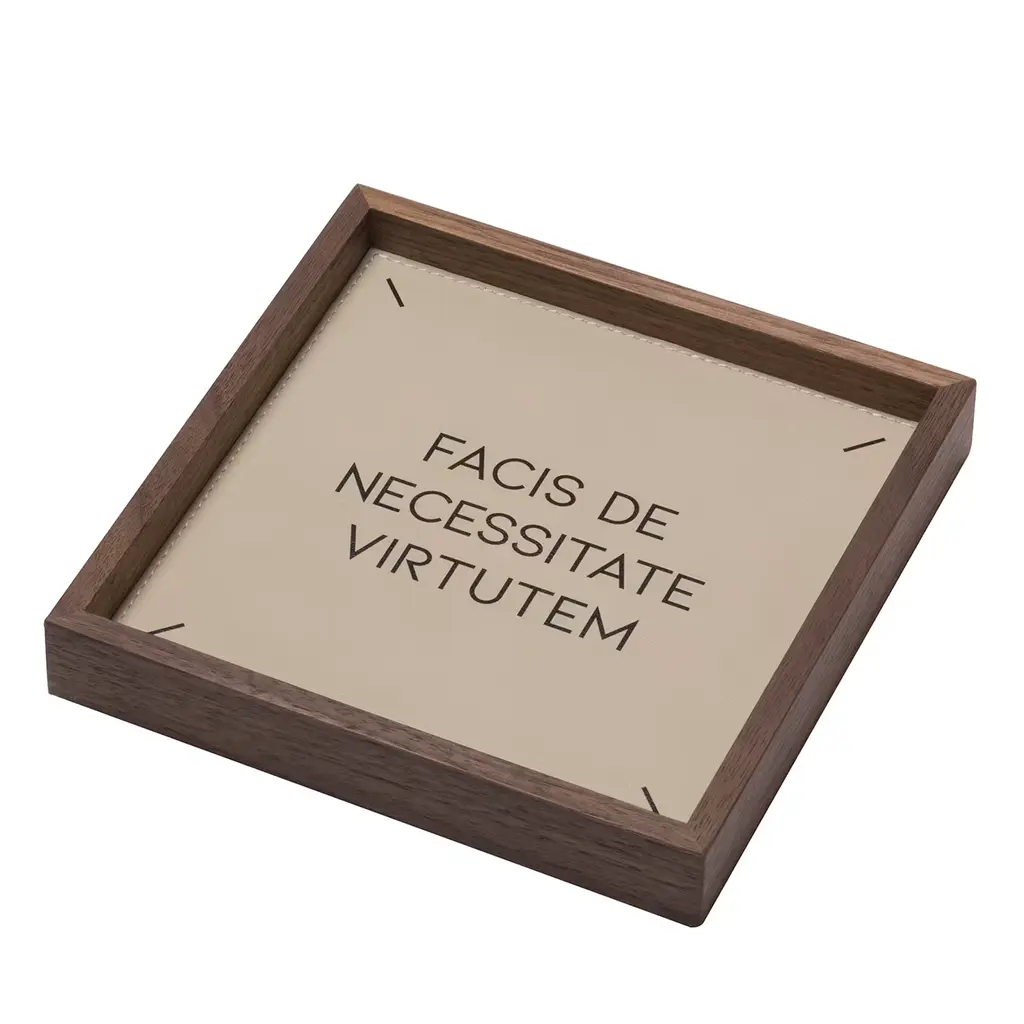 Showcasing ancient mottos taken from the Latin tradition, the Heritage collection features walnut and wenge wood valet trays with printed leather lining. Heritage valet trays' essential geometric shapes make them ideal for any environment while enhancing the quality and charming naturality of materials. Find the translation in different languages at the back of the valet trays.