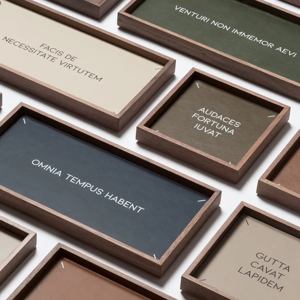 Showcasing ancient mottos taken from the Latin tradition, the Heritage collection features walnut and wenge wood valet trays with printed leather lining. Heritage valet trays' essential geometric shapes make them ideal for any environment while enhancing the quality and charming naturality of materials. Find the translation in different languages at the back of the valet trays.