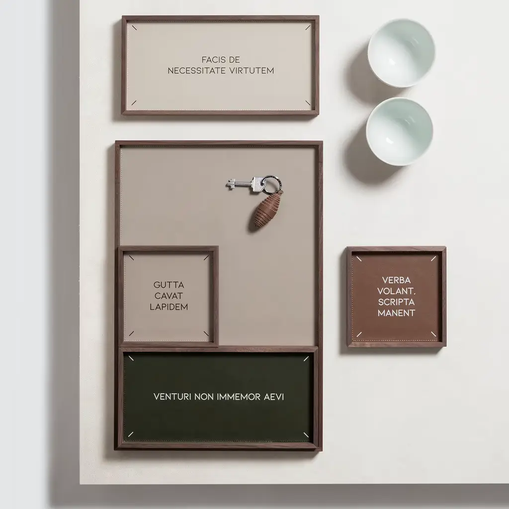 Showcasing ancient mottos taken from the Latin tradition, the Heritage collection features walnut and wenge wood valet trays with printed leather lining. Heritage valet trays' essential geometric shapes make them ideal for any environment while enhancing the quality and charming naturality of materials. Find the translation in different languages at the back of the valet trays.