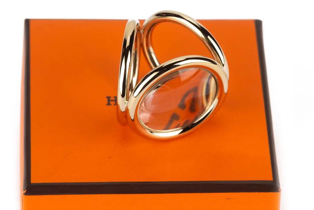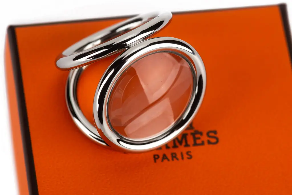 Try new scarf-wearing techniques with this small accessory that glides intuitively onto your scarf! The glass provides approximately two times magnification, allowing you to discover the rich details of your scarf design. Comes with booklet, original pouch and box. Scarf in photos not included.