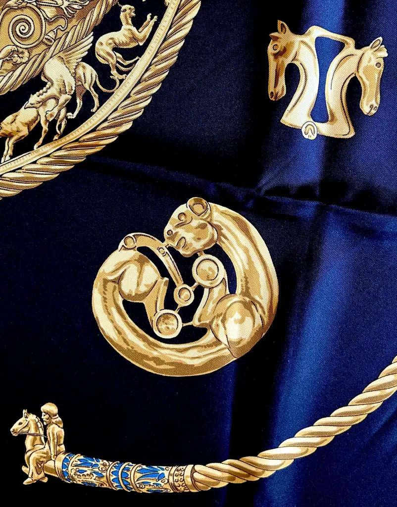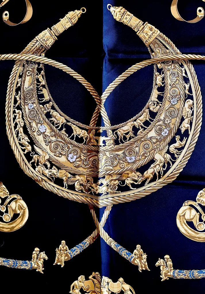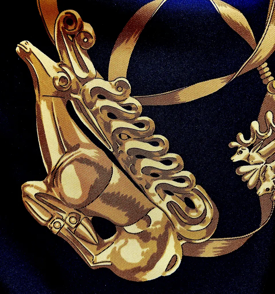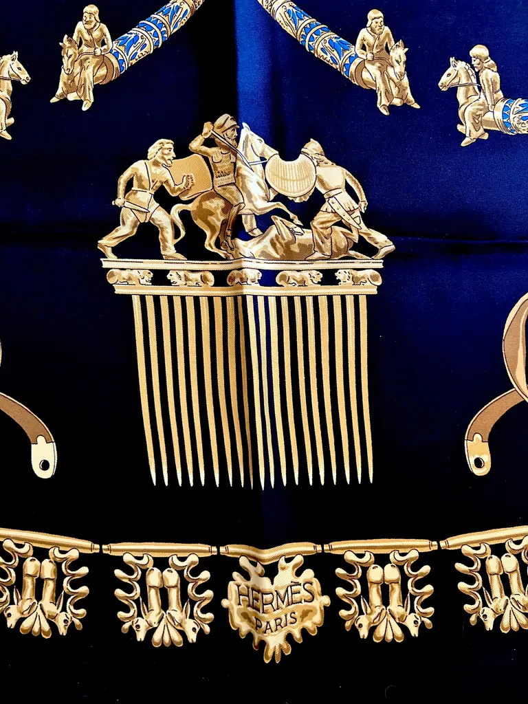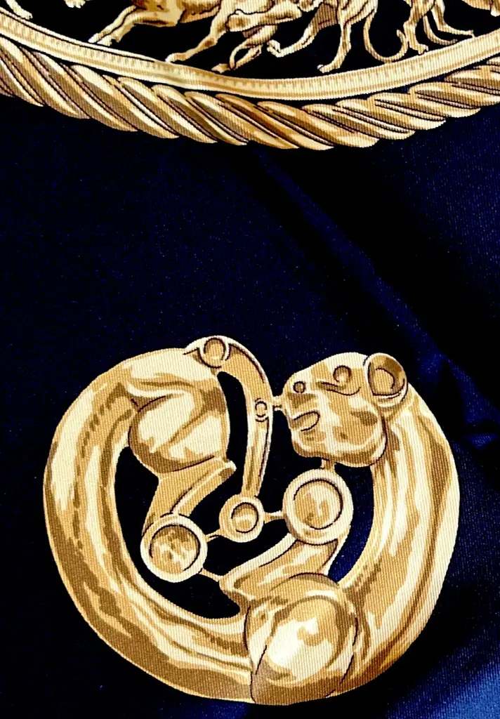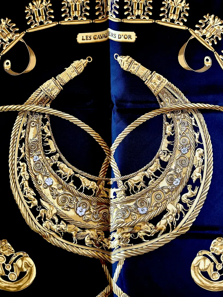 Hermès Les Cavaliers d'Or scarf features golden jeweled treasures in intricate détail. Designed by Dimitri Rybaltchenko in 1975, this scarf, in a classic jet back and gold colorway, is from a more recent issue.