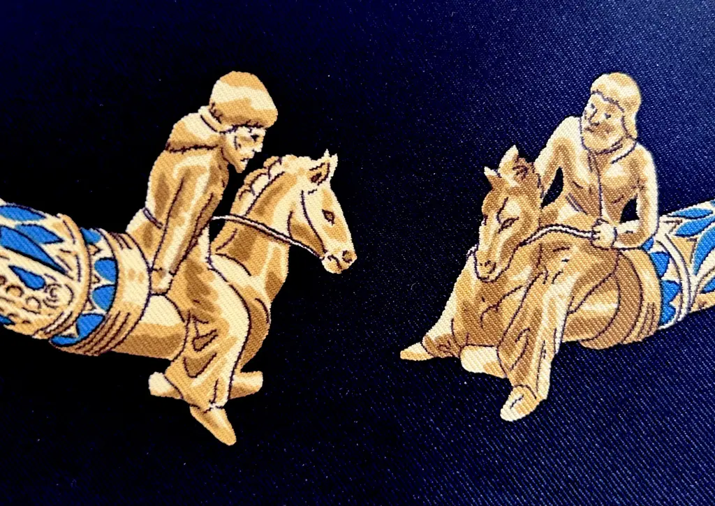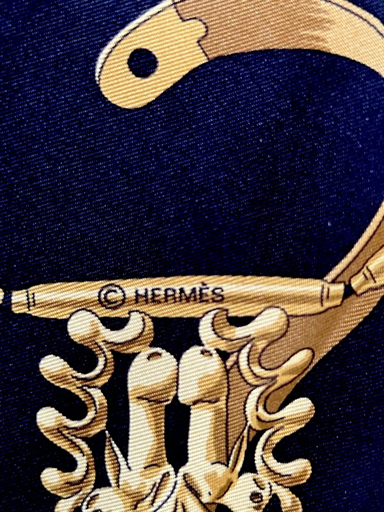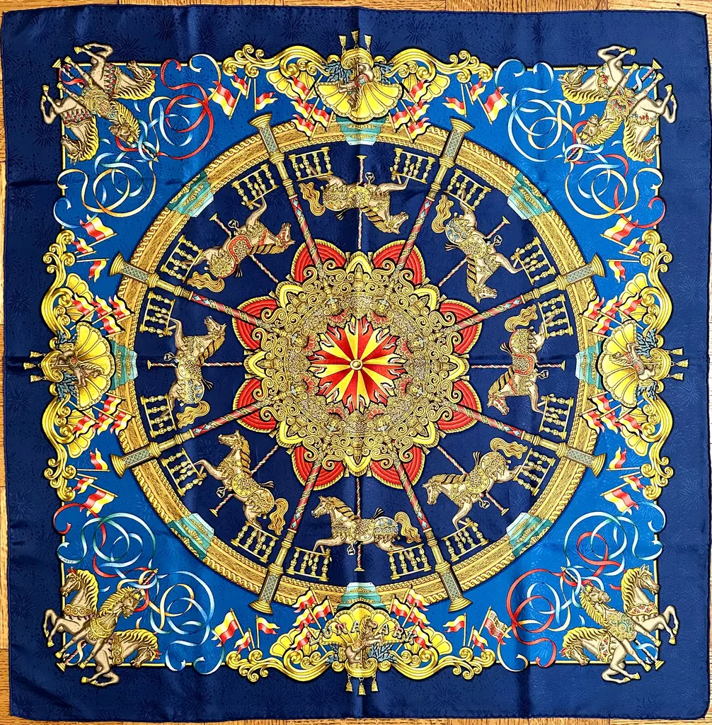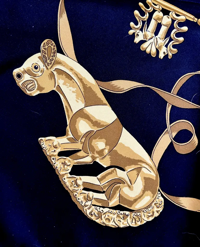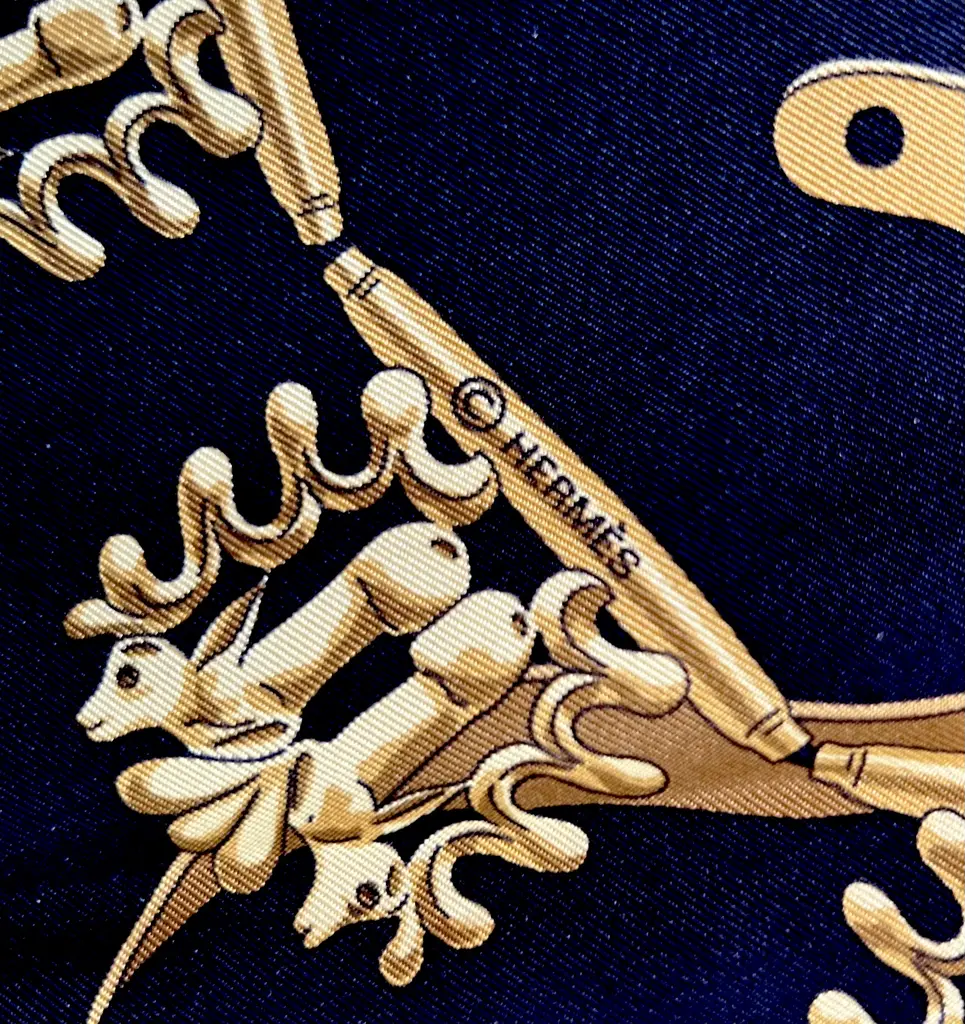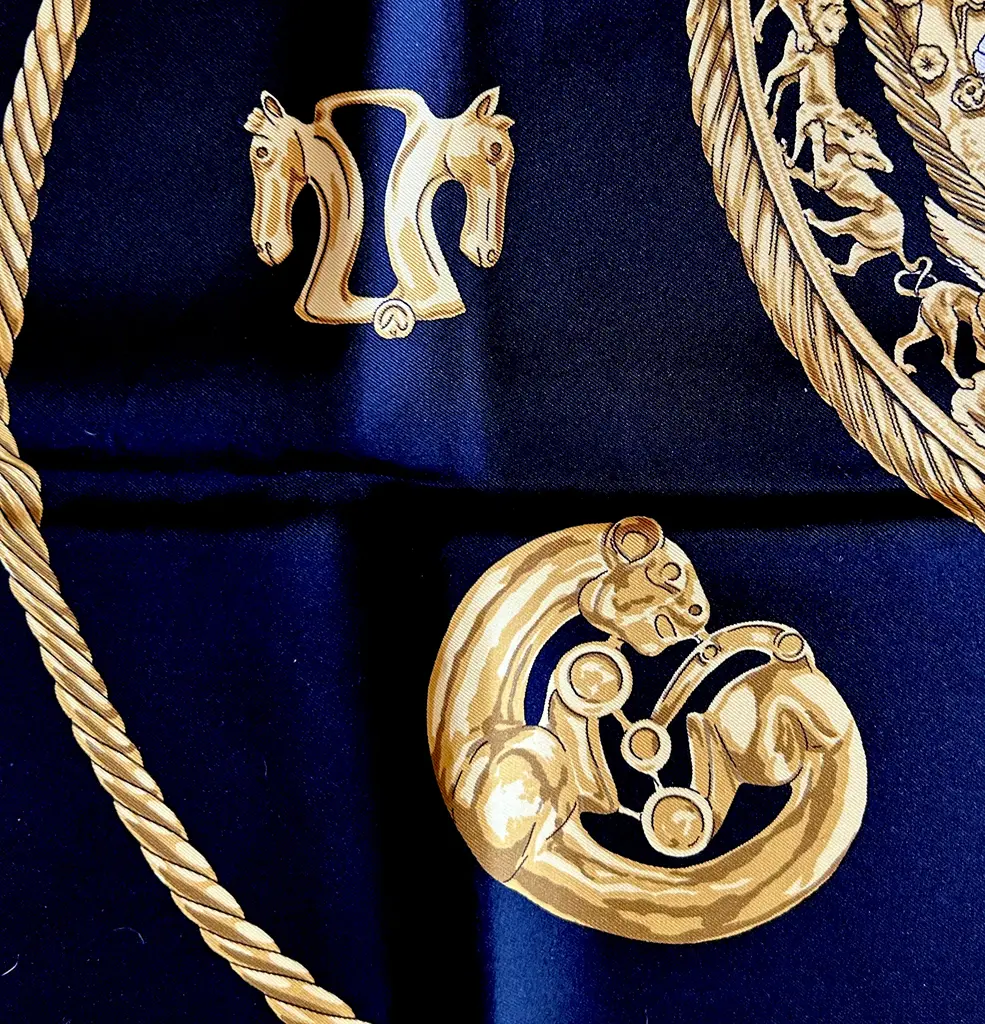 Hermès Les Cavaliers d'Or scarf features golden jeweled treasures in intricate détail. Designed by Dimitri Rybaltchenko in 1975, this scarf, in a classic jet back and gold colorway, is from a more recent issue.