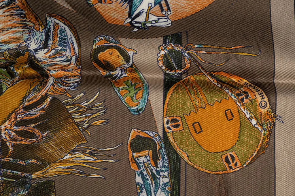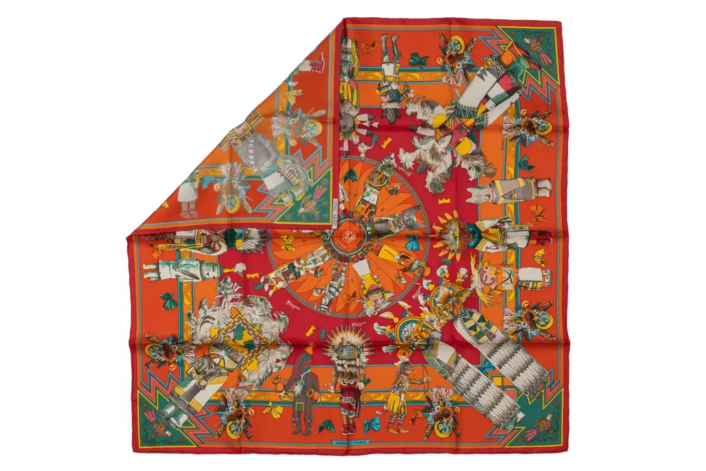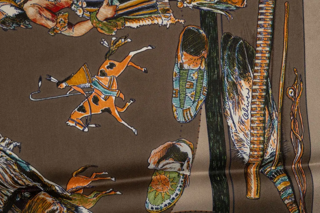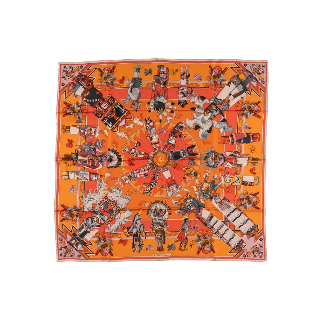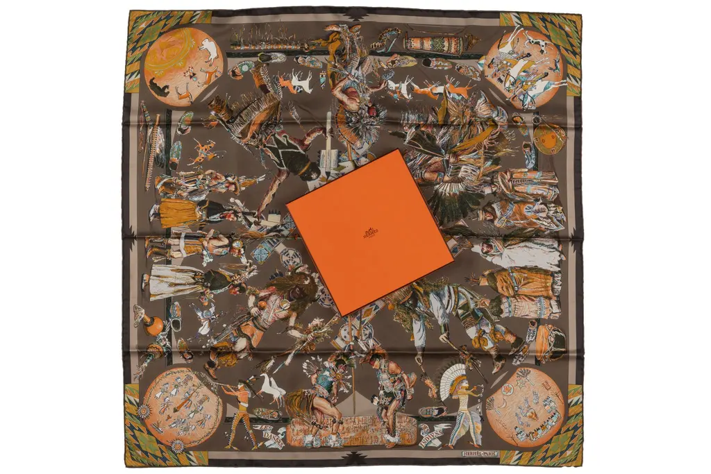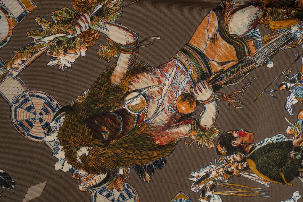 This Hermès "Les Danses Des Indiens" or The Indian Dances, features the ritual dances of various Indian tribes. The scarf was designed by American artist Kermit Oliver in 1999. No tag. Comes with original box.