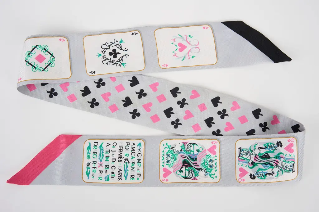 This Herm��s Jeu de Cartes Twilly in Gris, Rose, and Black is made from 100% silk. Featuring a playful card design it is playfully perfect. It can be worn in different ways with a slide medor in palladium hardware. Comes with original box. Brand new.