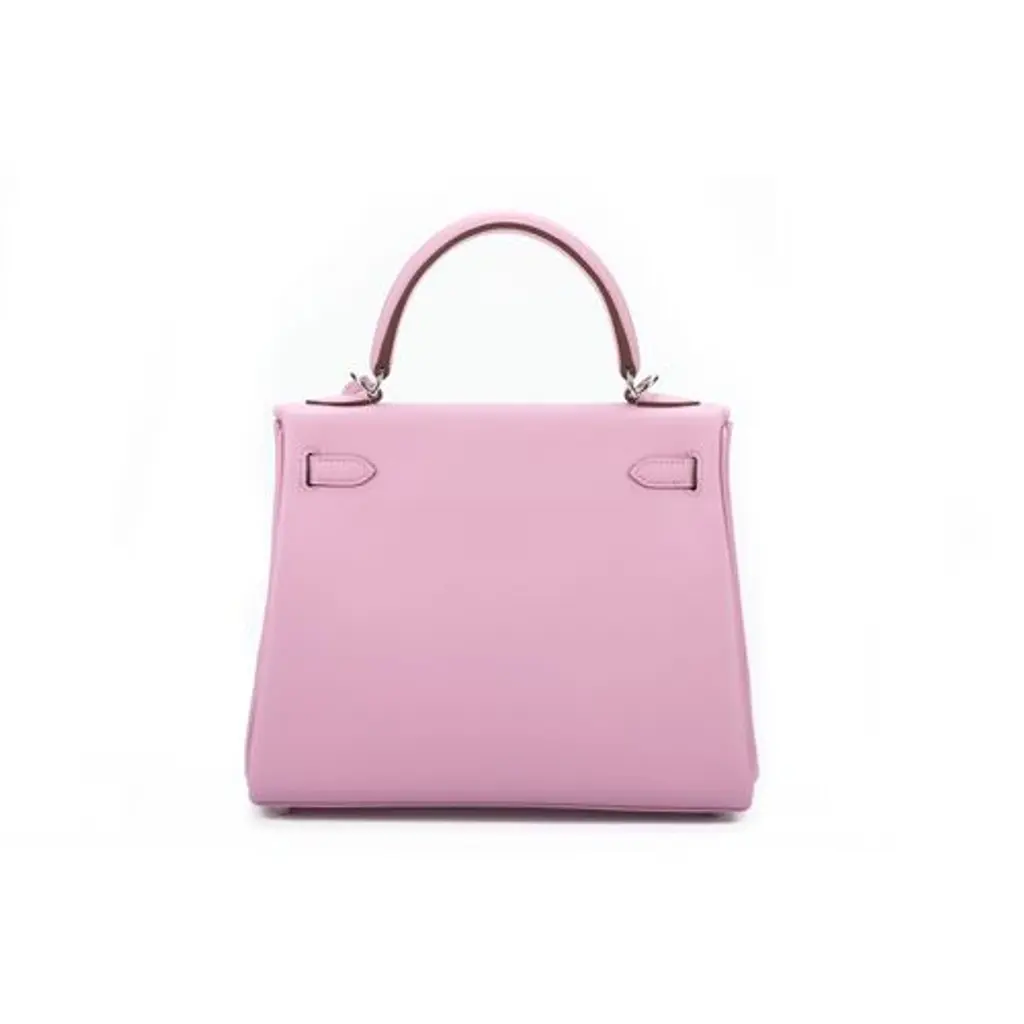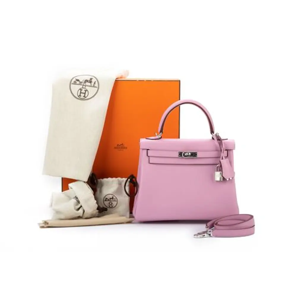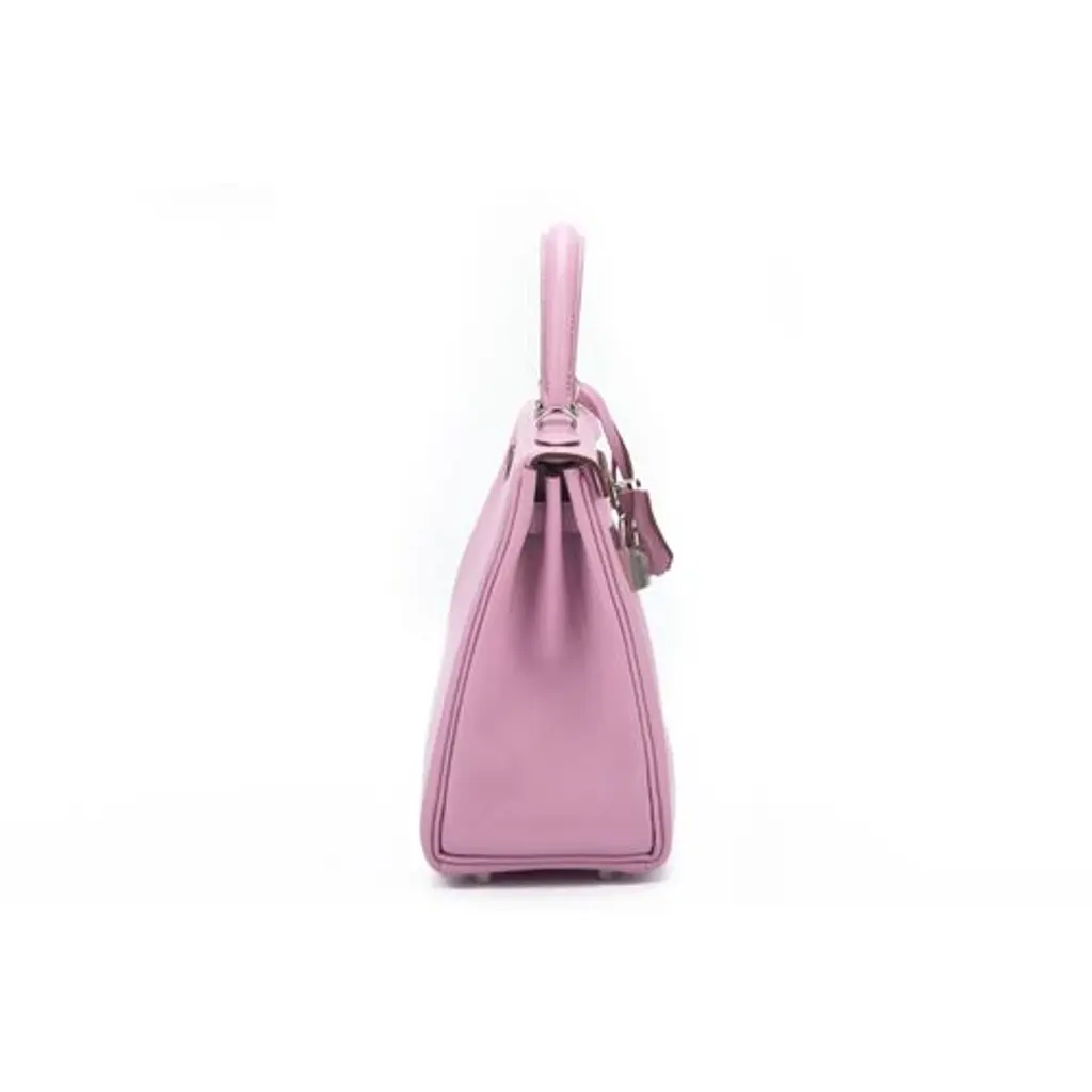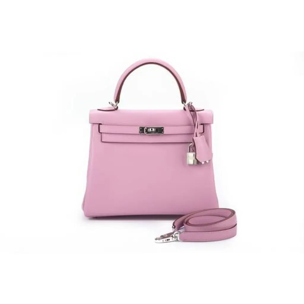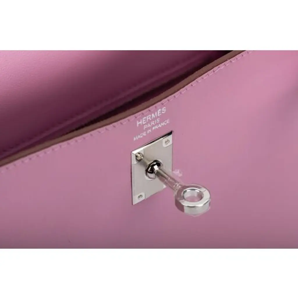 New in box Hermes rare Kelly 25 cm retourne. Mauve silvestre swift leather and palladium hardware . Date stamp U for 2022. Detachable strap. Handle drop 3". Comes with dust cover, clochette, tirette, 2 keys, booklet, rain cover, dust bag and original box.