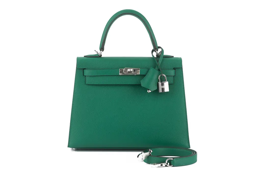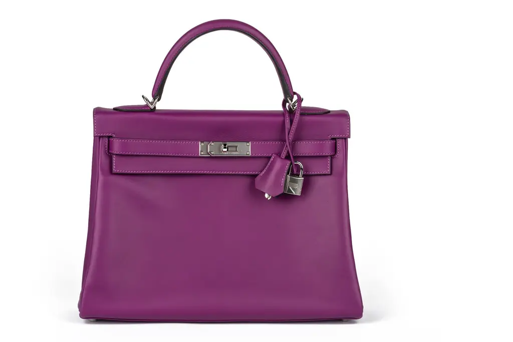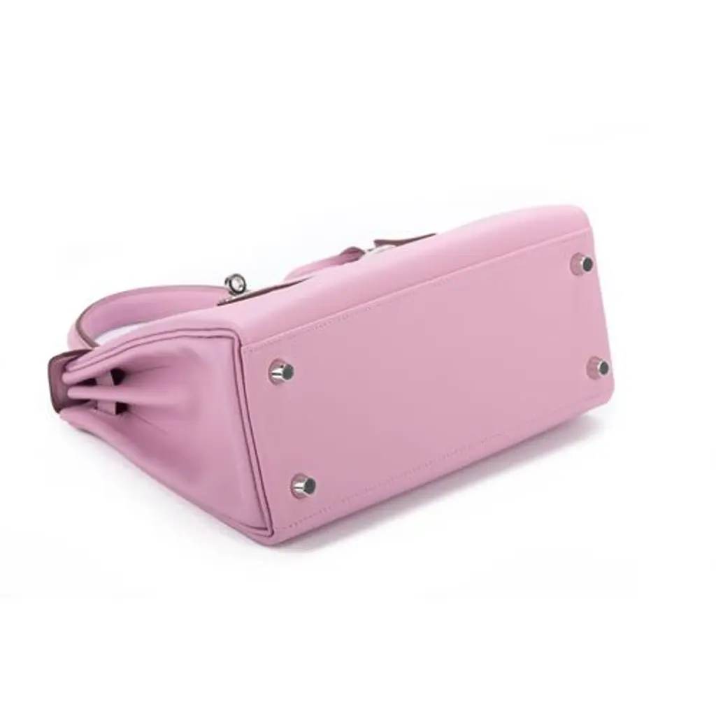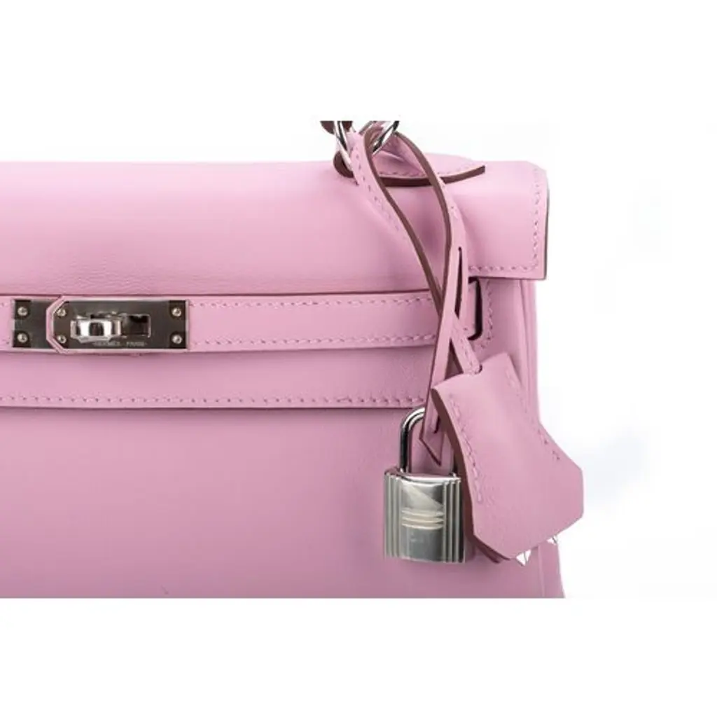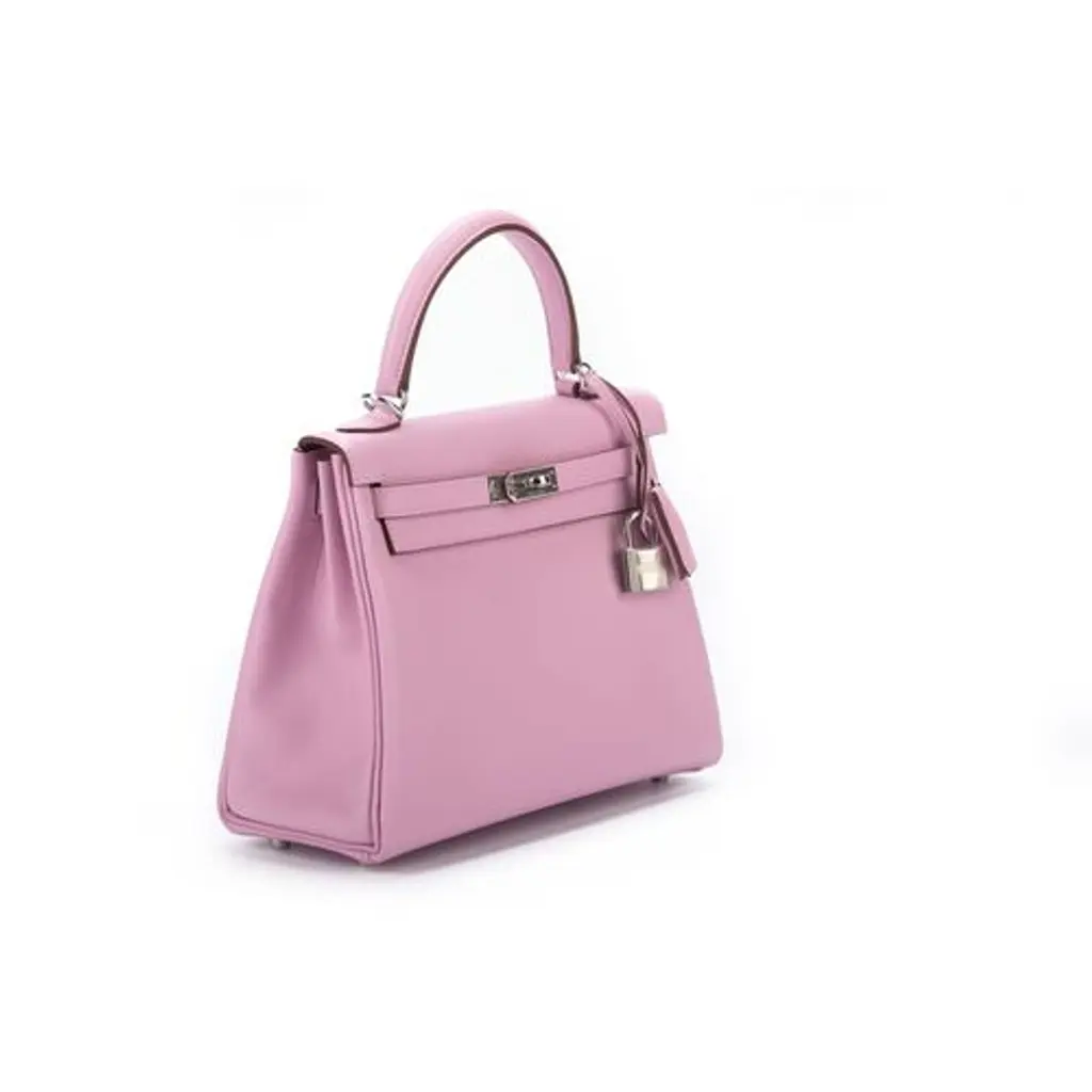 New in box Hermes rare Kelly 25 cm retourne. Mauve silvestre swift leather and palladium hardware . Date stamp U for 2022. Detachable strap. Handle drop 3". Comes with dust cover, clochette, tirette, 2 keys, booklet, rain cover, dust bag and original box.
