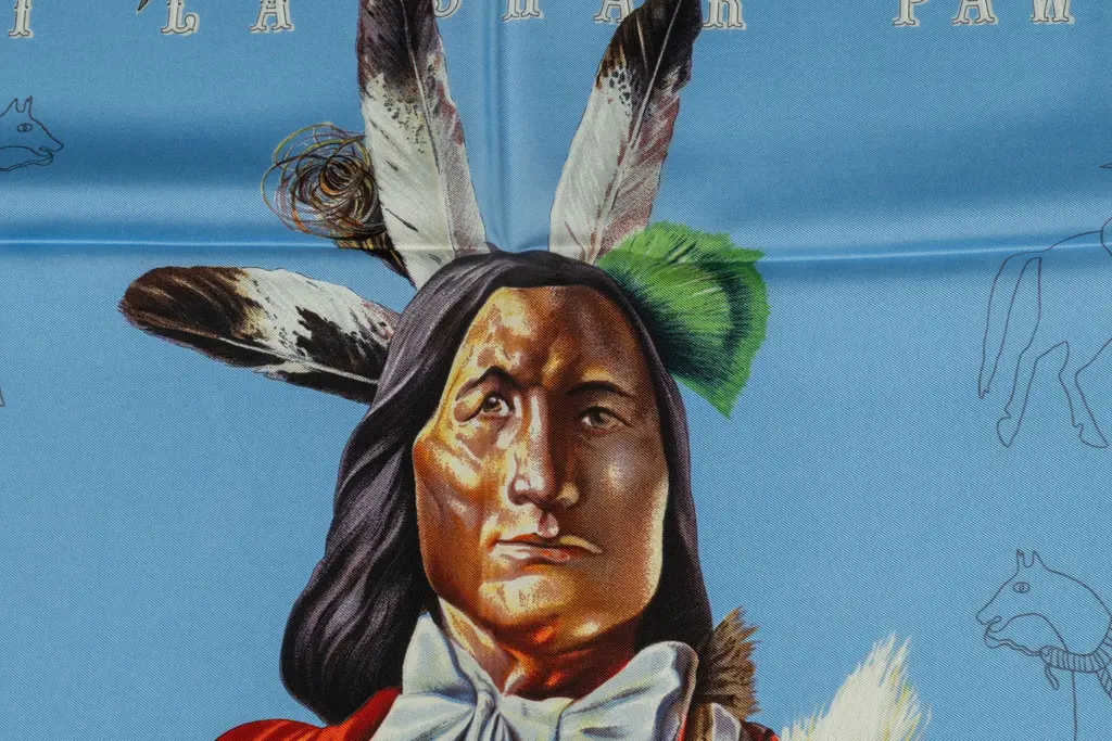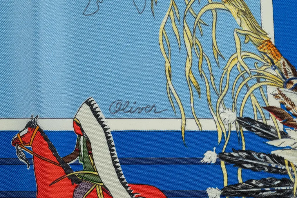 This Herm��s "Pani La Shar Pawnee" Scarf in blue, features hand-rolled edges. Original design by Kermit Oliver depicting the Pawnee chief, native american tribe from Nebraska.