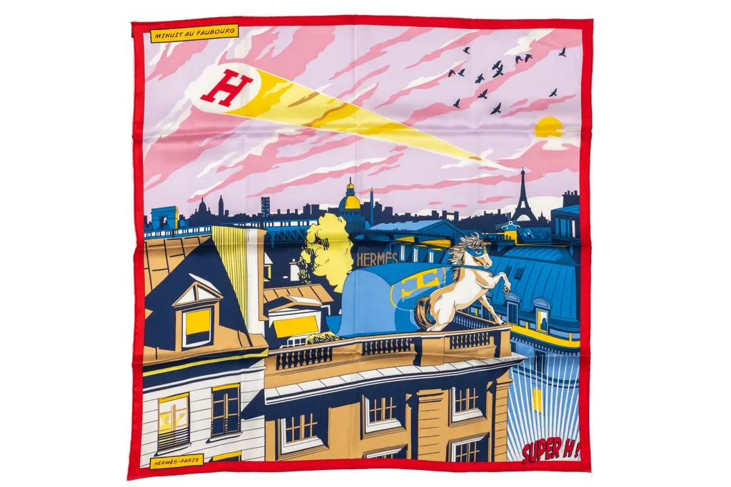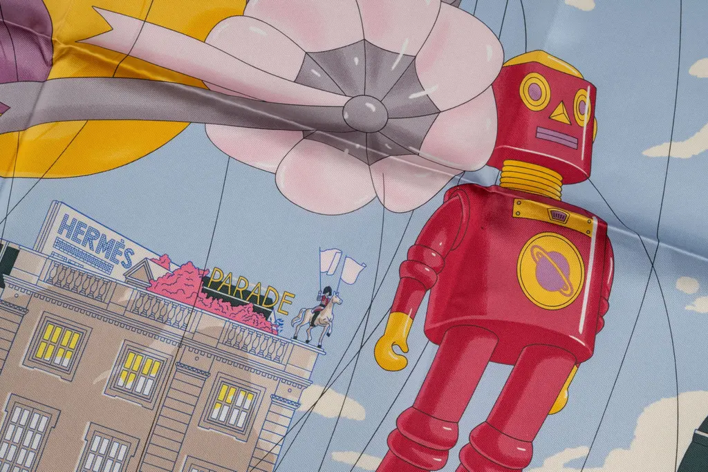 This Hermès Parade Scarf is in silk twill with hand-rolled edges (100% silk). Designed by Jonathan Burton. Brand new in unused condition. Comes with ribbon and original box.