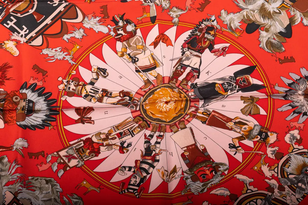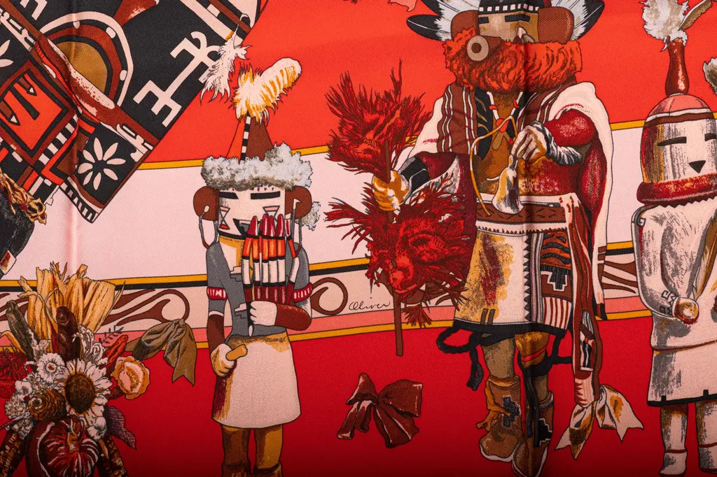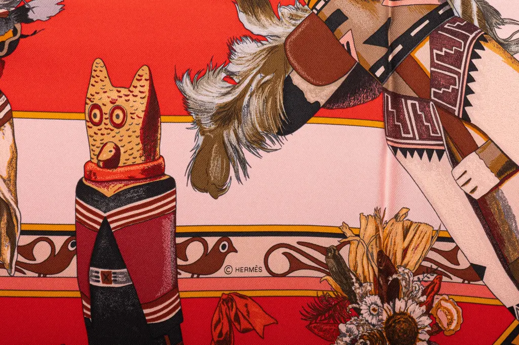 Hermès collectible Kachinas red coral silk scarf . Designed by Kermit Oliver. Hand rolled edges.