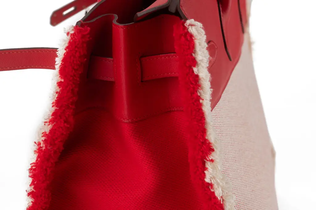 This Hermès Swift Twill H Fray Fray Birkin 35 is crafted of white and dark pink canvas, with matching fringe and dark pink leather trim. The handbag features signature closure straps and turn lock palladium silver hardware and rolled top handles. The spacious interior has zipper and patch pockets. Comes with certificate of authenticity, booklet, felt, original dustcover and box. First letter Z for 2021.